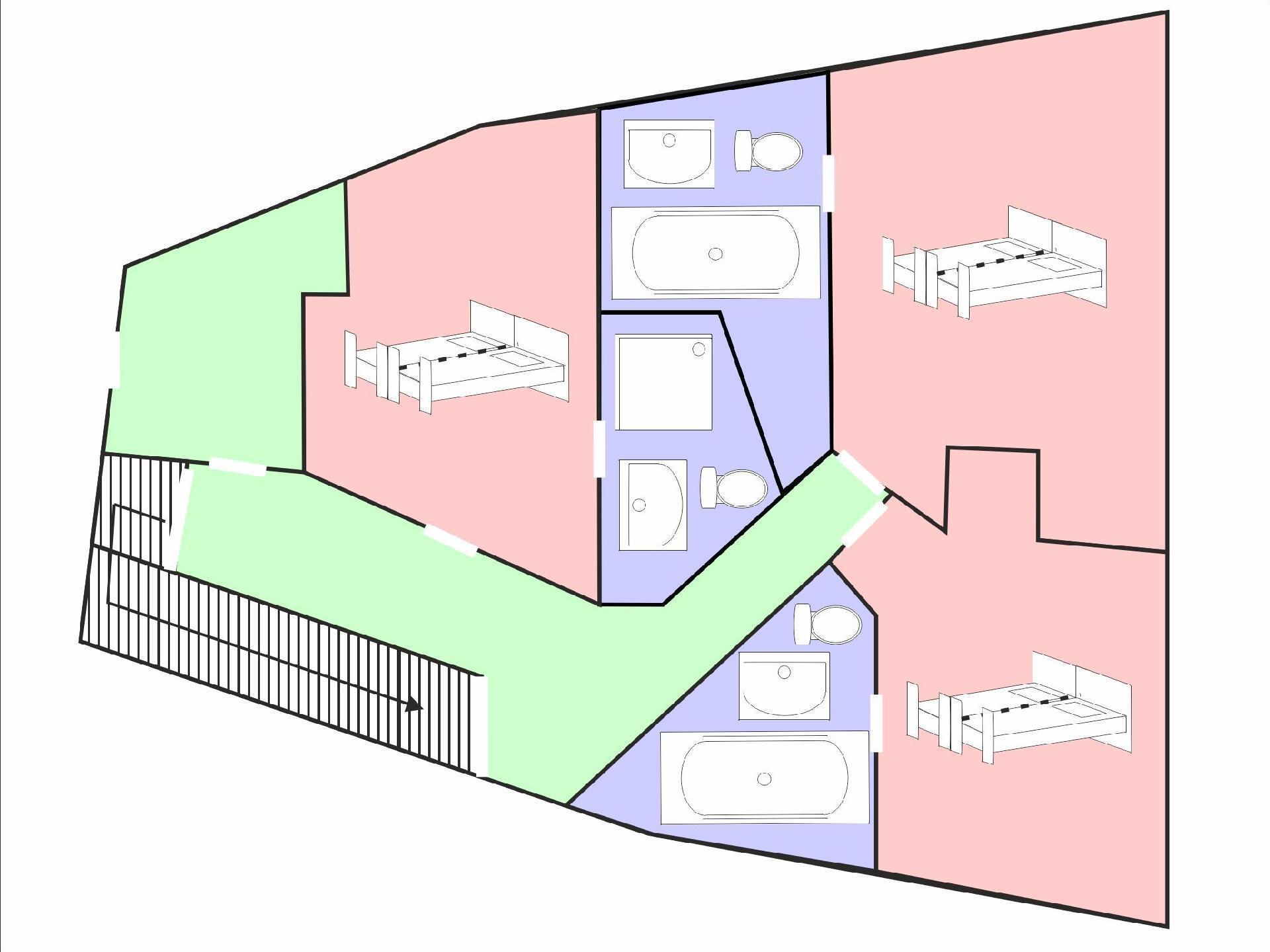 The entrance area and 3 bedrooms, each with two single beds and TV, are located on the first floor. All have their own en-suite bathroom, two with (bath/WC) and one with (shower/WC). The beds are 90 x 200 cm.