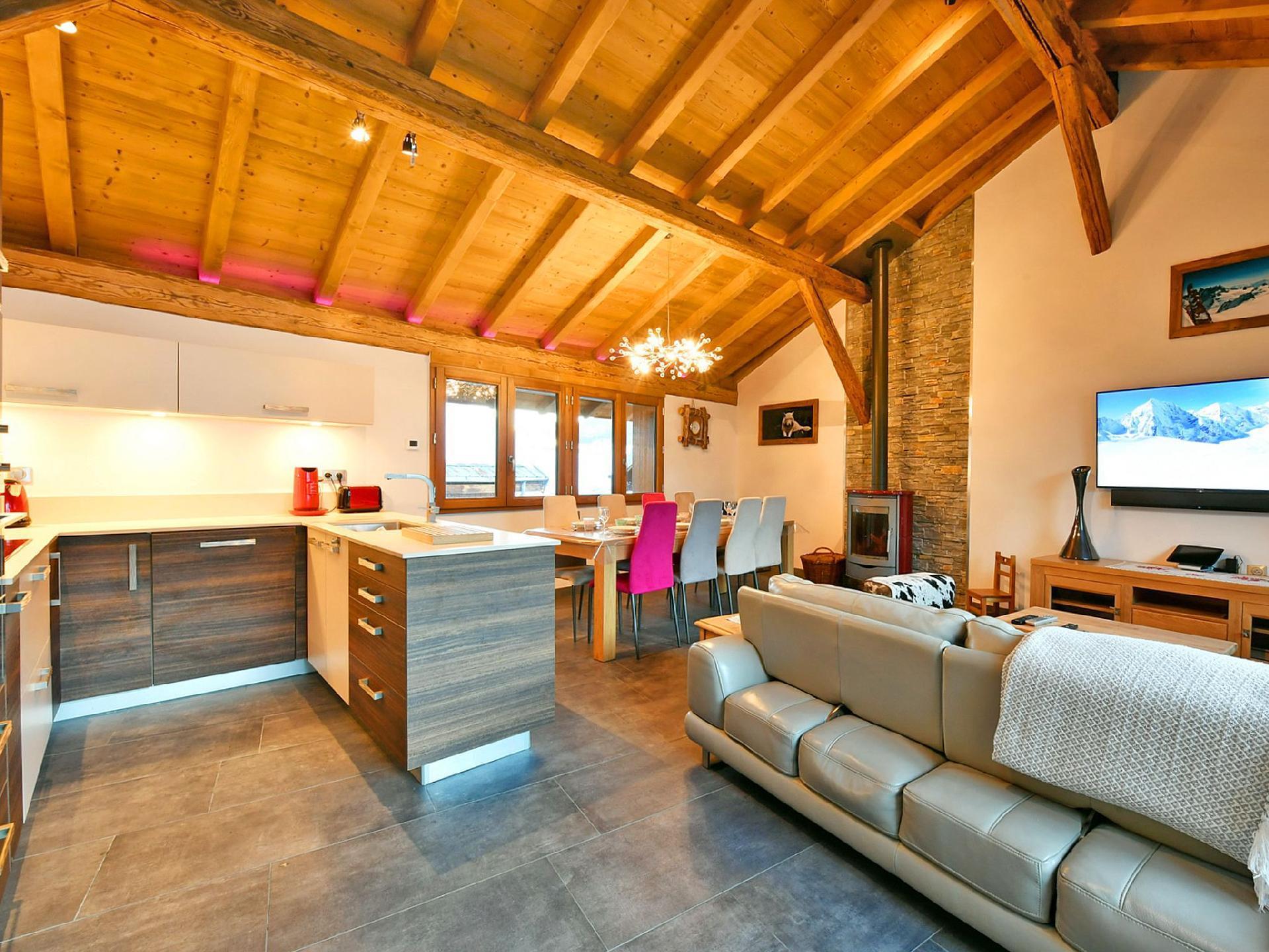 On the top floor is the cosy, inviting living and dining area with sofa corner, TV and wood-burning stove. The large table in the dining area seats 8 people comfortably. The modern kitchen is ideal for cosy cooking evenings. Access to the balcony terrace, where you will also find the whirlpool. Relax in the cosy warm water after an eventful day of skiing.