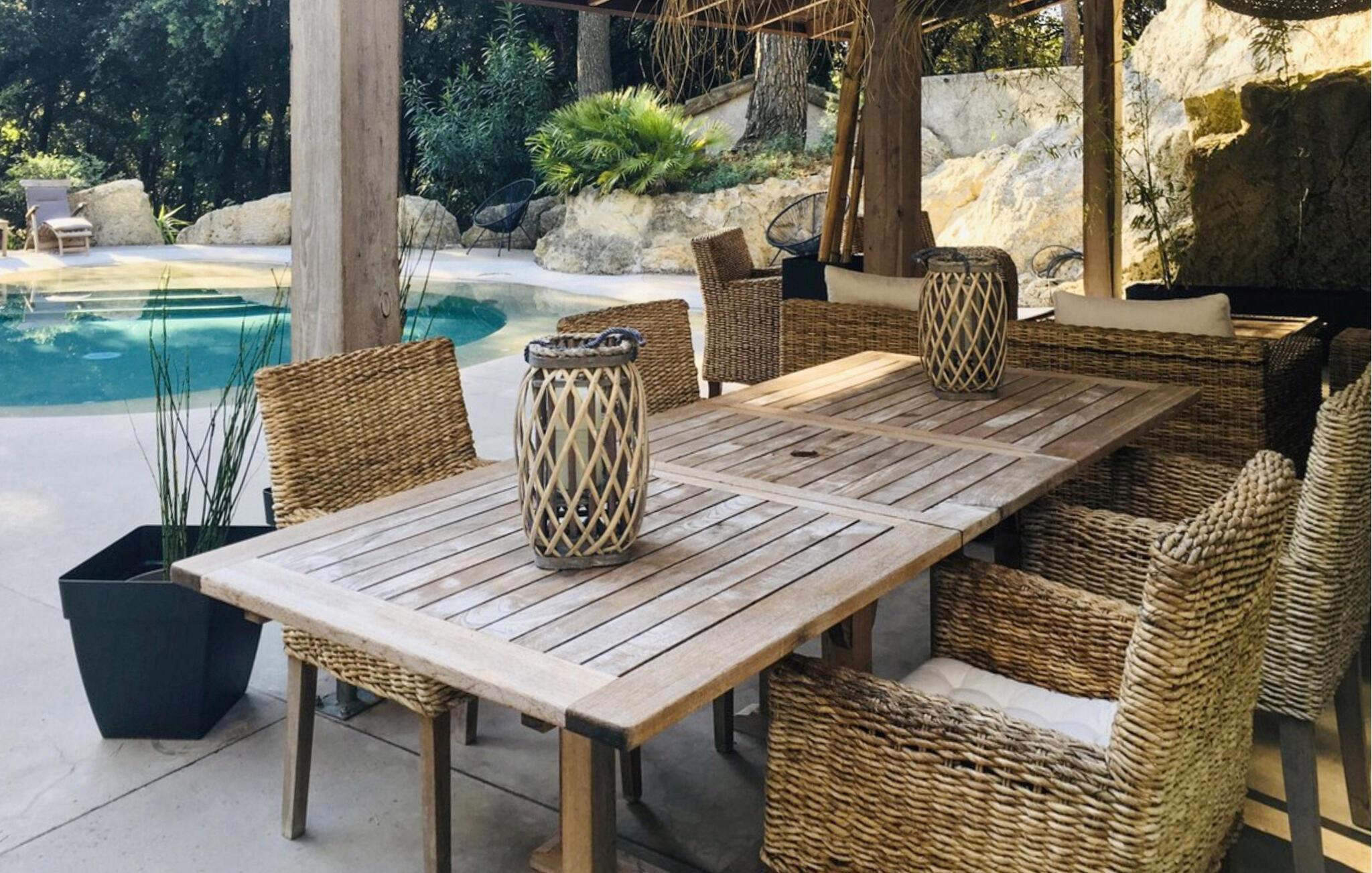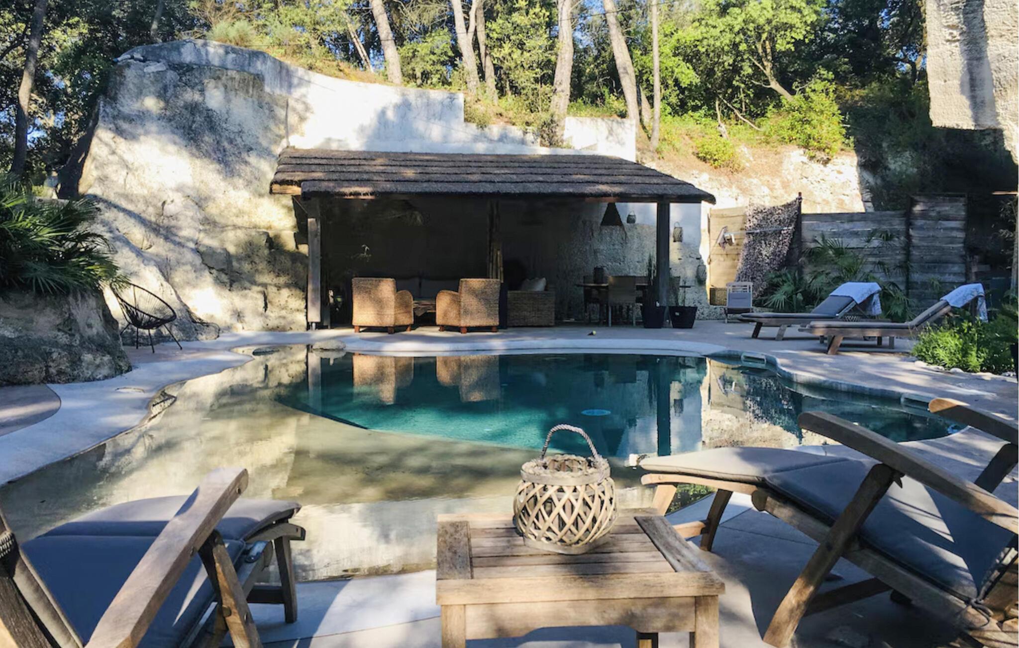 Vor den Toren von Avignon, im Dorf Les Angles, heißt Sie dieses charmante Haus in den Wäldern willkommen. Erleben Sie das kleine Paradies in einem der alten Steinbrüche, die zu den historischen Monumenten von Avignon gehören. Im Inneren heißt Sie eine hochwertige Einrichtung und liebevolle Dekoration willkommen und lädt Sie ein, sich zurückzulehnen und die Beine hochzulegen. Kochen Sie zusammen in der individuellen Küche und nehmen Ihre Mahlzeiten auf der überdachten Terrasse ein. Der Pool ist ein Unikat und bietet Ihnen mit flachen Strandeinstieg entspannten Badespaß. Verweilen Sie im großen Garten und genießen das private Ambiente.