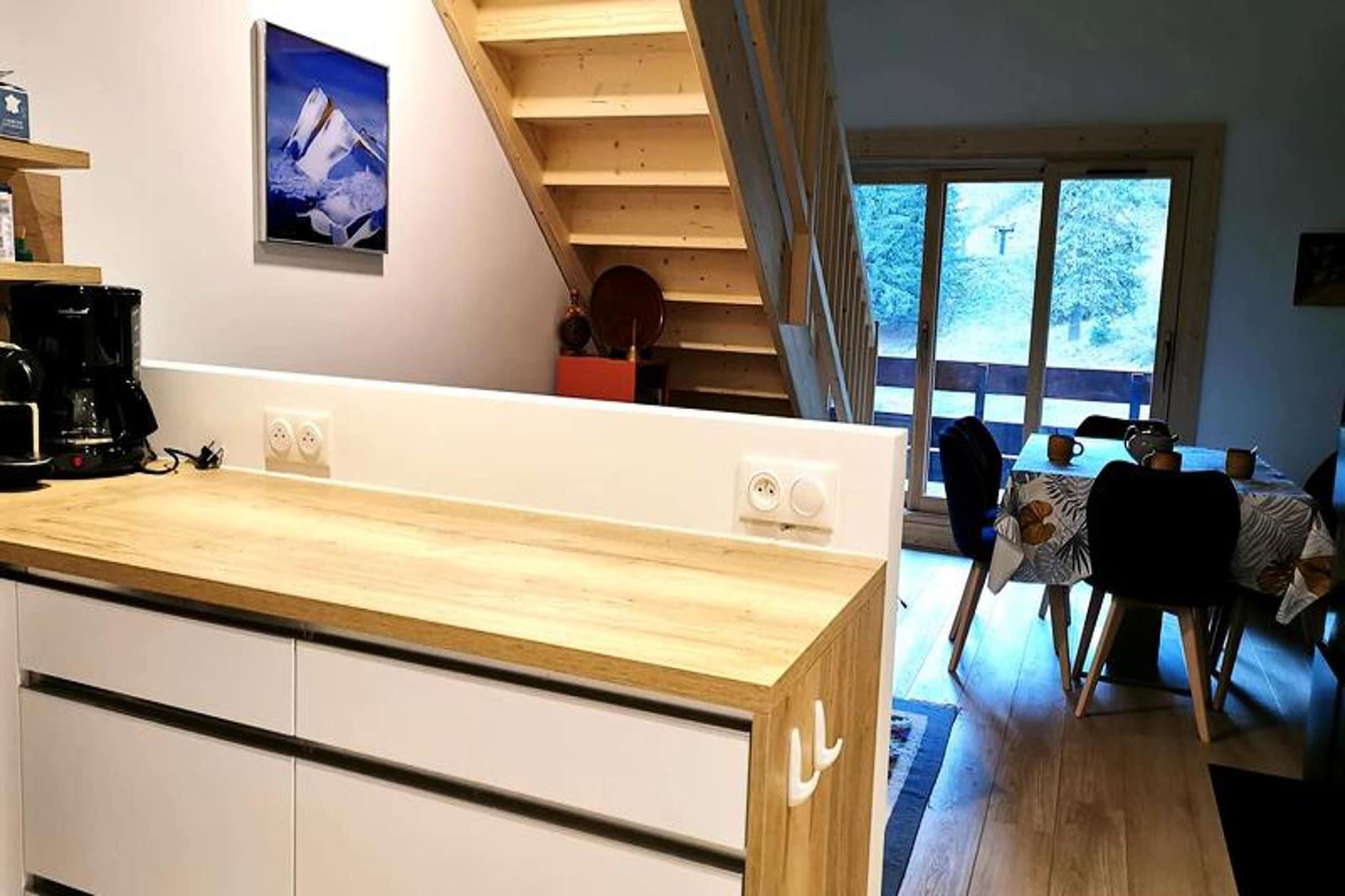 This 3-room apartment with mezzanine is designed to accommodate 6 people, offering a comfortable and spacious stay. The living room features a sofa bed, while the first bedroom offers two single beds and the second bedroom has a double bed. The mezzanine includes a single bed with a trundle bed for extra sleeping space. Duvets are provided for all beds, ensuring a cozy rest. Pets are allowed under certain conditions, with an additional supplement, and the apartment is non-smoking. Linen and cleaning services are available for an extra fee, and the tourist tax is not included in the rental price. Conveniently located in the hamlet of Crève-Coeur, the apartment is just 2 minutes from the ESF course departures, shops, and the slopes. It is also 5 minutes from the Piou Piou club, making it ideal for families with young children. The surrounding area offers various cafes and markets, providing a great selection of local goods and dining options. The apartment is well-equipped with a kitchen open to the living room, featuring a pellet stove (pellets not provided) for warmth and comfort. It includes a dishwasher, oven, 4-burner ceramic hob, microwave, and a fridge/freezer. For convenience, there is an electric coffee maker, pod coffee maker, toaster, kettle, and vacuum cleaner. The bathroom is functional, and a separate toilet adds extra privacy. The balcony offers a pleasant space to relax and enjoy the surroundings. Heating ensures a warm and inviting atmosphere throughout the apartment.