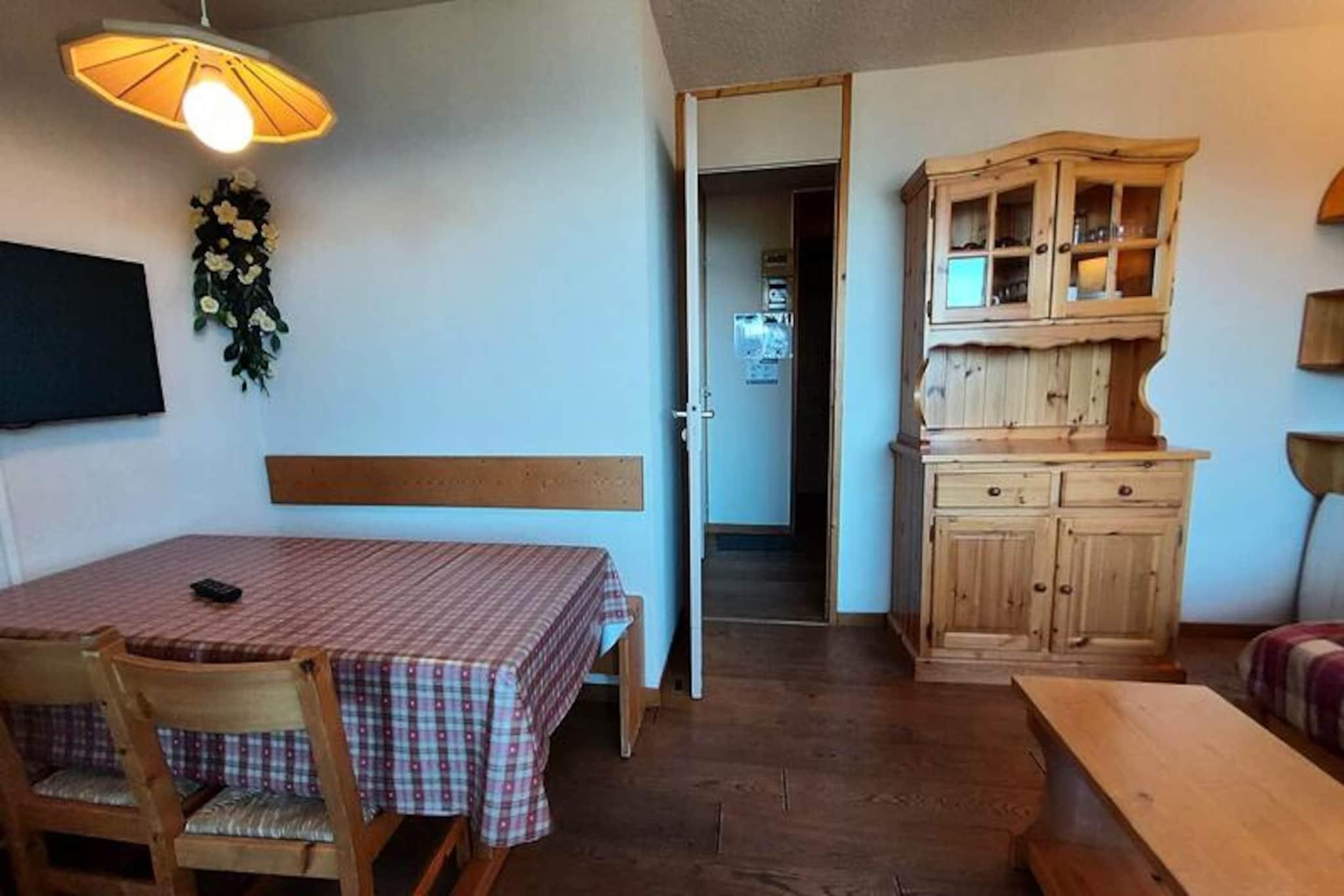 Perched high in the scenic Le Mottet district of Valmorel, this charming two-room apartment offers a cozy retreat for ski enthusiasts and families alike. With direct access to the slopes and the ESF ski school just steps away, every moment of your alpine getaway is filled with convenience and adventure. The pedestrianized hamlet ensures a peaceful atmosphere, while the panoramic views from the north-facing balcony allow you to soak in the beauty of the valley below. Whether you're here to carve through fresh powder or simply unwind in the serene mountain setting, this apartment is your gateway to unforgettable memories. \n\nInside, the apartment is thoughtfully designed to accommodate up to five guests. The bedroom features a bunk bed and a single bed, while the living room offers a comfortable sofa bed for two. A separate kitchen provides all the essentials for preparing hearty meals after a day on the slopes. The apartment is non-smoking and welcomes pets with a small supplement, ensuring everyone in your family feels at home. While Wi-Fi is not included, the warm ambiance and practical layout make it an ideal base for relaxation and connection with loved ones. \n\nThe \