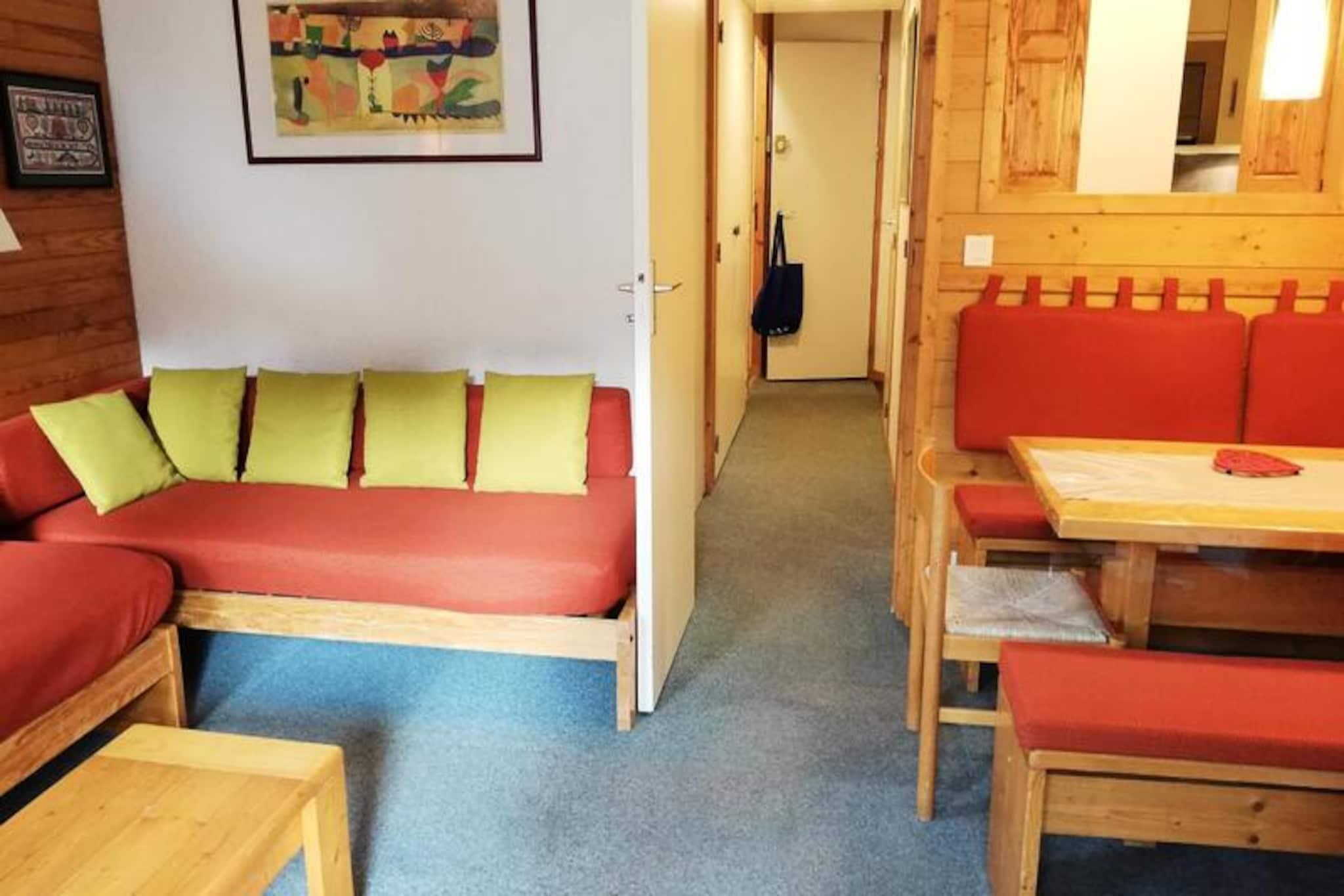 In the charming Crève Coeur hamlet of Valmorel, this cozy two-room apartment offers an unbeatable ski-in/ski-out experience, perfect for those seeking a seamless alpine getaway. With the Pierrafort cable car just 50 meters away and the slopes literally at your doorstep, every moment here is designed for convenience and adventure. From the southwest-facing balcony, enjoy uninterrupted views of the surrounding mountains, soaking in the serene beauty of the French Alps after an exhilarating day on the pistes. \n\nInside, the apartment comfortably accommodates up to five guests. The separate kitchen is fully equipped with an electric hob, dishwasher, microwave, and oven, making it easy to prepare hearty meals. The living room features three single beds and a TV, while the bedroom offers two additional single beds, ensuring a restful stay for all. A bathroom and separate toilet add to the practicality, while ski lockers in the residence provide secure storage for your gear. Please note that Wi-Fi is not included, and the apartment is non-smoking and pet-free, ensuring a clean and tranquil environment. \n\nThe Crève Coeur hamlet is ideally located, with essential shops such as a bakery, mini-market, and sports store just a short stroll away. The Télébourg cable car connects you effortlessly to the resort center and the nearby Mottet hamlet, expanding your options for dining, shopping, and après-ski activities. In winter, the ski-in/ski-out access makes this residence a dream for snow enthusiasts, while in summer, the surrounding trails and alpine scenery invite exploration and relaxation. \n\nWhether you're here for the thrill of the slopes or the tranquility of the mountains, this apartment in Valmorel offers a perfect blend of comfort, convenience, and breathtaking natural beauty.