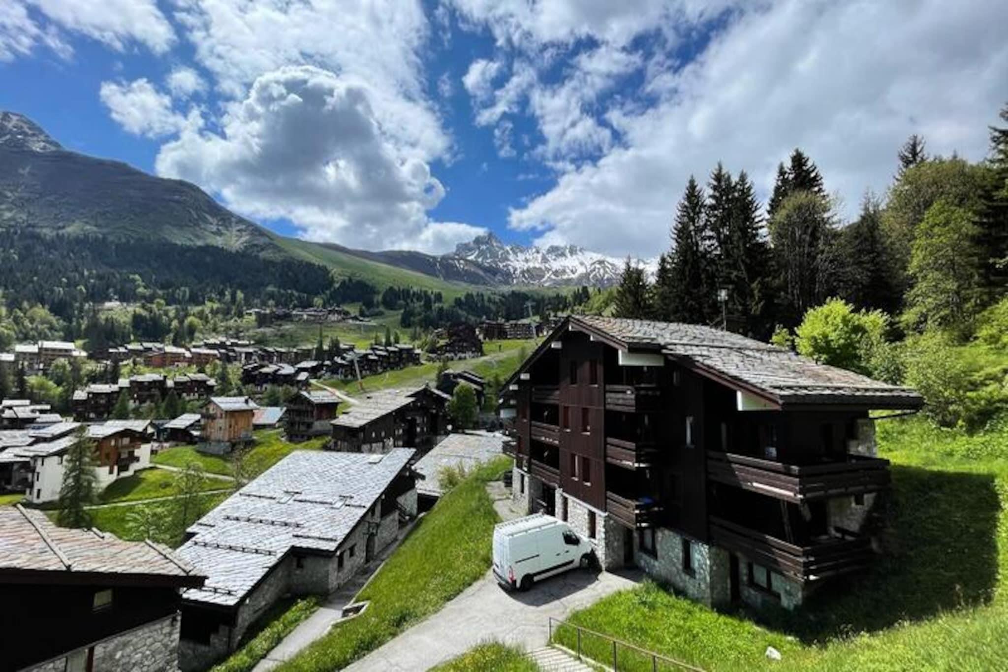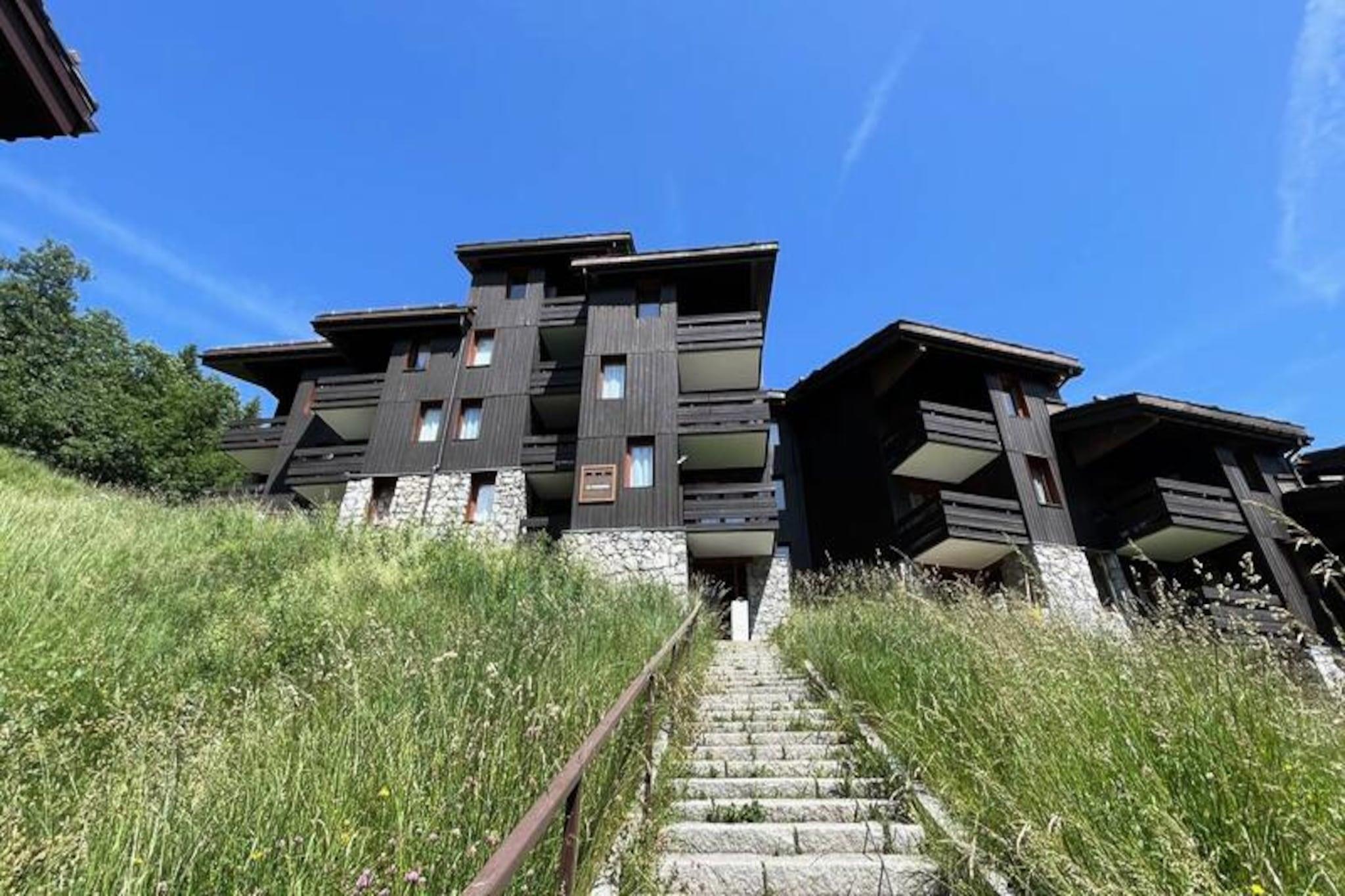 High above the charming Valmorel resort, this cozy studio apartment offers a serene alpine escape with breathtaking views of the surrounding mountains and village below. Imagine sipping your morning coffee on the southeast-facing balcony as the sun rises over the peaks, preparing for a day of adventure in the snow or on scenic trails. This tranquil retreat is perfect for couples or small families seeking comfort and convenience in the heart of the French Alps. \n\nThe apartment spans 27 square meters and is thoughtfully designed to maximize space and functionality. The entrance hall features a well-equipped kitchen with modern appliances including a stovetop, dishwasher, microwave, and refrigerator, making it easy to prepare hearty meals after a day outdoors. The dining area comfortably seats four, while the living room offers flexible sleeping arrangements with a trundle bed and two single sofa beds. A movable partition ensures privacy, and the bathroom with a separate toilet adds practicality to your stay. While Wi-Fi is not included, the panoramic views and cozy atmosphere provide the perfect setting to disconnect and unwind. \n\nLocated in the peaceful La Forêt neighborhood, the residence is just 100 meters from the slopes and ski lifts, ensuring effortless access to Valmorel’s renowned skiing terrain. A short 10-minute walk via a pedestrian path leads to the resort center, where you’ll find shops, restaurants, and a kindergarten for young children. Whether you’re exploring the slopes in winter or hiking the trails in summer, this apartment serves as an ideal base for your alpine adventures. \n\nWith its blend of comfort, convenience, and stunning scenery, this studio invites you to experience the magic of the French Alps in every season.
