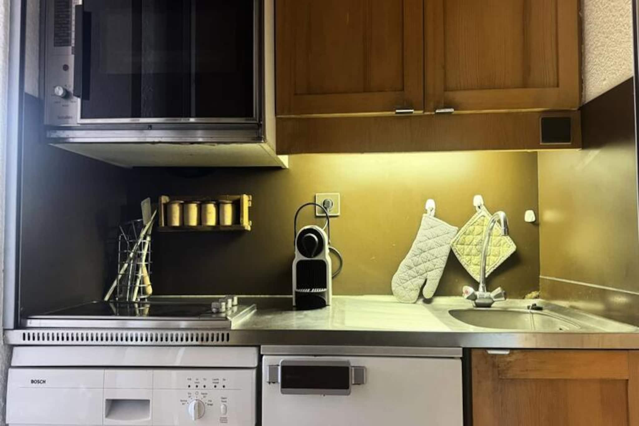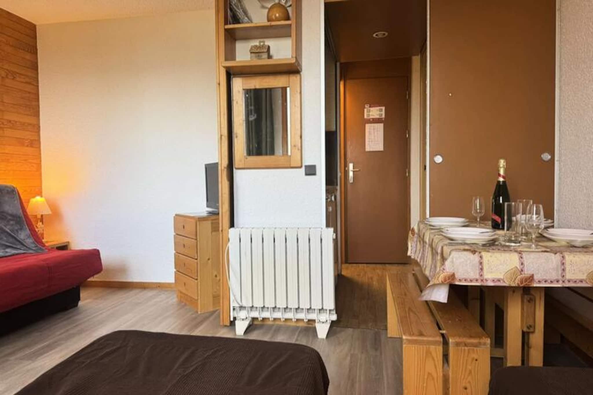 Perched in the charming hamlet of Crève Cœur, this cozy studio apartment offers a delightful alpine retreat for up to four guests. With its breathtaking views of the valley from the private balcony, this is the perfect spot to enjoy your morning coffee as the sun rises over the mountains, or to unwind after a day of adventure in the crisp mountain air. Whether you're seeking a serene escape or an action-packed getaway, this studio is the ideal base for your next holiday. \n\nThe apartment is thoughtfully designed to maximize comfort and functionality. The divisible living area features two single sofa beds and a sofa bed, all equipped with cozy duvets to ensure a restful night's sleep. A well-equipped kitchenette awaits your culinary creativity, complete with a refrigerator, dishwasher, oven, coffee maker, kettle, toaster, and a raclette grill for a true taste of the Alps. A modern shower room with a toilet adds to the convenience, while the warm heating system ensures a snug atmosphere during the colder months. Please note that the apartment is non-smoking, and additional services such as linen and cleaning can be arranged for a fee.\n\nLocated just 2 minutes from the ski slopes, lifts, and local shops, and less than 10 minutes from the ESF ski school and the Piou Piou children's club, this property is perfectly situated for both families and ski enthusiasts. The pedestrian street nearby offers a variety of dining and shopping options, adding to the charm and convenience of your stay.\n\nWhether you're here to carve through pristine snow or explore the scenic trails in the warmer months, this delightful studio in Crève Cœur promises a memorable alpine experience. Embrace the beauty of the French Alps and create unforgettable memories in this idyllic mountain setting.