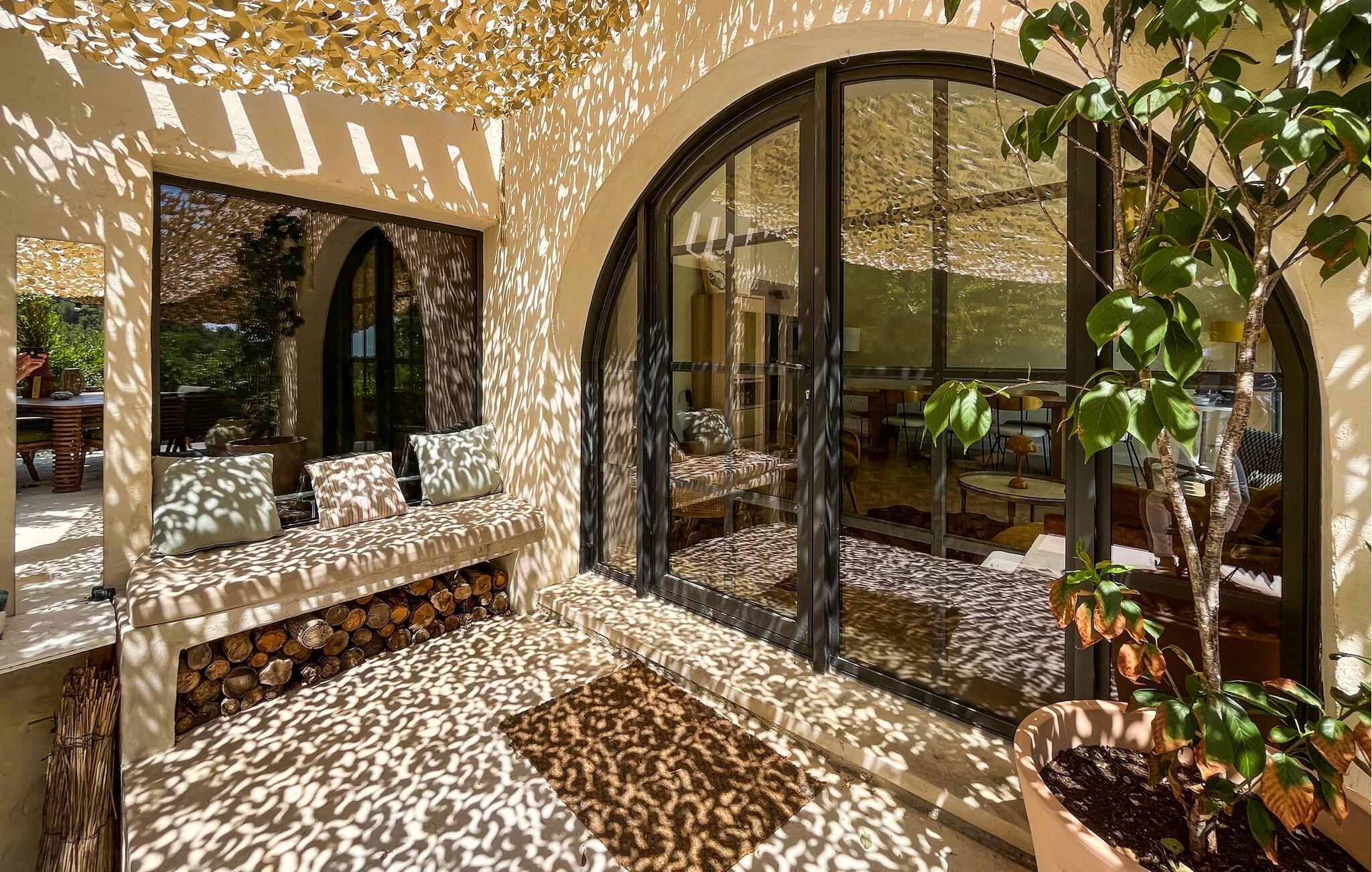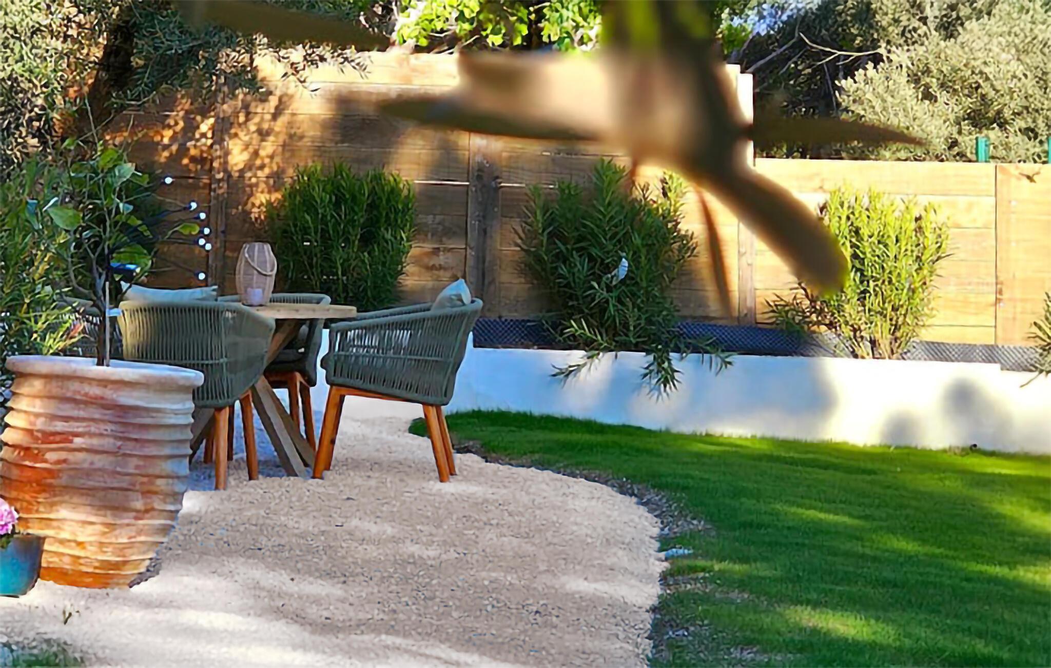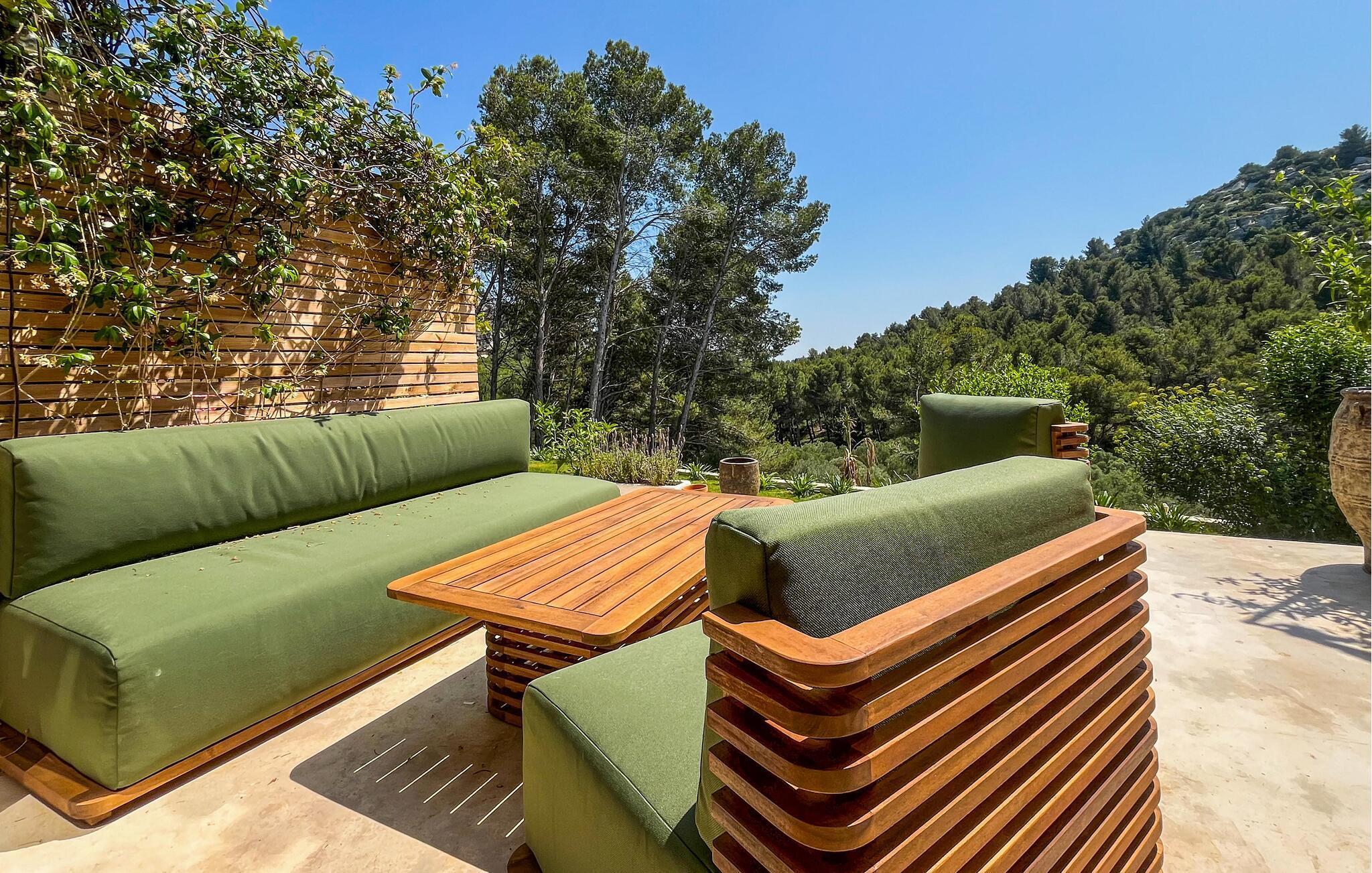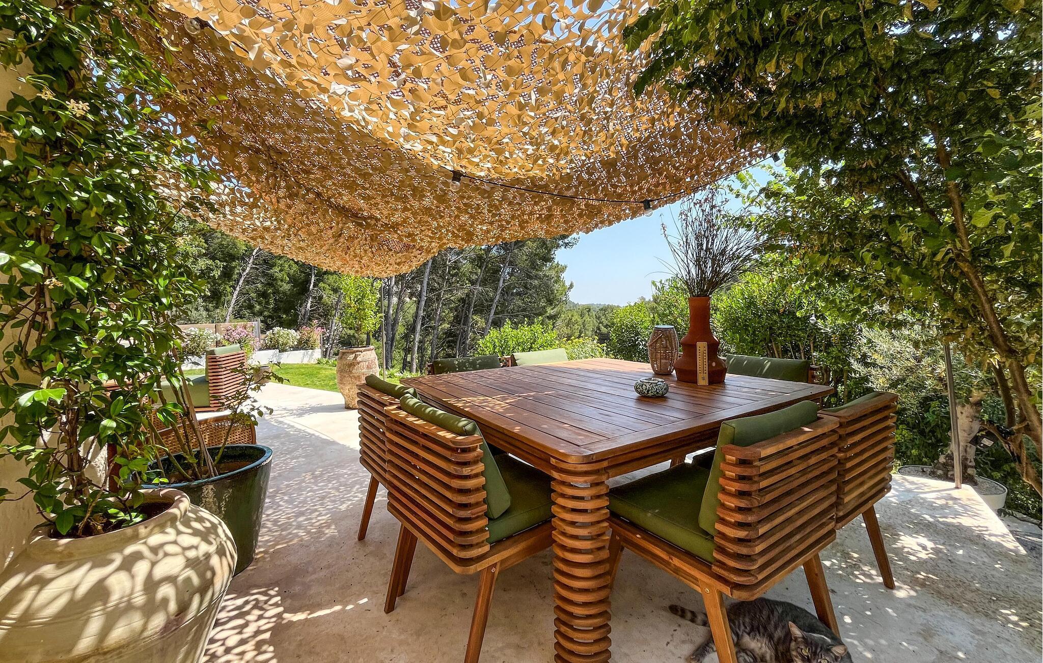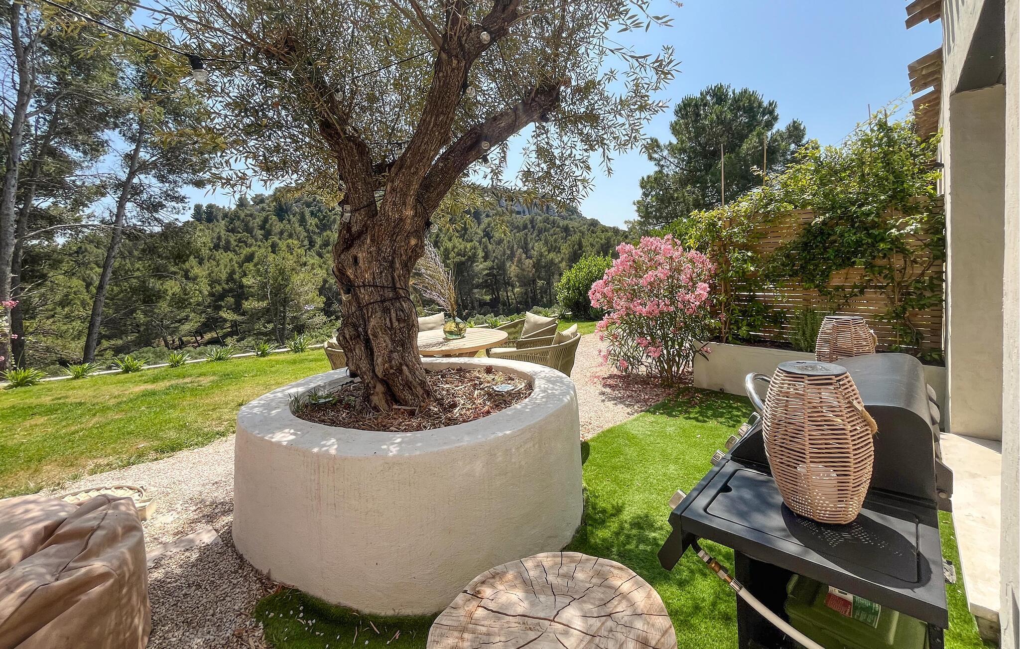 Im Außenbereich lädt die nach Süden ausgerichtete Terrasse mit großem Designer-Gartentisch unter der Pergola zum Verweilen ein. Genießen Sie den Blick auf Olivenbäume, den bewaldeten Garten und die Alpilles vom Whirlpool aus, erfrischen Sie sich im Pool, gönnen Sie sich einen Cocktail oder Espresso auf dem Sofa im Sommerpatio, plaudern Sie bei stimmungsvollen Grillabenden bis spät in die Nacht.