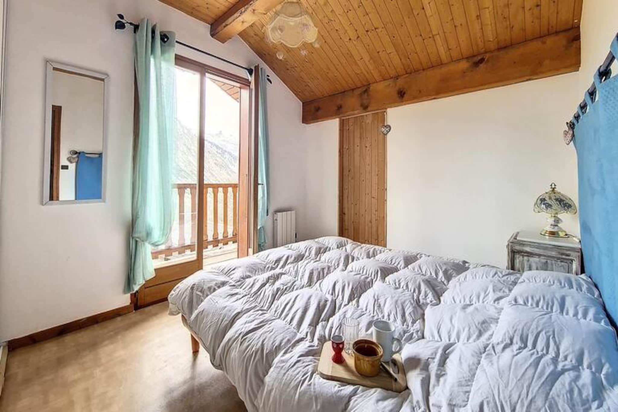 High above the Belleville Valley, where alpine serenity meets thrilling adventure, this charming family house offers an unforgettable escape in Saint Martin de Belleville. At an altitude of 1,450 meters, this picturesque village is part of the world-renowned Les 3 Vallées ski area, boasting 600 kilometers of pristine slopes and state-of-the-art facilities. Whether you’re seeking exhilarating runs or tranquil moments, Saint Martin combines exceptional skiing with a warm, authentic mountain lifestyle. Just 450 meters from the village center and ski lift, this property places you at the heart of it all. \n\nThis typical Bellevilloise house spans 90 square meters and comfortably accommodates up to six guests. The first floor features a cozy living and dining area with a television, a sofa bed, and direct access to a west-facing terrace, perfect for soaking in the alpine views. The open-plan kitchen is fully equipped with modern appliances, including a dishwasher, oven, and coffee maker, ensuring all the comforts of home. Upstairs, two inviting bedrooms await: one with twin beds and balcony access, and another with a double bed and its own balcony. Two bathrooms, each with a shower and toilet, provide convenience for families or groups. \n\nSaint Martin de Belleville offers more than just skiing. Its charming village atmosphere, local shops, and gourmet restaurants create a delightful blend of activity and relaxation. In summer, explore hiking trails that wind through lush meadows and discover breathtaking vistas of the surrounding peaks. With amenities like bed linen and towels included during winter stays, this property ensures a seamless and comfortable holiday experience. Whether you’re here for powder-filled adventures or tranquil alpine escapes, this home is your gateway to the magic of Les 3 Vallées.