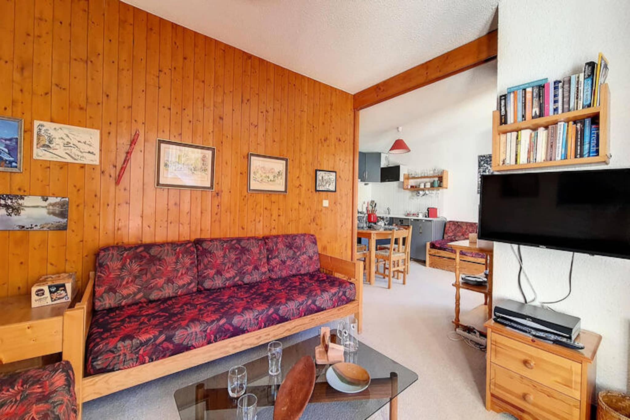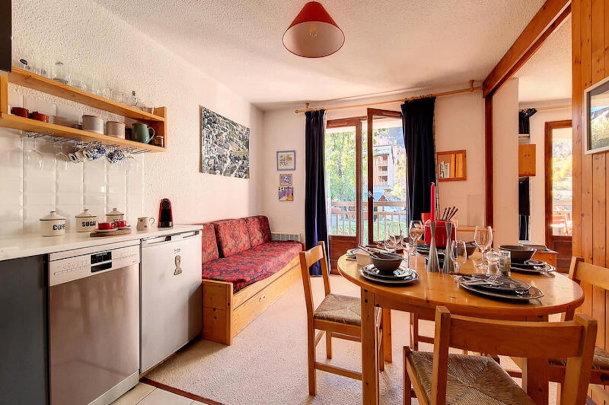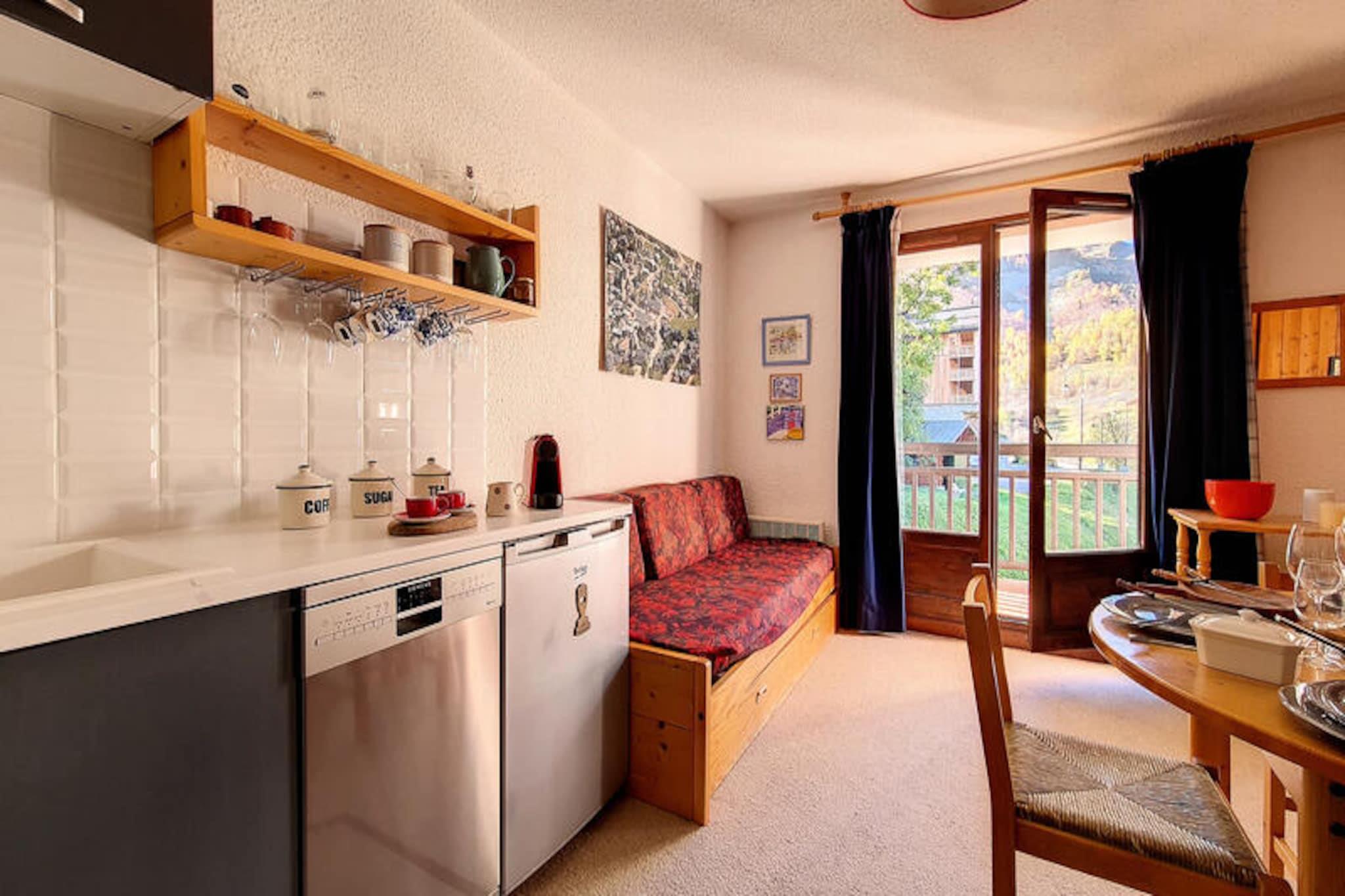 In the charming Grangeraies district of Saint Martin de Belleville, this cozy alpine apartment offers a welcoming retreat for your mountain getaway. Just a two-minute walk from the Saint Martin 1 gondola lift, you’ll have direct access to the world-renowned 3 Valleys ski area, where endless slopes and breathtaking vistas await. The village center, with its quaint shops and local services, is only a five-minute stroll away, ensuring convenience and a touch of authentic Savoyard charm. The residence is accessed via an external staircase, adding a rustic touch to your arrival. \n\nThis thoughtfully designed 42m² apartment is located on the third floor of the Les Murgers residence and comfortably accommodates up to six guests. The layout includes a cozy bedroom with two single beds, a living room featuring two single sofa beds, and an additional sleeping area with a single sofa bed and pull-out bed. The south-west-facing balcony invites you to soak up the alpine sun while enjoying views of the surrounding peaks. A fully equipped kitchen with ceramic hobs, refrigerator, oven, dishwasher, washing machine, kettle, and Nespresso coffee machine ensures you can prepare delicious meals after a day on the slopes. Modern amenities like a TV, DVD player, and a ski locker add to the convenience of your stay. \n\nThe residence’s prime location means you’re close to everything you need, from ski schools and equipment rentals to grocery stores and après-ski options. In winter, guests staying for seven nights or more are treated to included bed linen, towels, and other essentials, making your holiday even more seamless. Whether you’re here to carve through pristine snow or explore the area’s hiking trails in summer, this apartment is the perfect base for your alpine adventures. \n\nWith its blend of comfort, practicality, and unbeatable location, this property promises an unforgettable stay in the heart of the French Alps. Let the magic of Saint Martin de Belleville and the 3 Valleys inspire your next mountain escape.