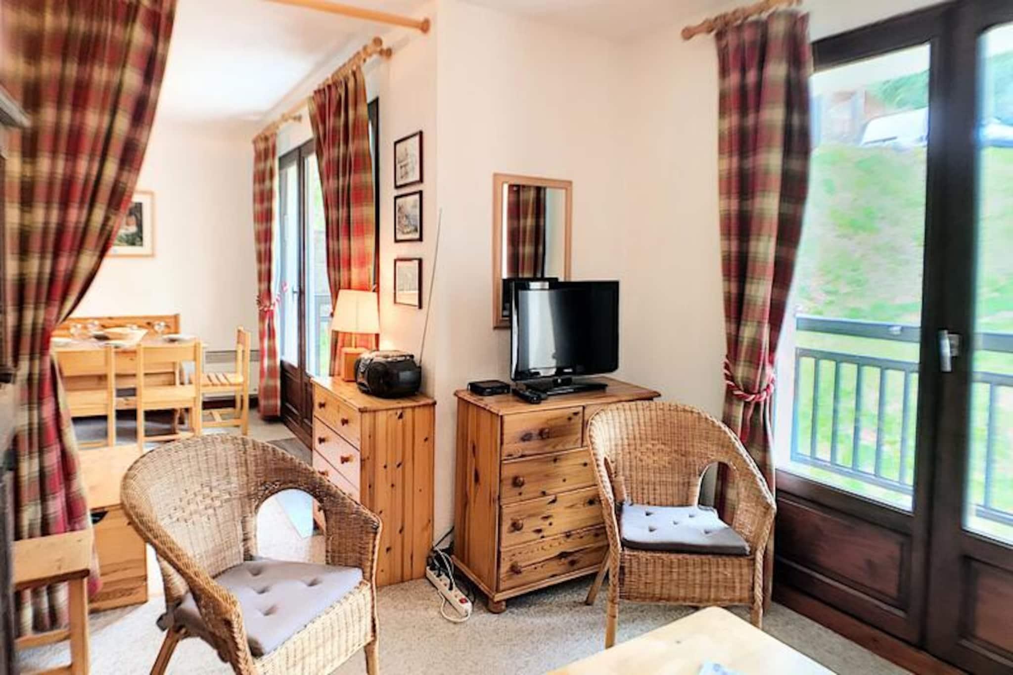 In the charming Grangeraies district of Saint-Martin-de-Belleville, this cozy alpine apartment offers a delightful retreat for those seeking to explore the world-renowned 3 Valleys ski area. Just a two-minute walk from the Saint Martin 1 gondola lift, you’ll find yourself perfectly positioned for effortless access to pristine slopes and breathtaking mountain views. The village center, a mere five-minute stroll away, invites you to discover its quaint shops, local eateries, and welcoming atmosphere, all framed by the majestic peaks of the French Alps. Whether you’re here for winter sports or summer adventures, this residence promises a memorable stay. \n\nThe apartment, located on the first floor of Les Murgers residence, features a thoughtfully designed layout with a bedroom, sleeping alcove, and a living room that comfortably accommodates up to six guests. Its south-west facing balconies provide a sunny spot to unwind after a day of skiing or hiking, offering picturesque views of the surrounding landscape. The well-equipped kitchen includes modern conveniences such as a dishwasher, microwave, and Nespresso machine, ensuring you have everything needed to prepare hearty meals. A television with an integrated DVD player adds to the cozy ambiance, while the bathroom with a bathtub and separate WC ensures comfort for all guests. \n\nWith a ski locker and amenities like bed linen and towels included during winter stays of seven nights or more, this property is tailored for convenience and relaxation. The residence’s external staircase adds a touch of alpine charm, while its proximity to the gondola lift and village center ensures you’re never far from the action. \n\nWhether you’re carving through powdery slopes, exploring scenic trails, or simply soaking in the tranquil beauty of Saint-Martin-de-Belleville, this apartment is your gateway to an unforgettable alpine escape. Let the magic of the 3 Valleys create memories that will last a lifetime.