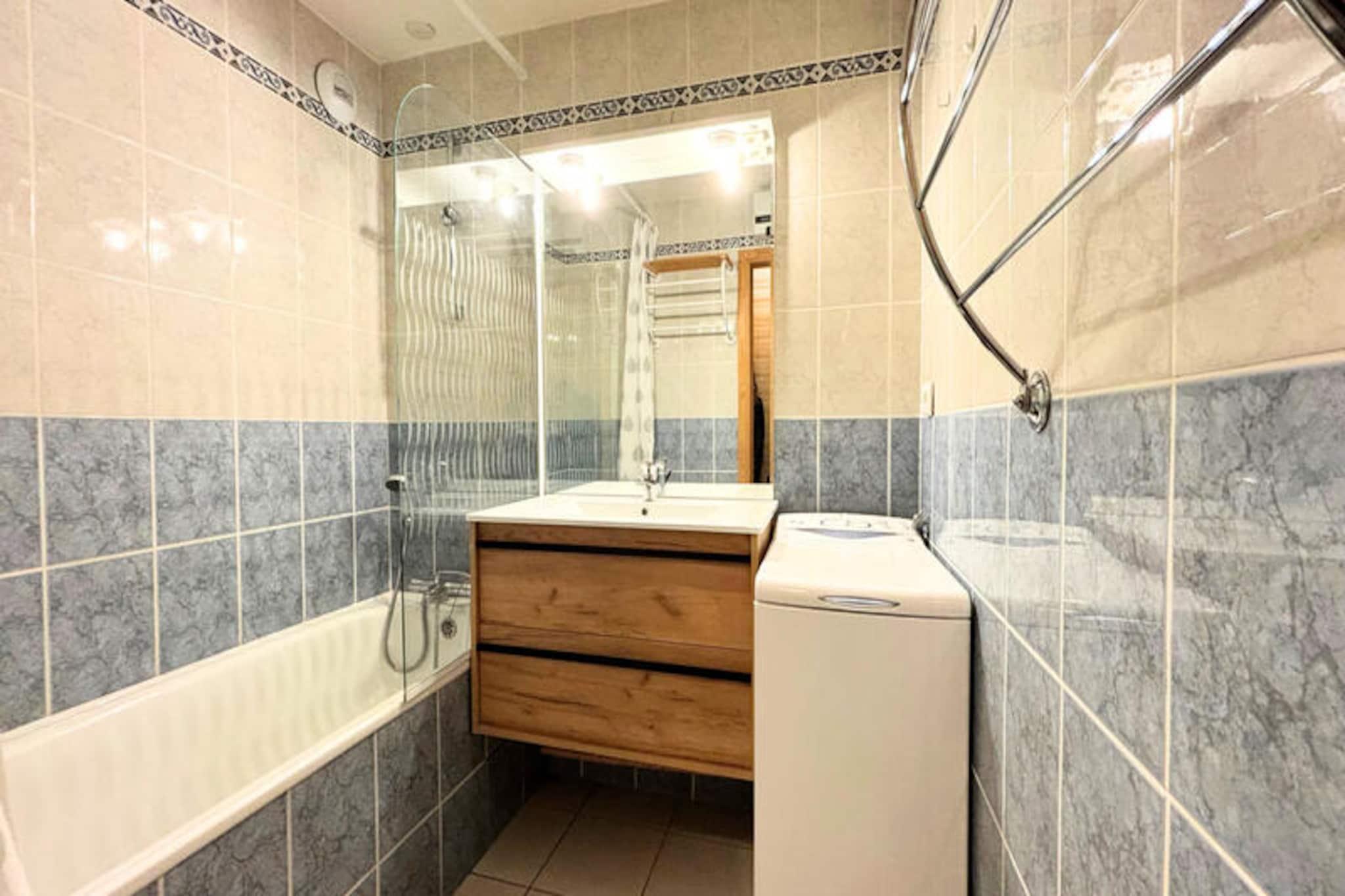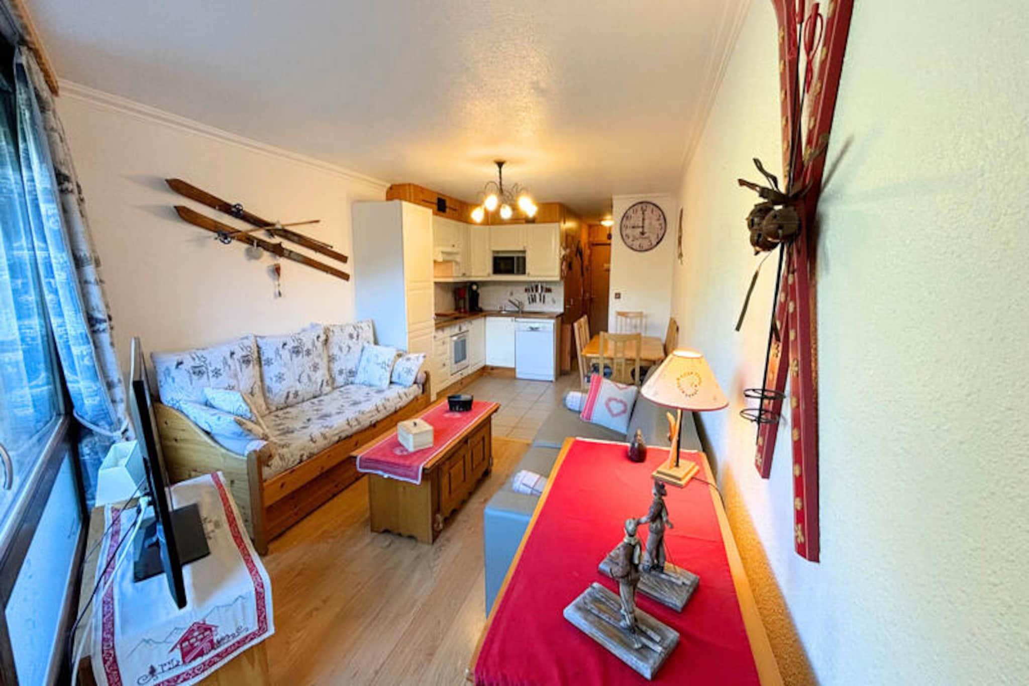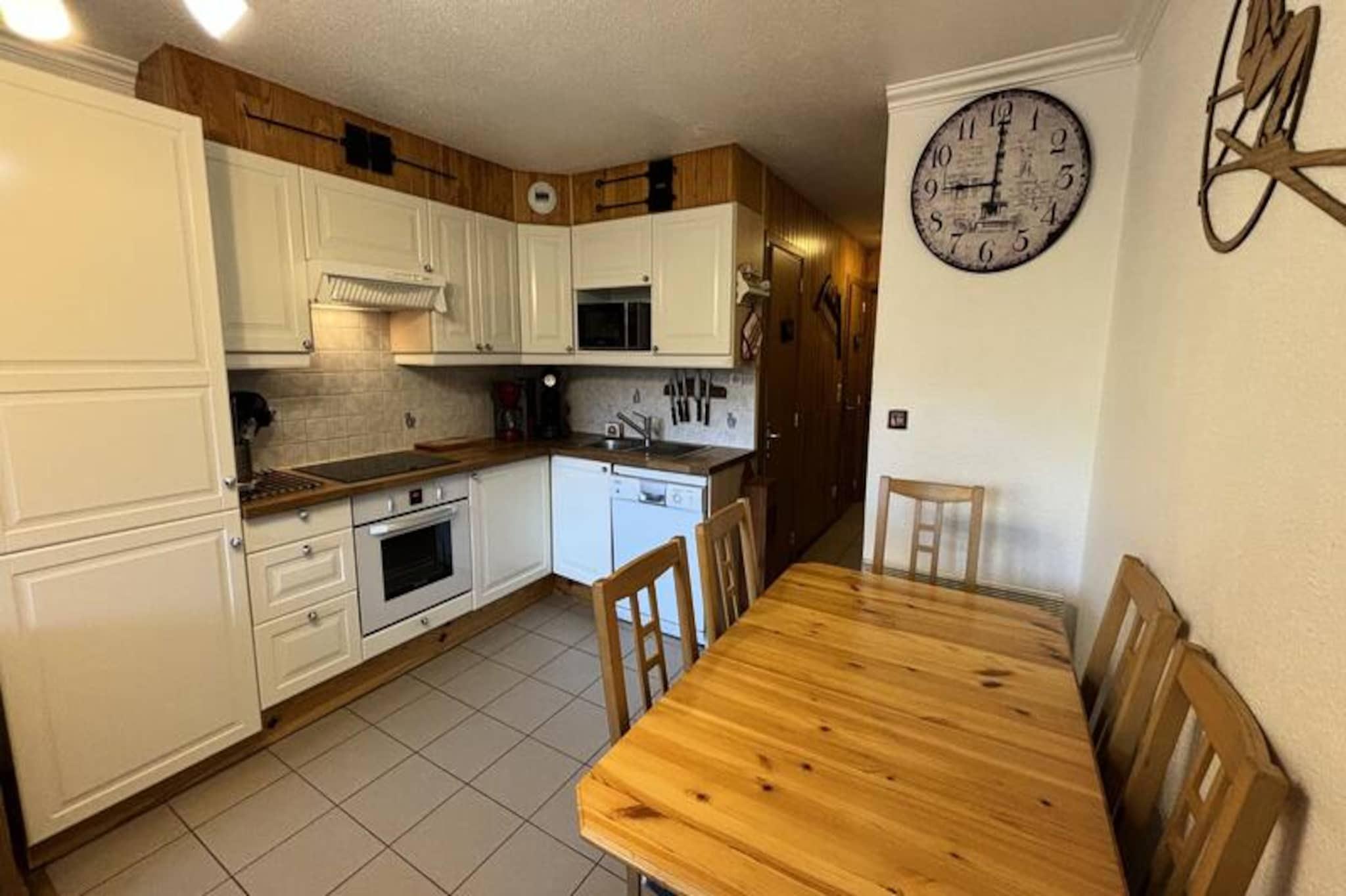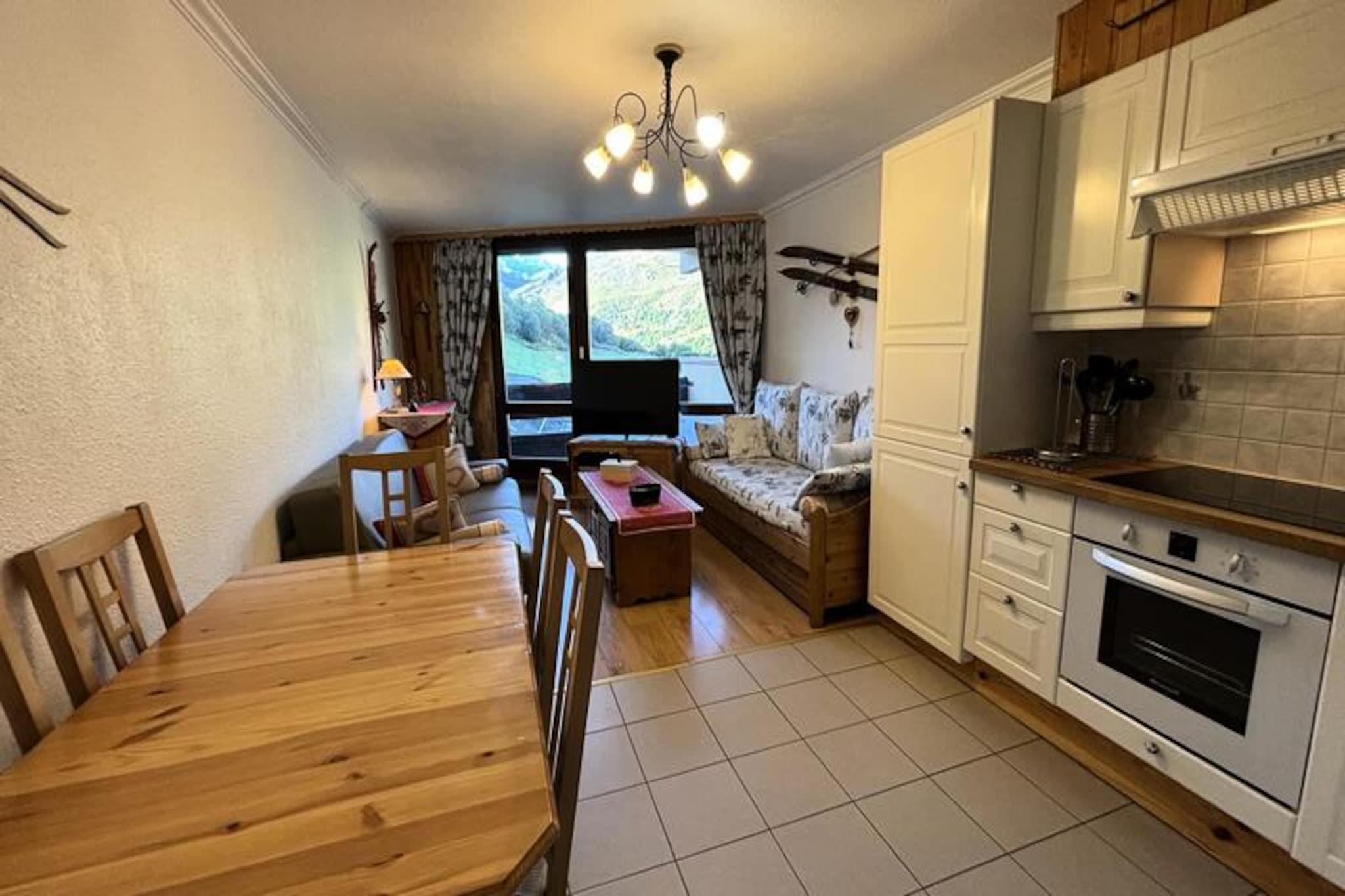 In the serene Preyerand district of Les Menuires, this charming two-room apartment offers a cozy alpine retreat with direct access to the slopes. Imagine stepping out of your residence and skiing straight into the heart of the Three Valleys, one of the largest ski areas in the world. With a south-facing balcony, you’ll wake up to breathtaking mountain views and enjoy the warmth of the sun throughout the day, creating the perfect backdrop for your holiday escape. The Caron residence is thoughtfully designed for convenience, featuring multiple elevators and a large open-air parking lot, ensuring a seamless experience from arrival to departure. \n\nInside, the apartment comfortably accommodates up to five guests, making it ideal for families or small groups. The open-plan kitchen and living area, separated by a breakfast bar, is fully equipped with modern appliances including a ceramic hob, oven, microwave, refrigerator, and dishwasher. After a day on the slopes, unwind in the cozy living room with a sofa bed and television or retreat to the bedroom with its bunk beds for a restful night. The bathroom features a bathtub and washing machine, while a separate toilet adds extra convenience. Electric roller shutters and individual heating ensure a comfortable stay, and the ski locker on the ground floor keeps your gear secure and easily accessible.\n\nThe Caron residence is perfectly situated near shops, ski rental services, and a free gondola lift that connects you to the vibrant heart of Les Menuires from morning until late evening. Whether you’re here for the thrill of skiing, the charm of the alpine village, or simply to relax and take in the stunning scenery, this apartment provides the ideal base. With optional hotel-style services and additional amenities available upon request, your stay promises to be as effortless as it is memorable. Discover the magic of the French Alps and create unforgettable memories in this welcoming mountain retreat.