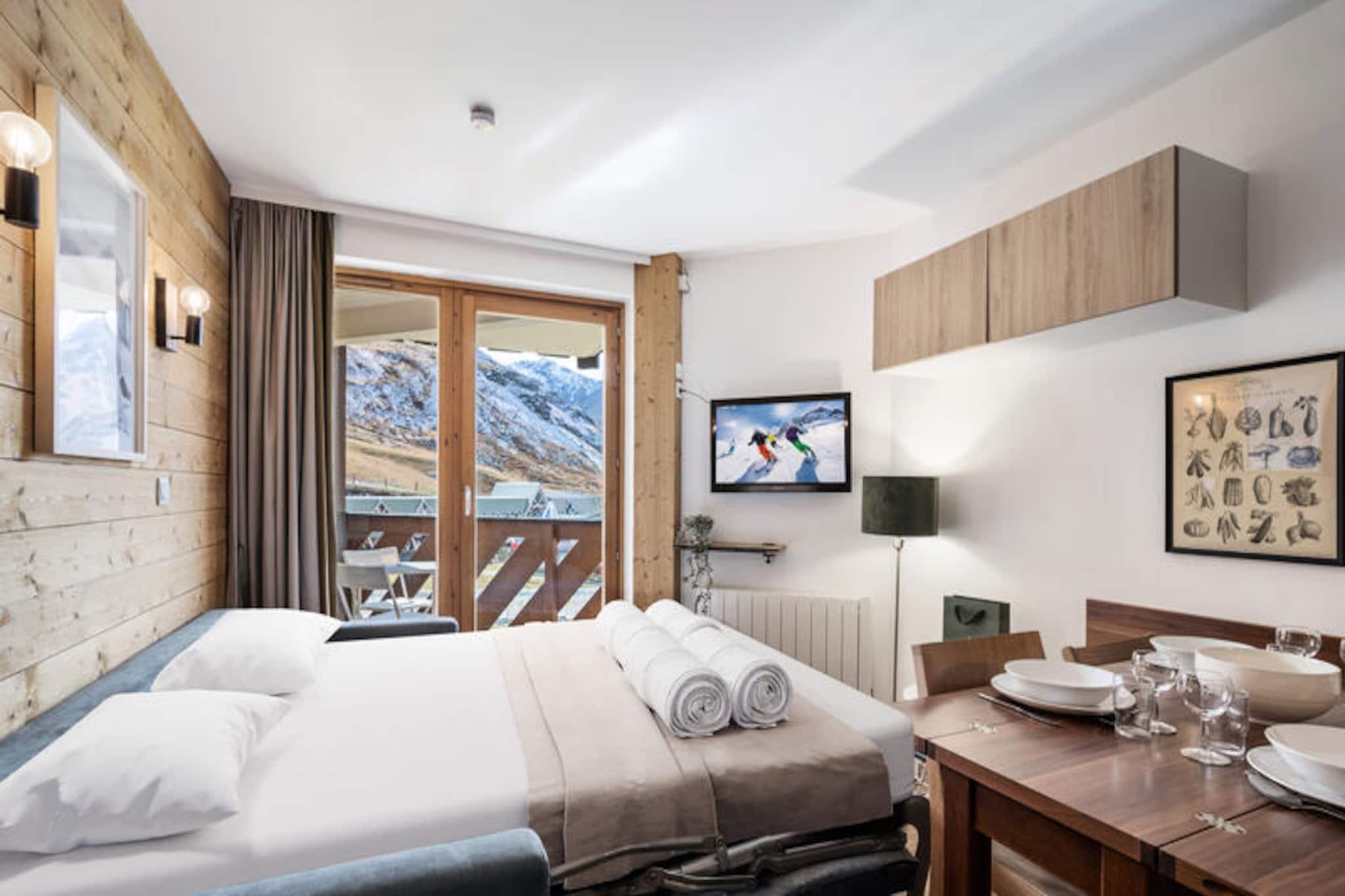 Where the crisp mountain air meets the thrill of alpine adventure, the MACHU PICHU residence in Val Thorens offers an unparalleled ski-in/ski-out experience. Situated on Rue du Soleil, this charming retreat invites you to wake up to breathtaking views of snow-dusted slopes and majestic peaks, with the convenience of direct access to the world-renowned ski domain right from your doorstep. Whether you're here to carve through powdery trails or simply bask in the serene beauty of the French Alps, this residence is your gateway to unforgettable moments. \n\nStep into PICHU 305, a thoughtfully designed 27 m² apartment that comfortably accommodates up to four guests. The modern interiors, adorned with warm, contemporary tones, create a cozy and inviting atmosphere for your mountain escape. The layout includes a separate bedroom with two single beds, a living room featuring a double sofa bed, and an open-plan kitchen equipped with everything you need to prepare hearty meals after a day on the slopes. The bathroom, complete with a bathtub and shower, and a separate toilet ensure added convenience for your stay. \n\nBeyond the apartment, the residence’s prime location offers seamless access to the slopes and proximity to the vibrant town center, where you’ll find shops, restaurants, and après-ski entertainment. Whether you’re exploring the pristine trails or indulging in the local cuisine, Val Thorens promises a blend of excitement and relaxation. \n\nWith included services such as linens, beds made upon arrival, bathroom amenities, and end-of-stay cleaning, every detail is taken care of to ensure a hassle-free vacation. Choose MACHU PICHU residence for a perfect balance of comfort, convenience, and alpine charm—your dream mountain getaway awaits.