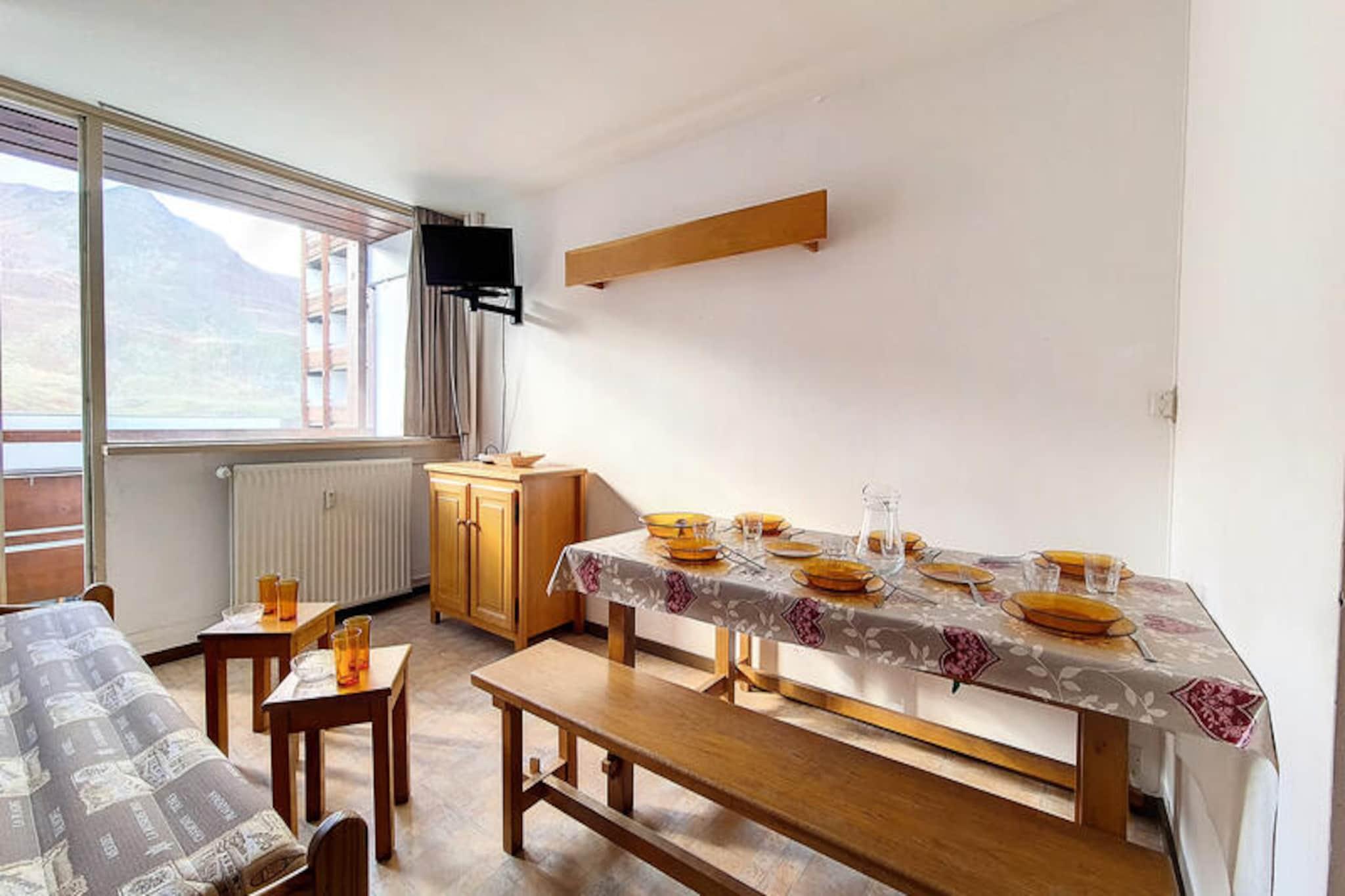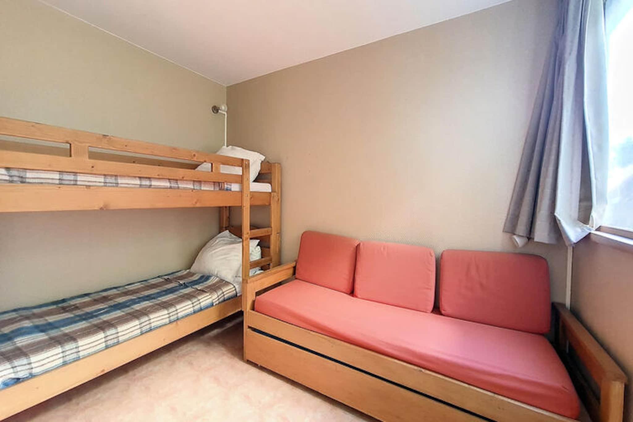 In the serene Croisette district of Les Menuires, this charming duplex apartment offers a cozy alpine escape just 100 meters from the slopes and the bustling Croisette shopping arcade. Imagine mornings filled with crisp mountain air as you step onto your southwest-facing balcony, soaking in the tranquil ambiance and breathtaking views of the surrounding peaks. Whether you're here for winter skiing or summer hiking, this residence ensures a peaceful retreat while keeping you close to the action. \n\nSpanning 36 square meters, the apartment comfortably accommodates up to six guests, making it ideal for families or small groups. The living room features a single bed and a pull-out single bed, complemented by a television for relaxed evenings. The bedroom provides flexible sleeping arrangements with a single bed, pull-out bed, and two single bunk beds, perfect for children and adults alike. A well-equipped kitchen with modern amenities such as a combination oven, dishwasher, and coffee maker allows you to prepare hearty meals after a day of adventure. The apartment also includes a bathroom with a shower, a separate WC, and linoleum flooring throughout for easy maintenance. \n\nLocated just steps from the slopes, the residence offers free parking (subject to availability) and paid Wi-Fi access for added convenience. Pets are welcome with a supplement, making it a great choice for those traveling with furry companions. The Croisette shopping arcade nearby provides dining, shopping, and entertainment options, ensuring everything you need is within reach. \n\nWhether you're seeking thrilling ski runs, scenic mountain trails, or simply a quiet getaway, this apartment combines comfort, practicality, and proximity to Les Menuires' best attractions. Create lasting memories in the heart of the French Alps, where adventure and relaxation meet.
