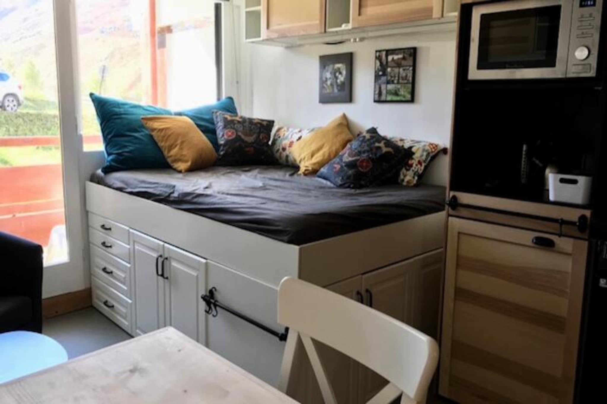 In the heart of the vibrant La Croisette area, this charming studio apartment offers a cozy retreat for up to three guests. With its south-facing balcony, you can soak in the alpine sunshine while enjoying the serene mountain atmosphere. Perfectly situated on the ground floor of the Burons building, this recently renovated space combines modern comforts with a warm, inviting ambiance, making it an ideal choice for couples or small families seeking a memorable alpine getaway. \n\nThe studio is thoughtfully designed to maximize space and functionality. The living area features a double bed in a bunk bed setup with ample storage, while the entrance offers an additional single bed, ensuring a comfortable stay for all. A fully equipped kitchen includes a two-burner cooktop, refrigerator, combination microwave/oven, dishwasher, washer/dryer, toaster, kettle, and coffee maker, allowing you to prepare meals with ease. The bathroom boasts a spacious shower and toilet, and the flat-screen TV adds a touch of entertainment after a day on the slopes. \n\nConvenience is key with this location. The slopes are just 100 meters away, and the children's daycare and snow garden are right at the foot of the building, making it perfect for families. The La Croisette shopping arcade is only 50 meters away, offering a variety of shops and dining options. For those arriving by bus, the stop is just 50 meters from the residence, and the bus station is a mere 2-minute ride away. Ski lockers in the basement ensure your gear is secure and easily accessible. \n\nWhether you’re here for the thrill of skiing or the charm of the French Alps, this studio provides the perfect base for your adventures. With its prime location, modern amenities, and cozy atmosphere, it promises an unforgettable mountain escape.
