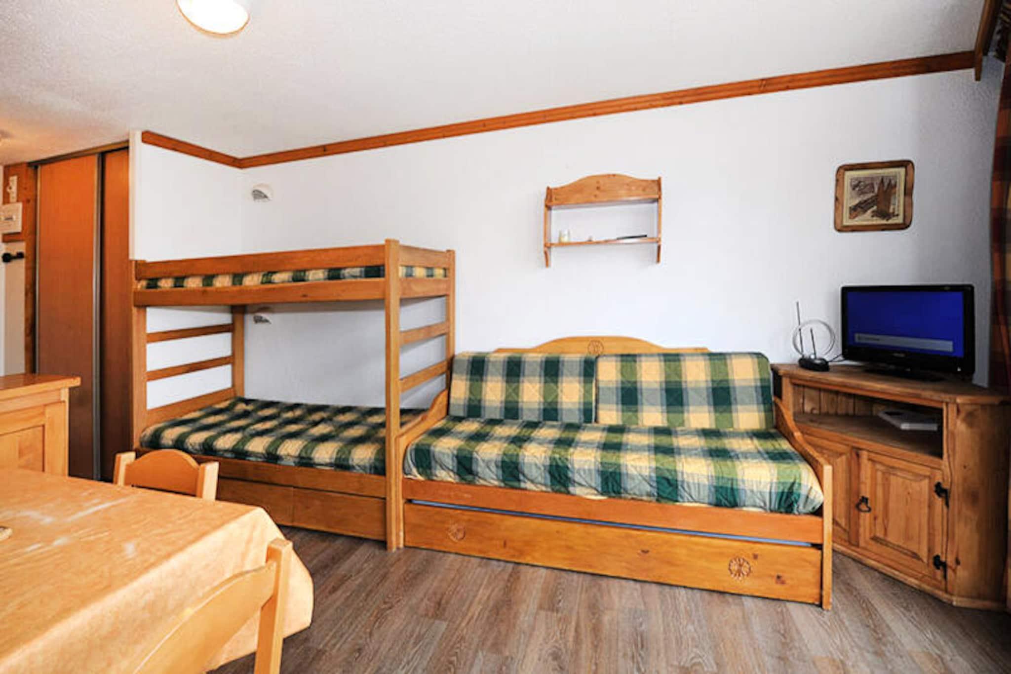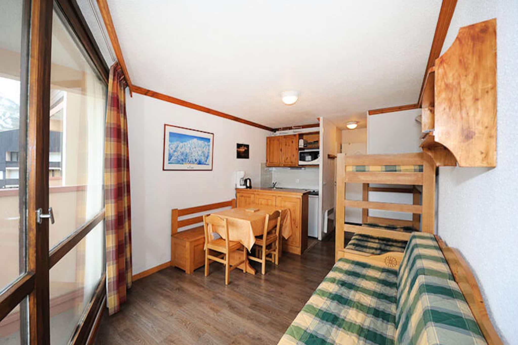 Set within the picturesque Preyerand district, this cozy studio apartment offers a delightful alpine retreat for up to three guests. Located on the second floor of the Grande Masse residence, the property boasts a south-facing balcony that invites you to soak in the serene mountain views and bask in the sun’s warmth after a day of adventure. With direct access to the slopes, you’re perfectly positioned to embrace the thrill of skiing or snowboarding, while the TéléPreyerand cable car conveniently connects you to the bustling La Croisette district from early morning until late evening, free of charge. Whether you’re seeking winter sports or summer hikes, this charming studio places you at the heart of it all. Thoughtfully renovated, the apartment features a bright and inviting living area with a single sofa bed and two single bunk beds, making it ideal for small families or couples. The fitted kitchen is equipped with modern amenities, including ceramic hobs, a combination oven/microwave, refrigerator, dishwasher, and coffee machines, ensuring you have everything needed to prepare hearty meals. The bathroom includes a bathtub and toilet, offering a relaxing space to unwind after an active day. Linoleum flooring throughout adds a touch of practicality and warmth to the space. Please note that the upper bunk is not suitable for children under six years old. The residence’s prime location means you’re just moments away from ski lifts, local shops, and dining options. Whether you’re exploring the slopes or enjoying the vibrant atmosphere of La Croisette, everything is within easy reach. In summer, the area transforms into a haven for hikers and nature enthusiasts, with trails that reveal breathtaking alpine landscapes. The Grande Masse residence offers the perfect blend of comfort and convenience, making it an excellent choice for your next mountain getaway. With its charming ambiance, modern amenities, and unbeatable location, this studio apartment promises a memorable stay in the heart of the French Alps. Whether you’re here for adventure or relaxation, it’s the ideal base to create unforgettable memories.