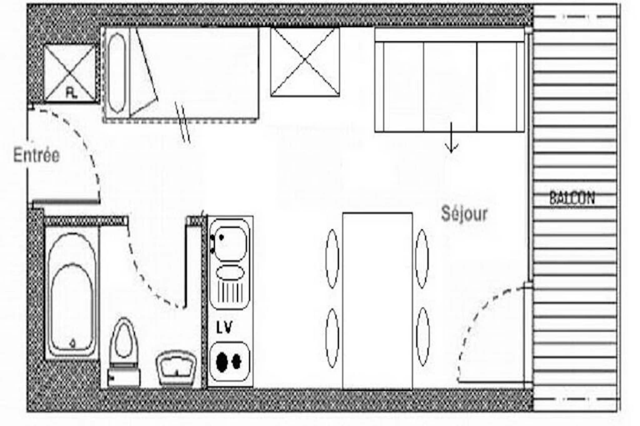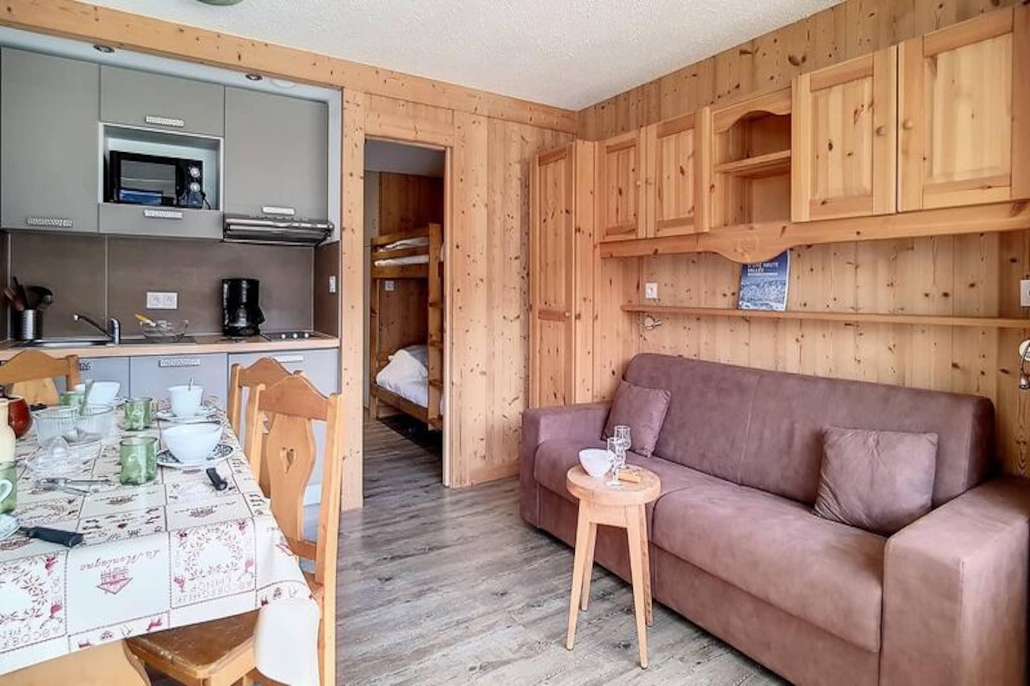 In the vibrant La Croisette district of the resort, this charming studio apartment offers a cozy retreat for up to four guests. With ski lifts just steps from the building, you can enjoy effortless ski-in/ski-out access to the slopes, including beginner-friendly areas right outside. The Pioupiou Club, perfect for little ones with its daycare and snow garden, is just a 10-minute walk away, making this location ideal for families seeking convenience and fun. The shopping arcade is only a 2-minute stroll, while the bus station is within easy reach at 5 minutes on foot, ensuring seamless connectivity throughout your stay. \n\nRenovated in 2015, this 22m² studio blends modern comfort with alpine charm. The living room features a sofa bed for two, complemented by a television for cozy evenings indoors. The entrance area includes two single bunk beds, perfect for children over six years old. The south-facing balcony invites you to soak in the sunshine and admire the serene mountain views. The well-equipped kitchen boasts a 2-burner cooktop, refrigerator, microwave, dishwasher, toaster, kettle, and electric coffee maker, making meal preparation a breeze. The bathroom is fitted with a shower and toilet, ensuring all essentials are covered. \n\nThis non-smoking apartment is thoughtfully designed for relaxation, with duvets and blankets provided for added comfort. While pets are not allowed, paid Wi-Fi access is available, subject to network coverage. Rated 3 Gold Snowflakes and holding a ministerial rating of 2 Stars, this property guarantees a high standard of quality and satisfaction. \n\nWhether you’re here to carve through snowy pistes, explore the resort’s lively atmosphere, or simply unwind in the heart of the French Alps, this studio apartment offers the perfect base for an unforgettable alpine getaway.