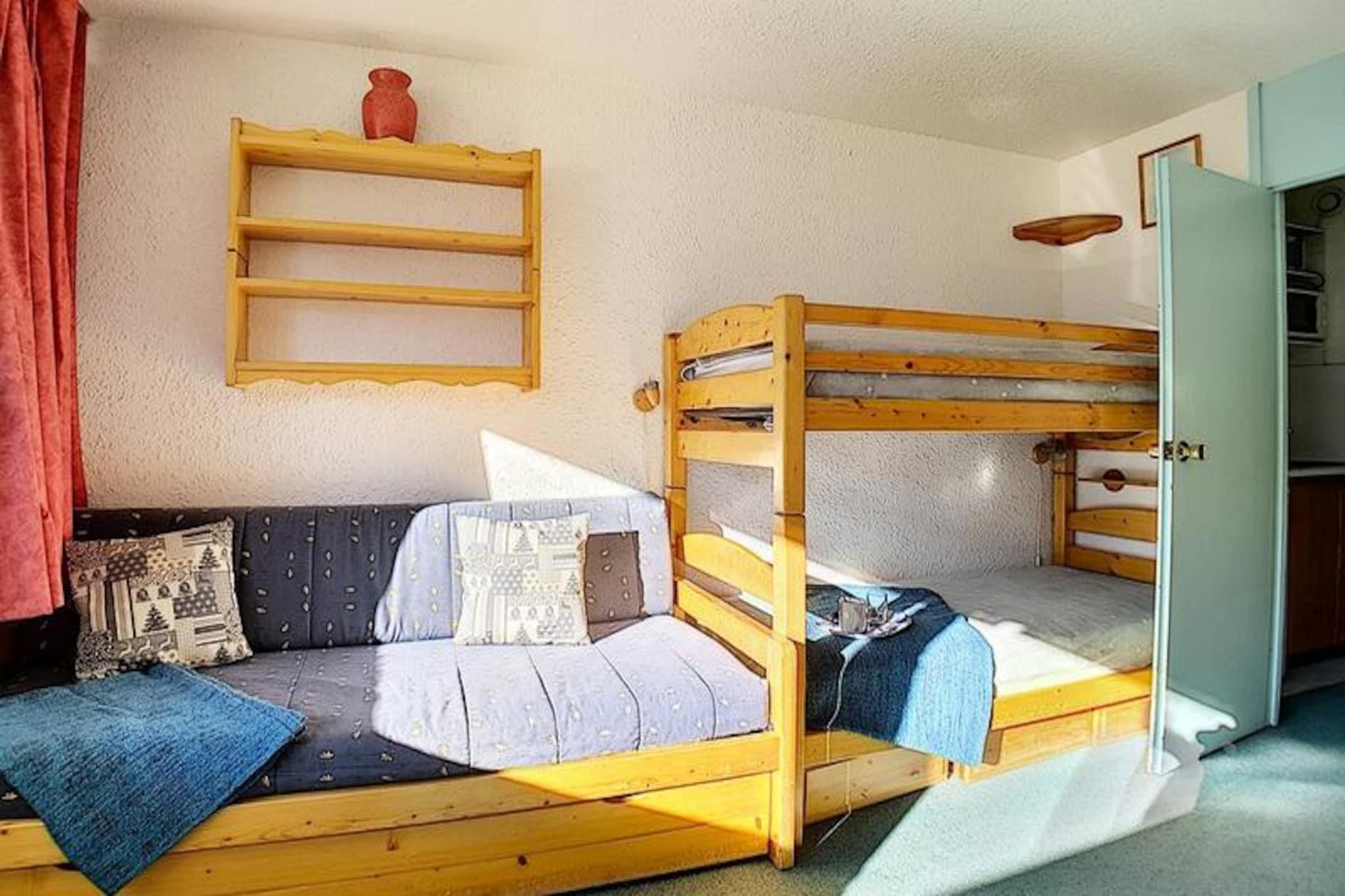 In the heart of the vibrant La Croisette district, this cozy studio apartment offers a prime location for an unforgettable alpine getaway. With the ski lifts just steps from the building, you’ll enjoy the ultimate ski-in/ski-out convenience, perfect for both seasoned skiers and beginners alike. The surrounding slopes and breathtaking mountain views create a picturesque setting for your holiday, while the lively atmosphere of the resort ensures there’s always something to explore. Whether you’re here for the snow or the summer trails, this charming retreat places you at the center of it all. \n\nThe 22 m² studio is thoughtfully designed to accommodate up to three guests, making it ideal for couples or small families. The living area features a single bed and two bunk beds, complemented by a television for cozy evenings indoors. The southwest-facing balcony invites you to unwind with a warm drink as you soak in the alpine sunshine. The compact kitchen is fully equipped with a two-burner cooktop, mini-oven, microwave, refrigerator, kettle, toaster, and coffee maker, ensuring you have everything you need to prepare delicious meals after a day of adventure. A bathroom with a bathtub and toilet completes the space, offering comfort and practicality. \n\nBeyond the apartment, the La Croisette district boasts a variety of amenities, including a shopping arcade just a 2-minute walk away and a bus station within 5 minutes. Families will appreciate the proximity to the Pioupiou Club, a daycare and snow garden located just a 10-minute walk from the building. For added convenience, the apartment includes a ski locker in the basement and elevator access to the first floor. \n\nWhether you’re seeking thrilling days on the slopes, tranquil evenings on the balcony, or the vibrant energy of a bustling alpine resort, this studio apartment provides the perfect base for your mountain escape. Create lasting memories in the heart of the French Alps, where adventure and relaxation meet.