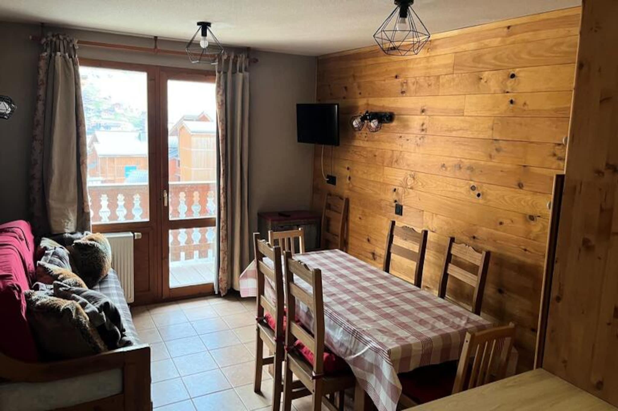 High above the vibrant resort of Val Thorens, Chalet No. 6 at Les Balcons offers a serene alpine retreat with breathtaking views of the surrounding peaks. Bathed in sunlight from its south/southwest-facing position, this charming apartment invites you to experience the magic of the mountains in every season. Whether you're gazing out from the balcony or exploring the slopes just steps away, every moment here feels like an escape into nature's grandeur. A free shuttle service ensures easy access to the resort's lively center, just a five-minute walk away, where shops, restaurants, and ski rentals await. \n\nSpanning 39m², this thoughtfully designed 2-room apartment comfortably accommodates up to six guests. The living room features a tiled floor, a cozy convertible sofa bed, and a television for relaxing evenings after a day of adventure. The kitchen is fully equipped with modern appliances, including an oven, microwave/grill, ceramic hob, refrigerator, dishwasher, and extractor fan, making it easy to prepare hearty meals. The sleeping arrangements include a bedroom with two single beds and a cabin with bunk beds, ensuring comfort for families or groups of friends. With both a bathroom and a separate shower room, as well as a separate toilet, the layout is practical and convenient. \n\nThe chalet's location is ideal for ski enthusiasts, with the slopes just a short distance away. Nearby facilities include ski rentals, grocery stores, and restaurants, providing everything you need for a seamless holiday. Free Wi-Fi keeps you connected, while paid parking is available for added convenience. In summer, the area transforms into a haven for hikers and nature lovers, with trails that lead to stunning vistas and alpine meadows. \n\nWhether you're seeking thrilling winter sports or tranquil summer escapes, Chalet No. 6 at Les Balcons is the perfect base for your Val Thorens adventure. Let the majestic mountains and warm alpine hospitality create memories that will last a lifetime.