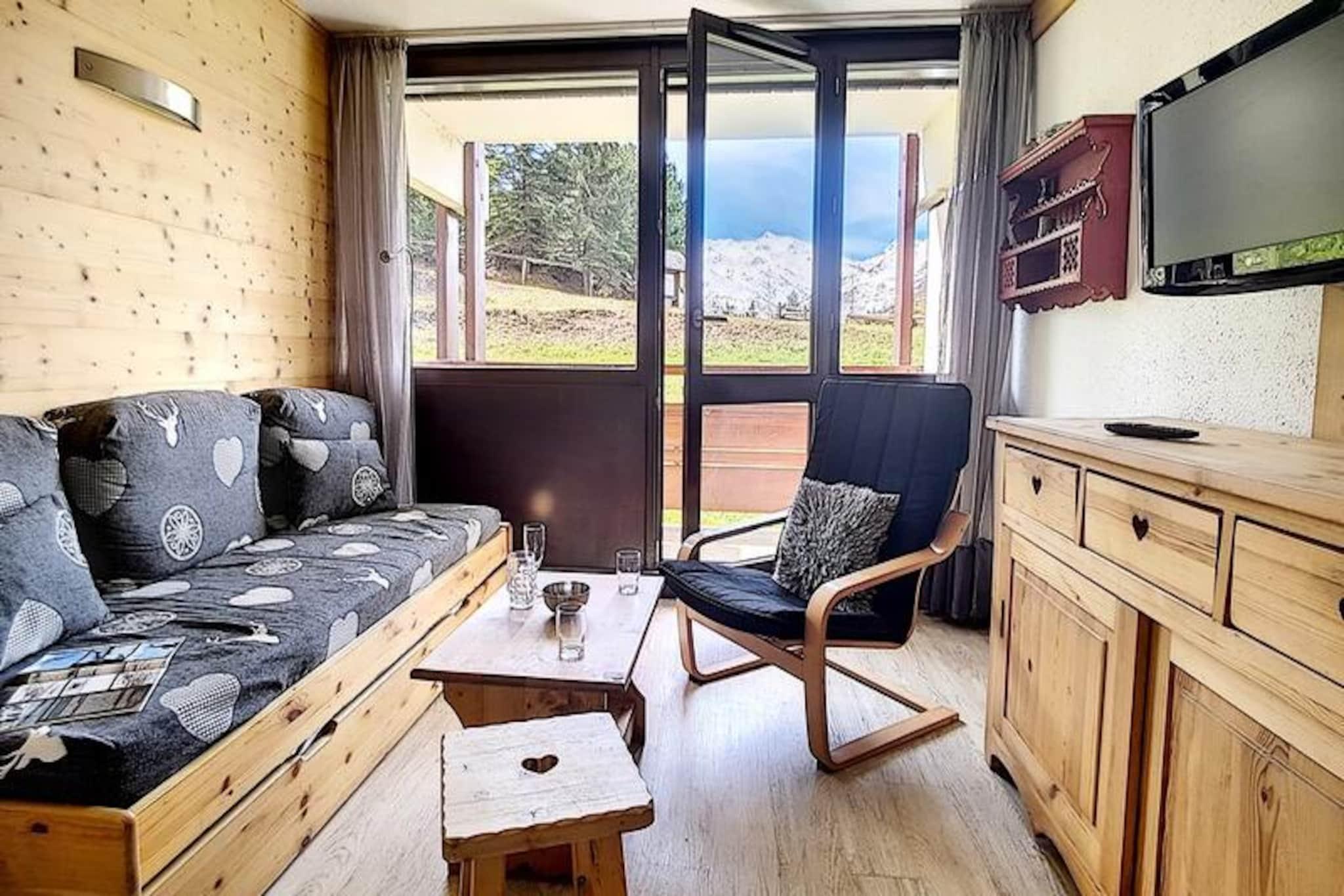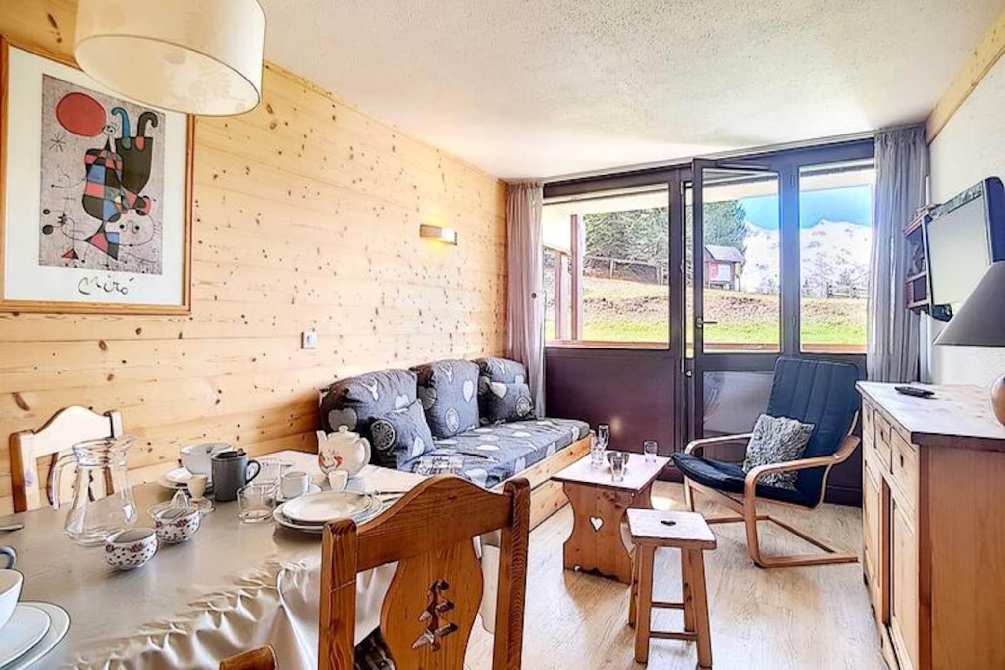 In the heart of the bustling resort center, this charming apartment in the Alpages building offers a cozy retreat for families and friends seeking a memorable alpine getaway. Just steps from the La Croisette shopping arcade and surrounded by the lively atmosphere of the French Alps, this residence combines convenience with comfort, making it an ideal base for exploring the slopes and local attractions. The south-facing balcony invites you to soak in the sunshine while enjoying views of the picturesque surroundings. \n\nThoughtfully renovated, the apartment spans 37 m² and accommodates up to six guests. The living room features a single sofa bed and a pull-out bed, perfect for relaxing after a day of adventure. A separate bedroom with a double bed and a sleeping alcove with bunk beds provide flexible sleeping arrangements. The fully equipped kitchen includes modern appliances such as a microwave, oven, dishwasher, and coffee maker, ensuring you have everything needed to prepare delicious meals. The bathroom with a bathtub and separate WC adds to the convenience, while the linoleum flooring throughout creates a clean and welcoming ambiance. \n\nLocated just 100 meters from the slopes and with ski lockers in the basement, this residence is perfect for winter sports enthusiasts. Families will appreciate the daycare and snow garden at the foot of the building, while the nearby bus stop and station offer easy access to explore the region. Whether you’re skiing, shopping, or simply relaxing, everything you need is within reach. \n\nWith its warm atmosphere, practical amenities, and unbeatable location, this apartment is your gateway to the enchanting charm of the French Alps. Create unforgettable memories in a setting that blends adventure, relaxation, and alpine beauty.