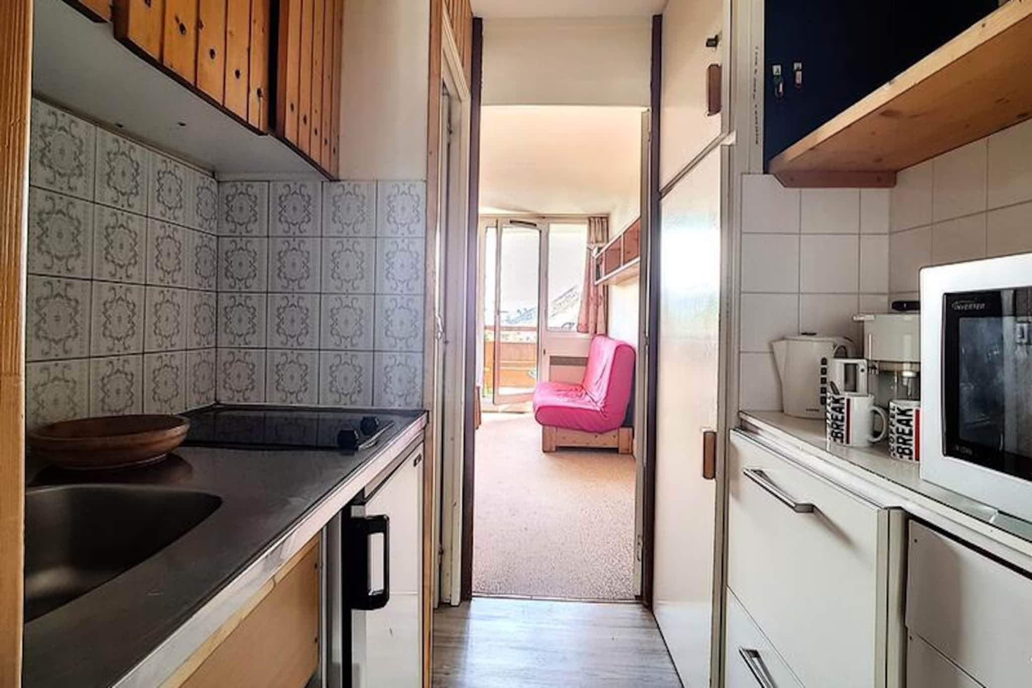 In the heart of the vibrant resort of Les Menuires, this charming apartment offers a perfect blend of comfort and convenience for your alpine getaway. Situated within the Alpages building, just steps from the La Croisette shopping arcade, it provides easy access to everything you need for a memorable holiday. Wake up to the cheerful sights of the Piou Piou children’s playground from your south-facing balcony, where the sun graces your mornings with warmth and light. Whether you’re here for skiing or simply to soak in the mountain air, this cozy retreat welcomes you with open arms. \n\nDesigned to accommodate up to six guests, the apartment features a thoughtfully arranged layout with a double sofa bed in the living room and two sets of bunk beds in the bedroom. The kitchen is fully equipped with modern appliances, including a cooktop, refrigerator, combination oven/microwave, toaster, kettle, and coffee maker, ensuring you can prepare hearty meals after a day of adventure. The bathroom includes a bathtub for relaxing soaks, while the separate toilet adds extra convenience. With duvets provided and electric heating throughout, you’ll stay warm and comfortable during your stay. Pets are welcome for an additional fee, making it ideal for families traveling with their furry friends. \n\nLocated just 100 meters from the slopes and 50 meters from a bus stop, the residence ensures seamless access to the region’s renowned ski areas and facilities. The children’s daycare and snow garden at the foot of the building make it particularly appealing for families, while the nearby bus station connects you to the wider Three Valleys ski domain. Paid Wi-Fi access is available, subject to coverage, allowing you to stay connected while enjoying the tranquility of the mountains. \n\nWhether you’re seeking thrilling days on the slopes or peaceful evenings under the alpine stars, this apartment offers the perfect base for creating unforgettable memories in Les Menuires. With its prime location and welcoming atmosphere, it’s an invitation to experience the magic of the French Alps in every season.