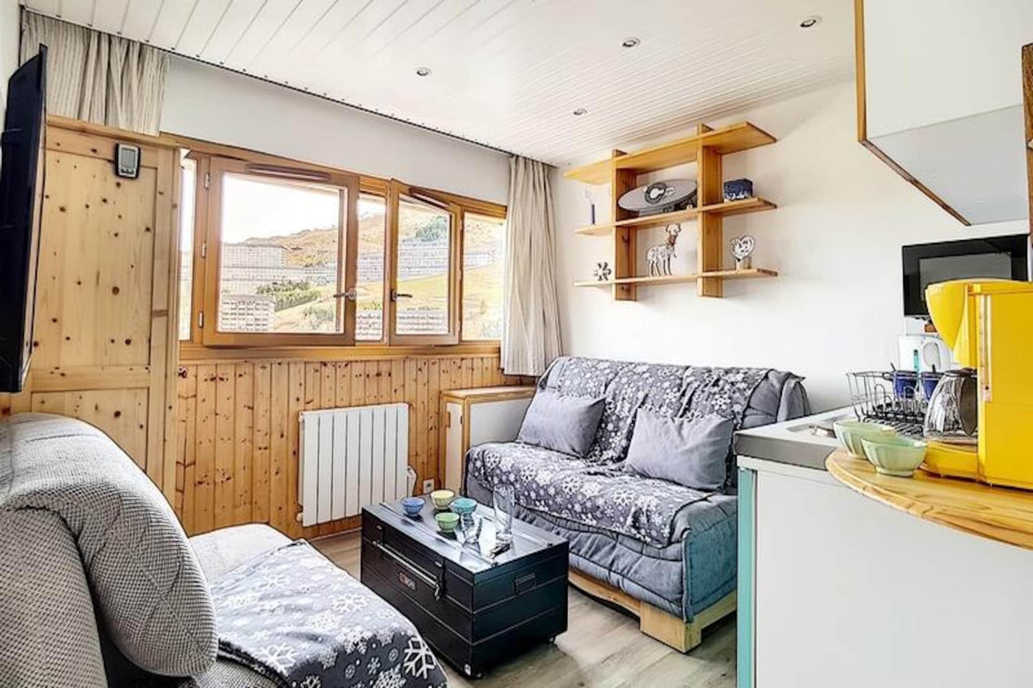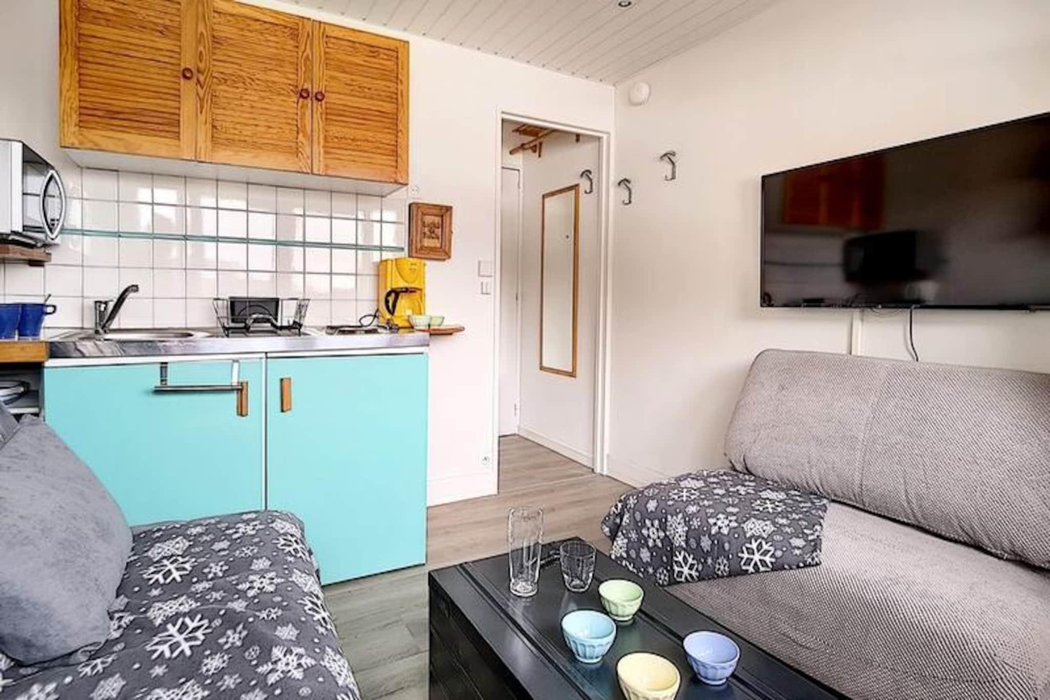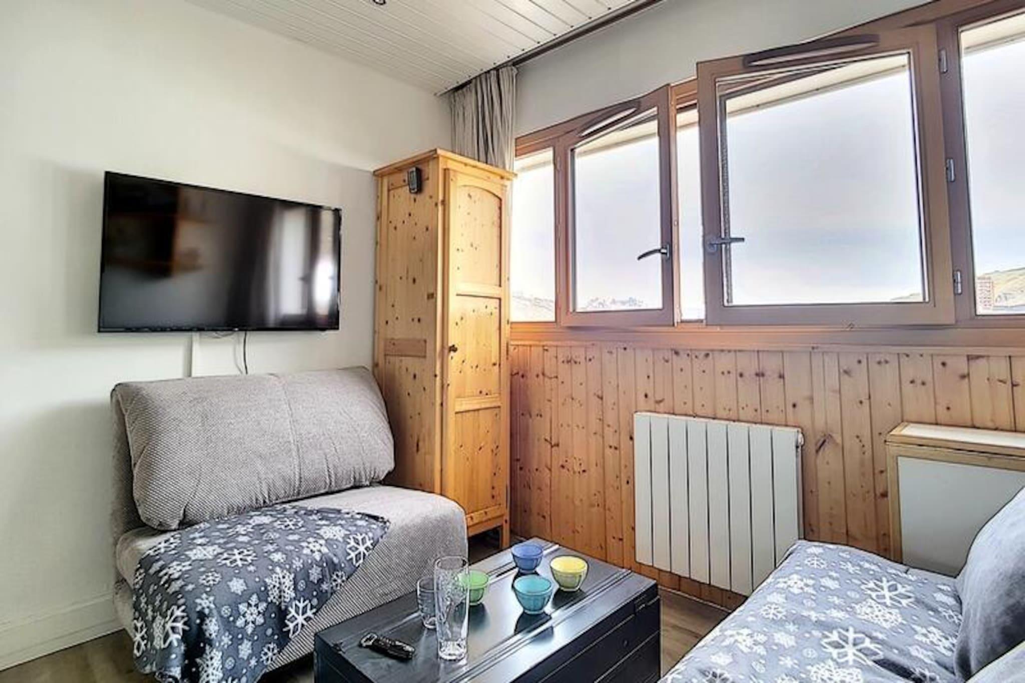 High above the picturesque Tarentaise Valley, this cozy studio apartment offers a serene alpine retreat in the heart of the resort. With its location just 50 meters from the La Croisette shopping arcade and a short 100-meter stroll to the slopes, this property is perfect for couples seeking a convenient and peaceful getaway. The charming surroundings, combined with the ease of access to the resort’s amenities, make it an ideal base for exploring the French Alps in both winter and summer seasons. The studio, located on the 7th floor of the Alpages building, is thoughtfully designed to maximize comfort within its 12m² space. The living area features a sofa bed that easily converts into a double bed, complemented by a flat-screen TV for cozy evenings in. The compact kitchen is equipped with essentials, including a refrigerator, two electric hobs, a combination microwave/oven, a coffee maker, and an electric kettle, ensuring you have everything needed to prepare simple meals. The bathroom includes a small bathtub/shower and toilet, providing all the necessities for a comfortable stay. Families will appreciate the convenience of a children’s daycare and snow garden located right at the foot of the building. The nearby bus stop, just 50 meters away, and the bus station, a mere 2-minute ride, ensure seamless connectivity to the wider area. For ski enthusiasts, the property’s proximity to the slopes and ski lockers in the basement make it a practical choice. Whether you’re here to carve through pristine snow or to enjoy the vibrant summer landscapes, this studio offers a cozy and functional retreat. With its welcoming atmosphere, pet-friendly policy, and proximity to key facilities, it’s the perfect spot to create lasting alpine memories.