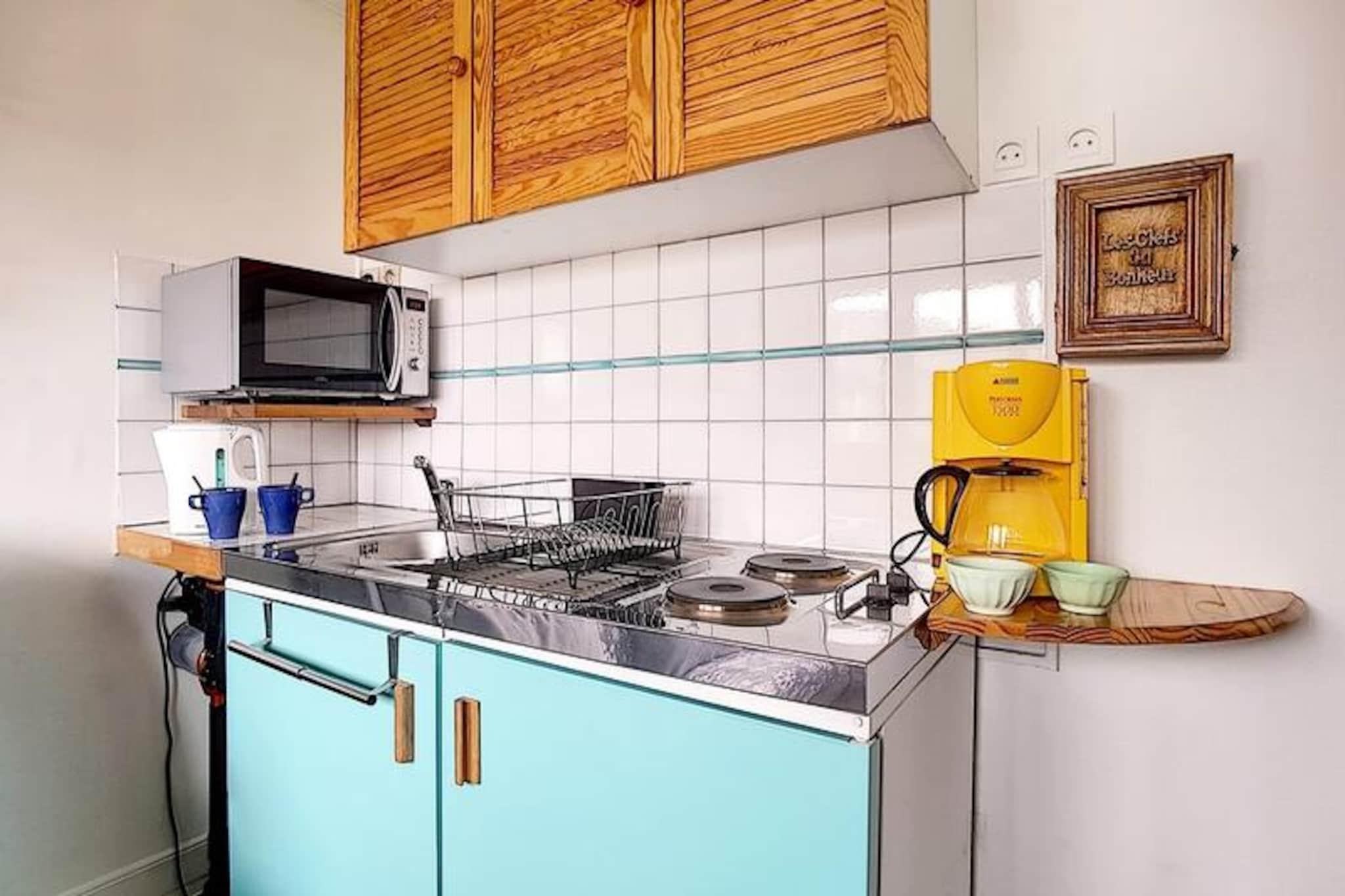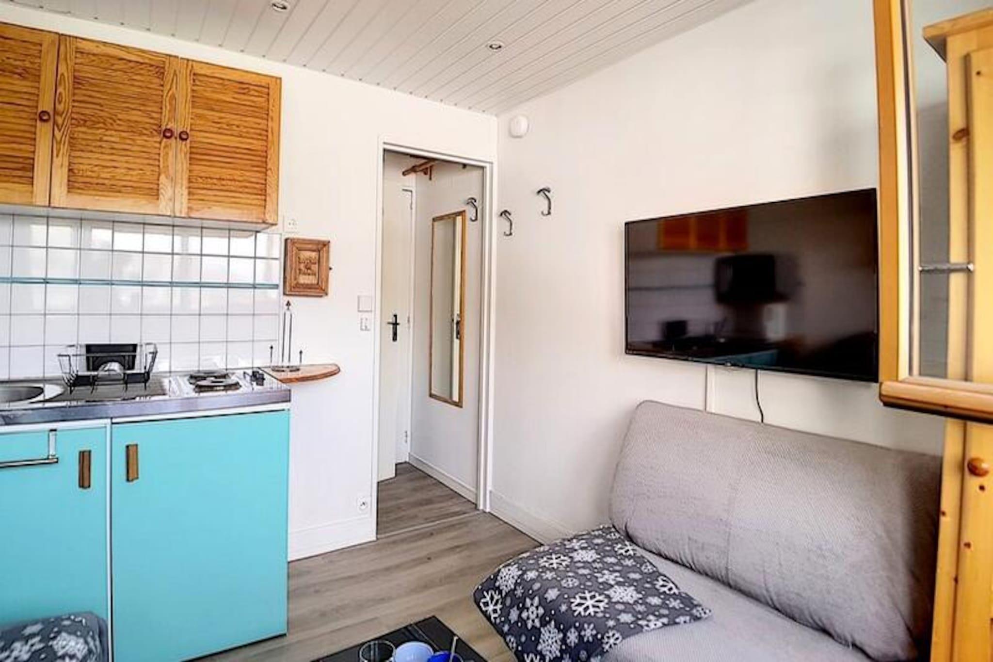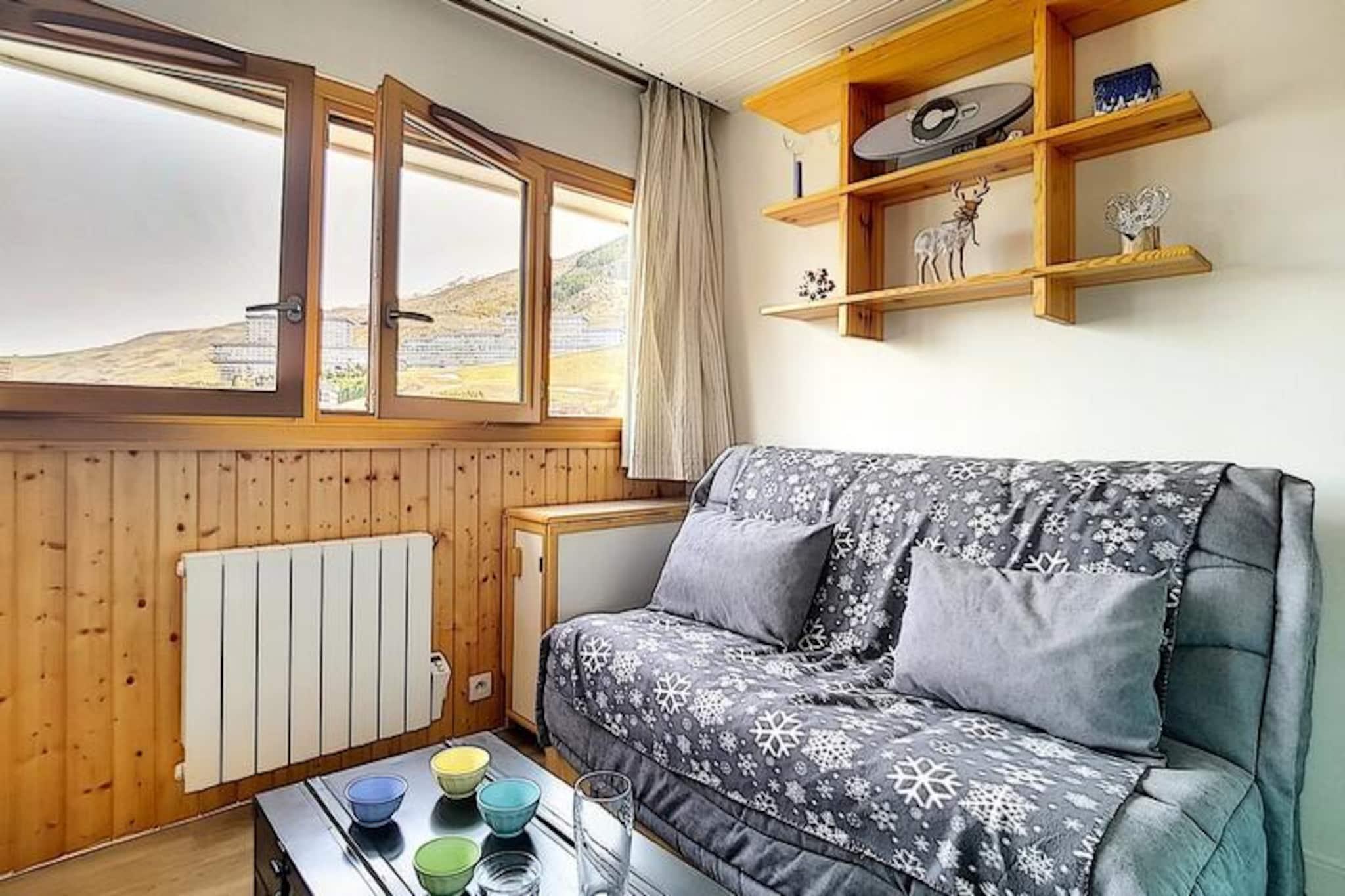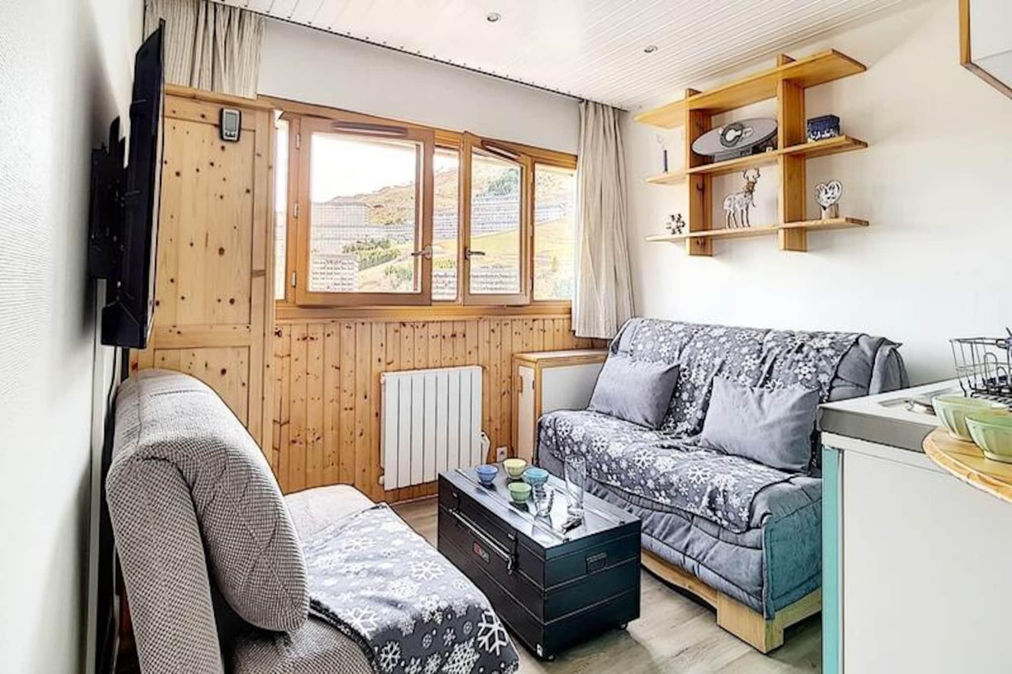 High above the picturesque Tarentaise Valley, this cozy studio apartment offers a serene alpine retreat in the heart of the resort. With its location just 50 meters from the La Croisette shopping arcade and a short 100-meter stroll to the slopes, this property is perfect for couples seeking a convenient and peaceful getaway. The charming surroundings, combined with the ease of access to the resort’s amenities, make it an ideal base for exploring the French Alps in both winter and summer seasons. The studio, located on the 7th floor of the Alpages building, is thoughtfully designed to maximize comfort within its 12m² space. The living area features a sofa bed that easily converts into a double bed, complemented by a flat-screen TV for cozy evenings in. The compact kitchen is equipped with essentials, including a refrigerator, two electric hobs, a combination microwave/oven, a coffee maker, and an electric kettle, ensuring you have everything needed to prepare simple meals. The bathroom includes a small bathtub/shower and toilet, providing all the necessities for a comfortable stay. Families will appreciate the convenience of a children’s daycare and snow garden located right at the foot of the building. The nearby bus stop, just 50 meters away, and the bus station, a mere 2-minute ride, ensure seamless connectivity to the wider area. For ski enthusiasts, the property’s proximity to the slopes and ski lockers in the basement make it a practical choice. Whether you’re here to carve through pristine snow or to enjoy the vibrant summer landscapes, this studio offers a cozy and functional retreat. With its welcoming atmosphere, pet-friendly policy, and proximity to key facilities, it’s the perfect spot to create lasting alpine memories.