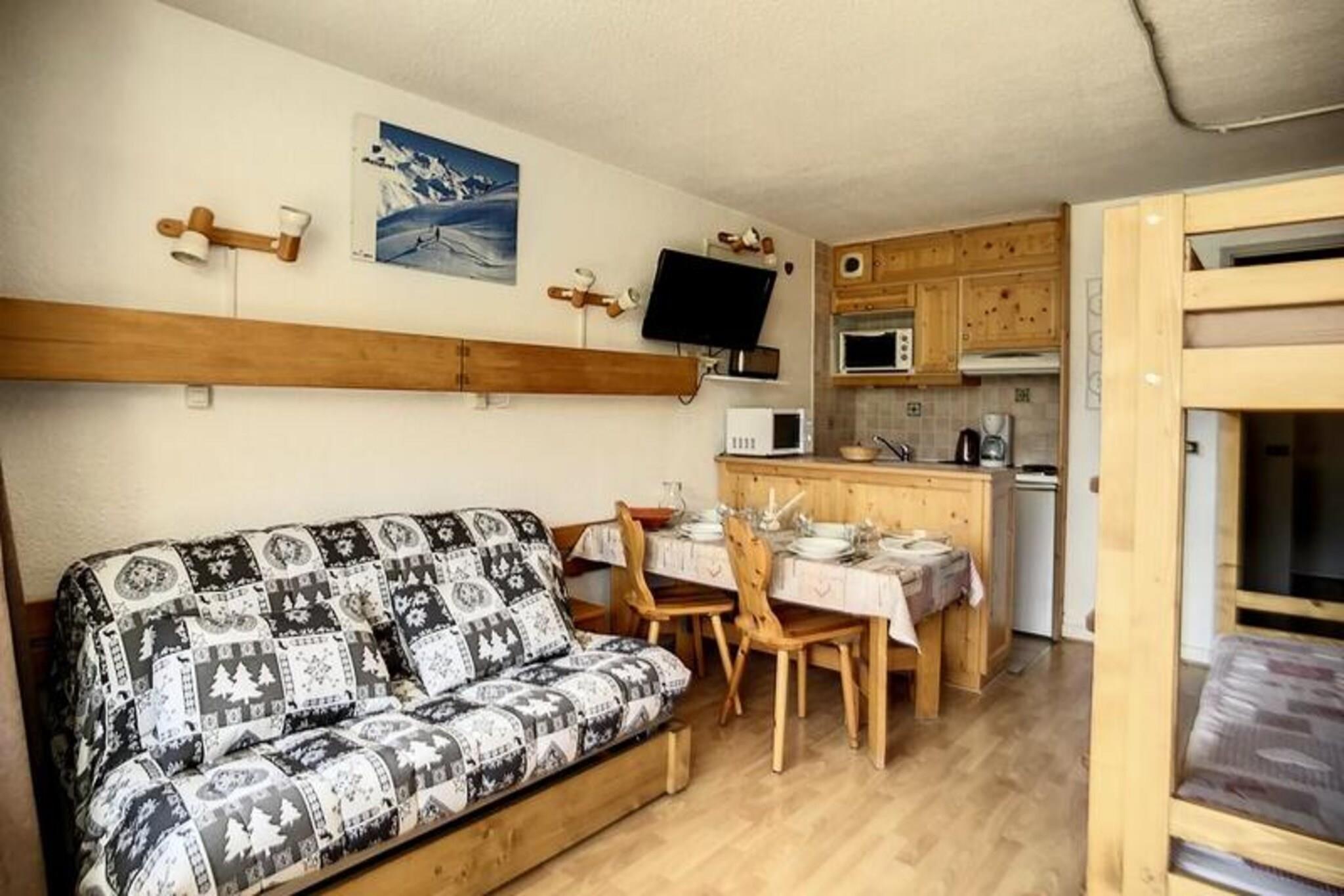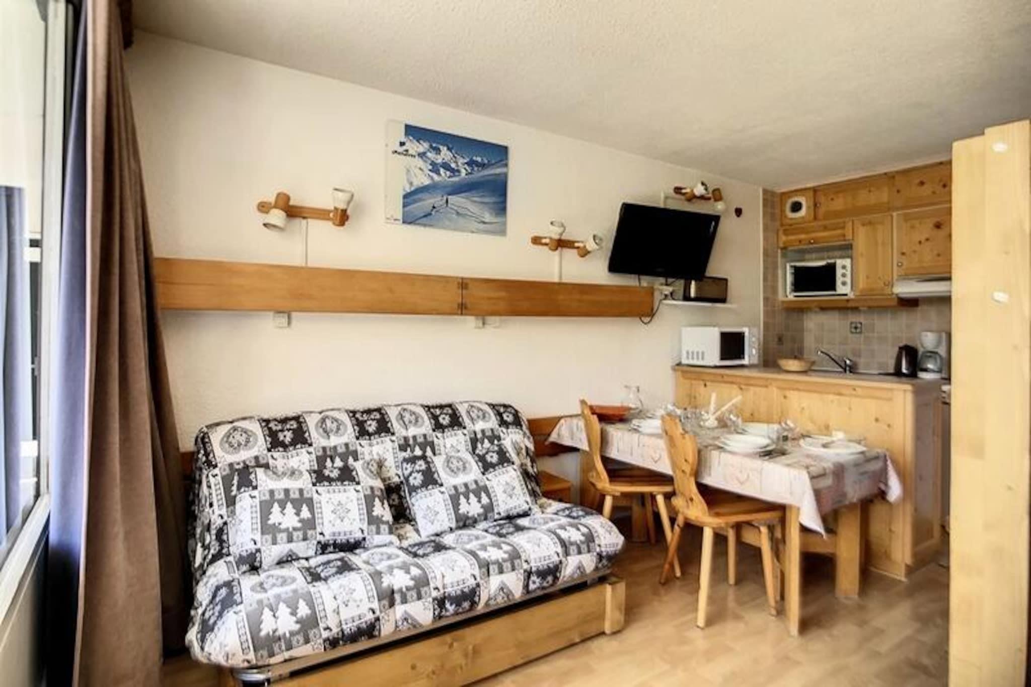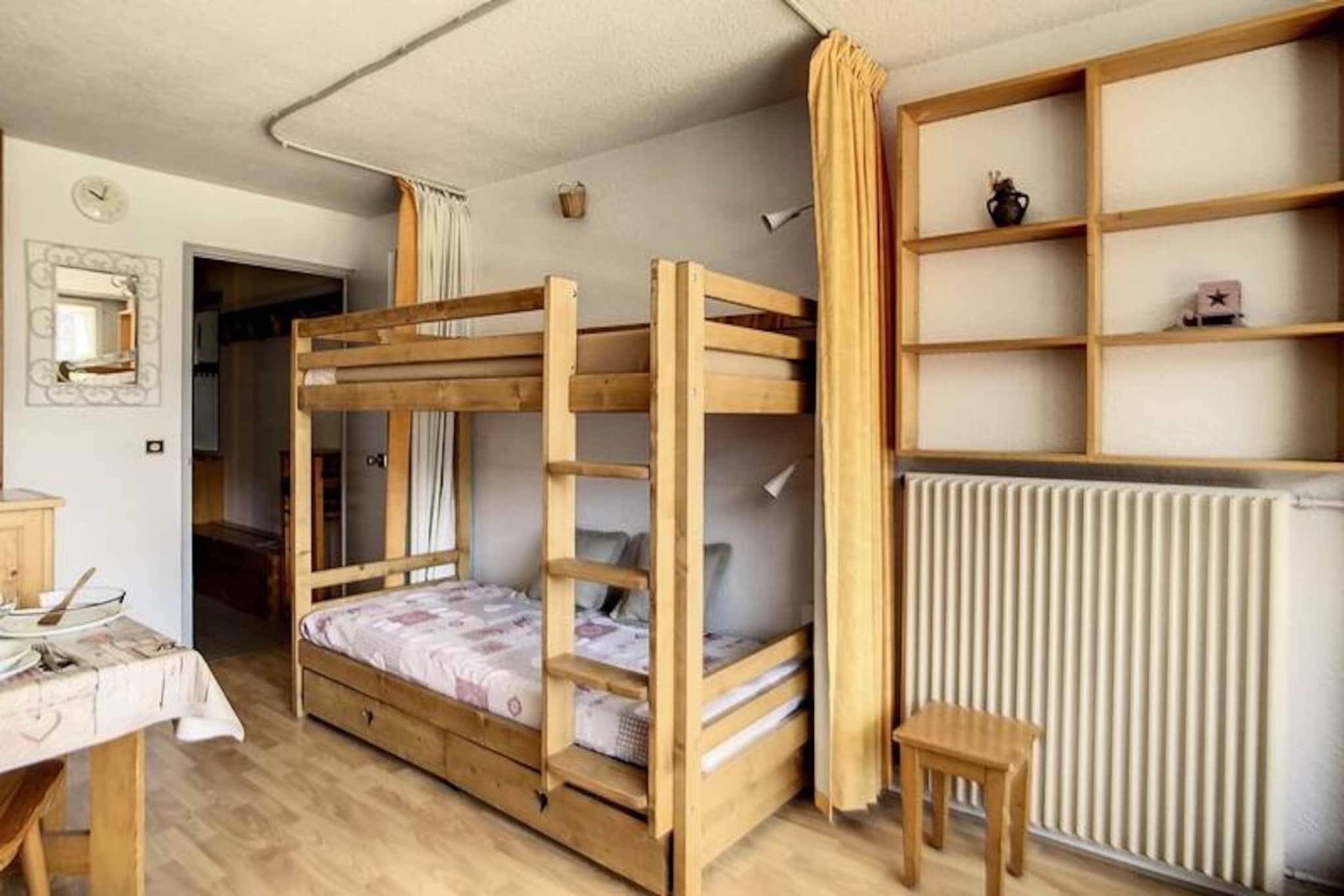 In the heart of the vibrant La Croisette district, this charming studio apartment invites you to experience the magic of the French Alps. With direct access to the slopes and a convenient connection to the shopping arcade located just below, this property is a haven for ski enthusiasts and those seeking a cozy alpine retreat. Imagine stepping out of your door and onto the snow, ready to carve your way through the pristine slopes of the region, all while enjoying the convenience of nearby amenities. The south-facing balcony on the third floor offers a delightful spot to soak in the mountain views and bask in the alpine sunshine. \n\nThis 24 m² studio is thoughtfully designed to accommodate up to four guests. The living area features two bunk beds and a comfortable sofa bed for two, making it ideal for families or small groups. The fully equipped kitchen includes everything you need to prepare hearty meals after a day on the slopes, from a refrigerator and oven to a dishwasher and coffee maker. The apartment also boasts a bathroom with a bathtub, a separate toilet, parquet flooring, and modern conveniences such as a television and a washing machine. Please note that the bunk beds are not suitable for children under six years old, and the property is non-smoking and pet-free. \n\nThe Chavière residence is perfectly positioned for convenience and adventure. Free outdoor parking is available at the foot of the building (subject to availability), and the daycare center is just 300 meters away, making it an excellent choice for families. Paid Wi-Fi access is also available for those who wish to stay connected. Whether you're here to ski, explore, or simply relax, this cozy alpine studio offers the perfect base for your mountain getaway. With its unbeatable location and warm ambiance, it promises an unforgettable stay in the heart of the Alps.