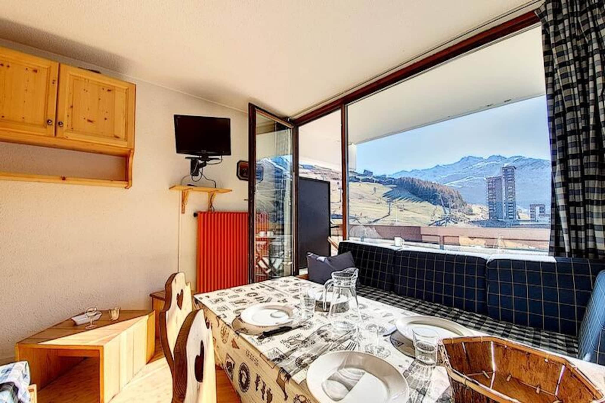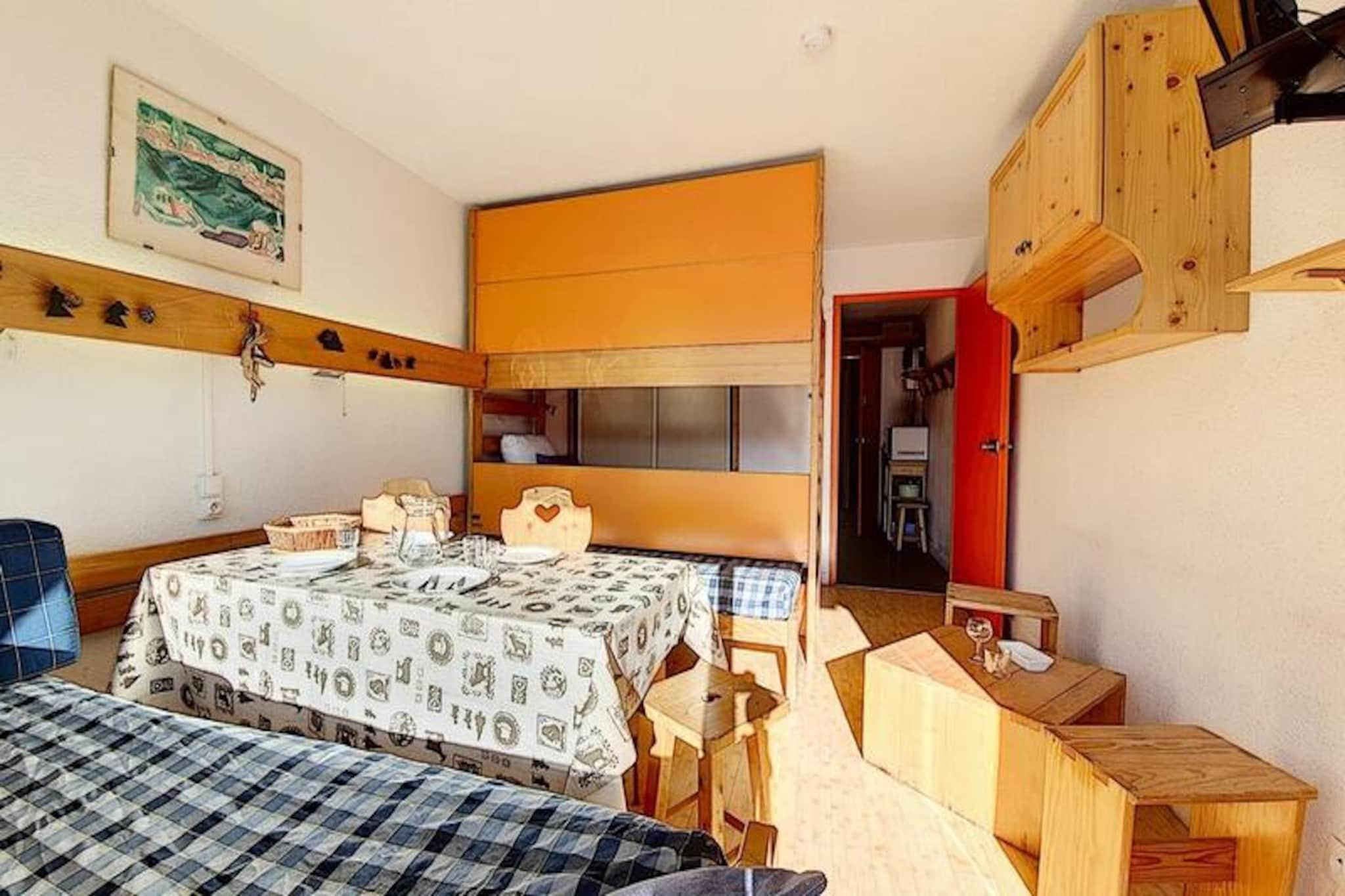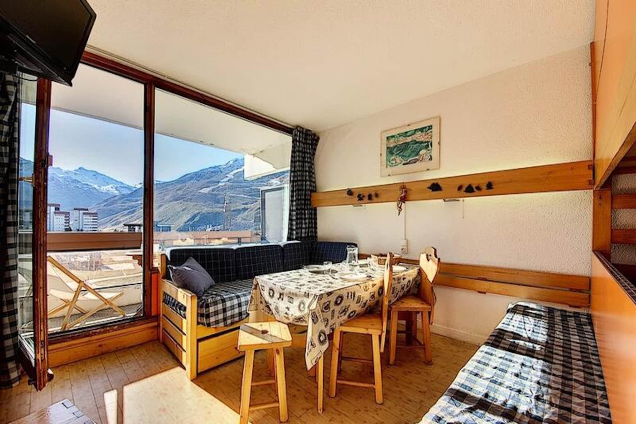 High above the serene La Croisette district, this charming studio apartment offers a cozy alpine retreat with direct access to the slopes. Imagine stepping out of your building and instantly finding yourself amidst the snowy trails, ready for a day of adventure. The Chavière residence also connects directly to a convenient shopping arcade, making it easy to grab essentials or enjoy a leisurely stroll after a day on the mountain. With free outdoor parking at the foot of the building (subject to availability), your arrival and departure are as seamless as your stay. Located on the 5th floor with elevator access, this 24m² studio is thoughtfully designed to accommodate up to 4 guests. The living area features two single bunk beds, a single sofa bed, and a pull-out bed, offering flexible sleeping arrangements for families or small groups. A south-facing balcony provides stunning slope views, perfect for soaking in the alpine atmosphere. The apartment is equipped with a television, DVD player, and a compact yet functional kitchen that includes a two-burner cooktop, refrigerator, mini-oven, mini-dishwasher, toaster, kettle, and coffee maker. Linoleum flooring throughout ensures a clean and practical space, while blankets and duvets add a touch of warmth and comfort. Beyond the apartment, the La Croisette district offers a family-friendly ambiance with a daycare center just 300 meters away. Whether you're here for skiing, snowboarding, or simply to relax, the location ensures you're never far from the action. Paid Wi-Fi access (subject to network coverage) keeps you connected, while the non-smoking policy guarantees a fresh and pleasant environment. Please note, the bunk beds are not suitable for children under 6 years old. For those seeking a convenient and cozy base in the heart of the French Alps, this studio apartment in the Chavière residence is an ideal choice. With its unbeatable location, thoughtful amenities, and breathtaking views, it promises a memorable mountain getaway.