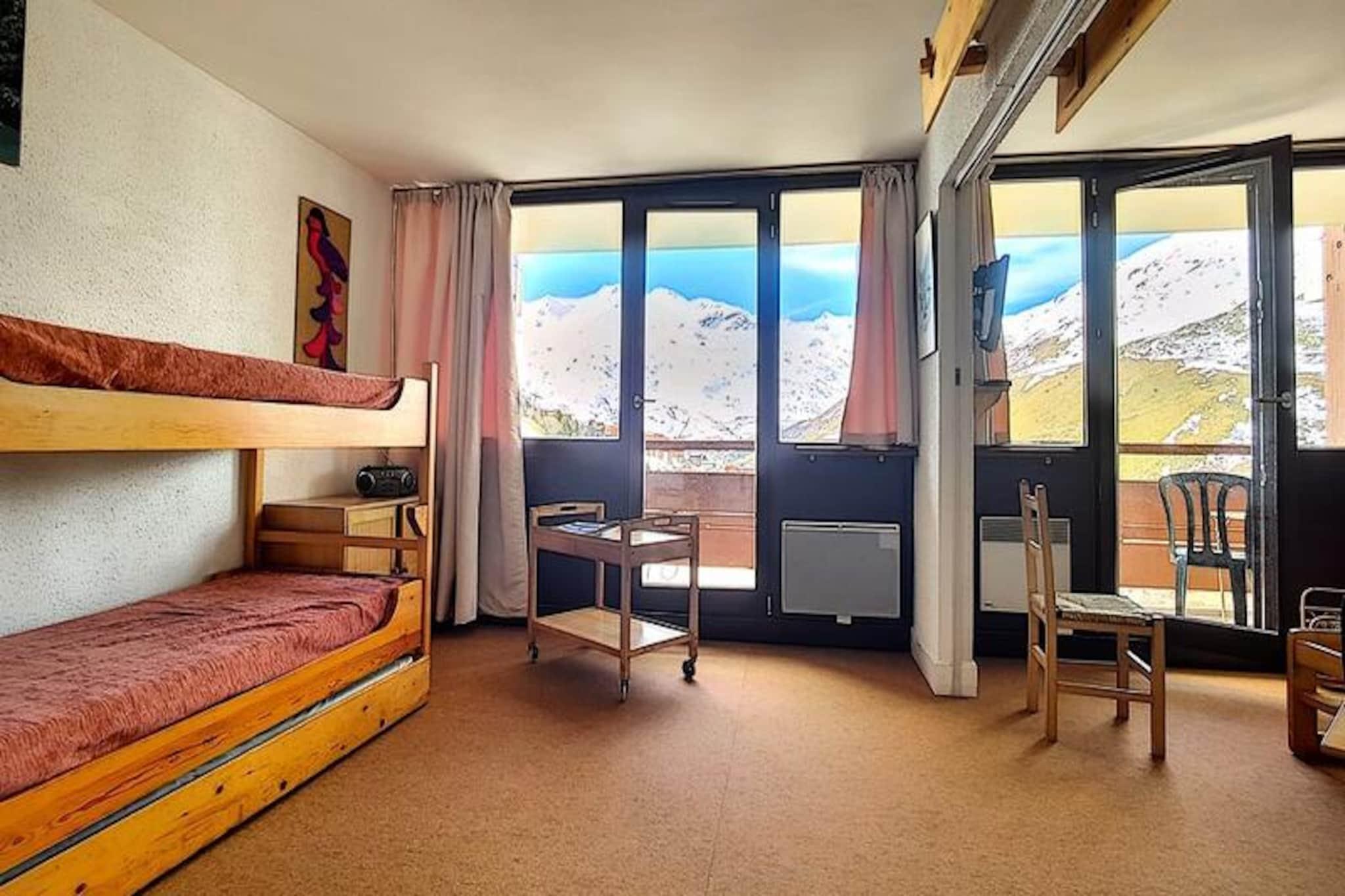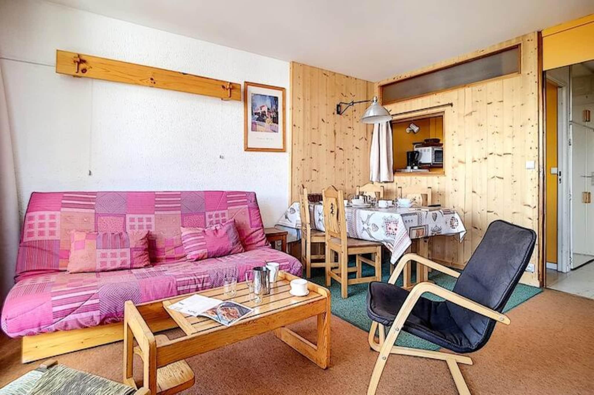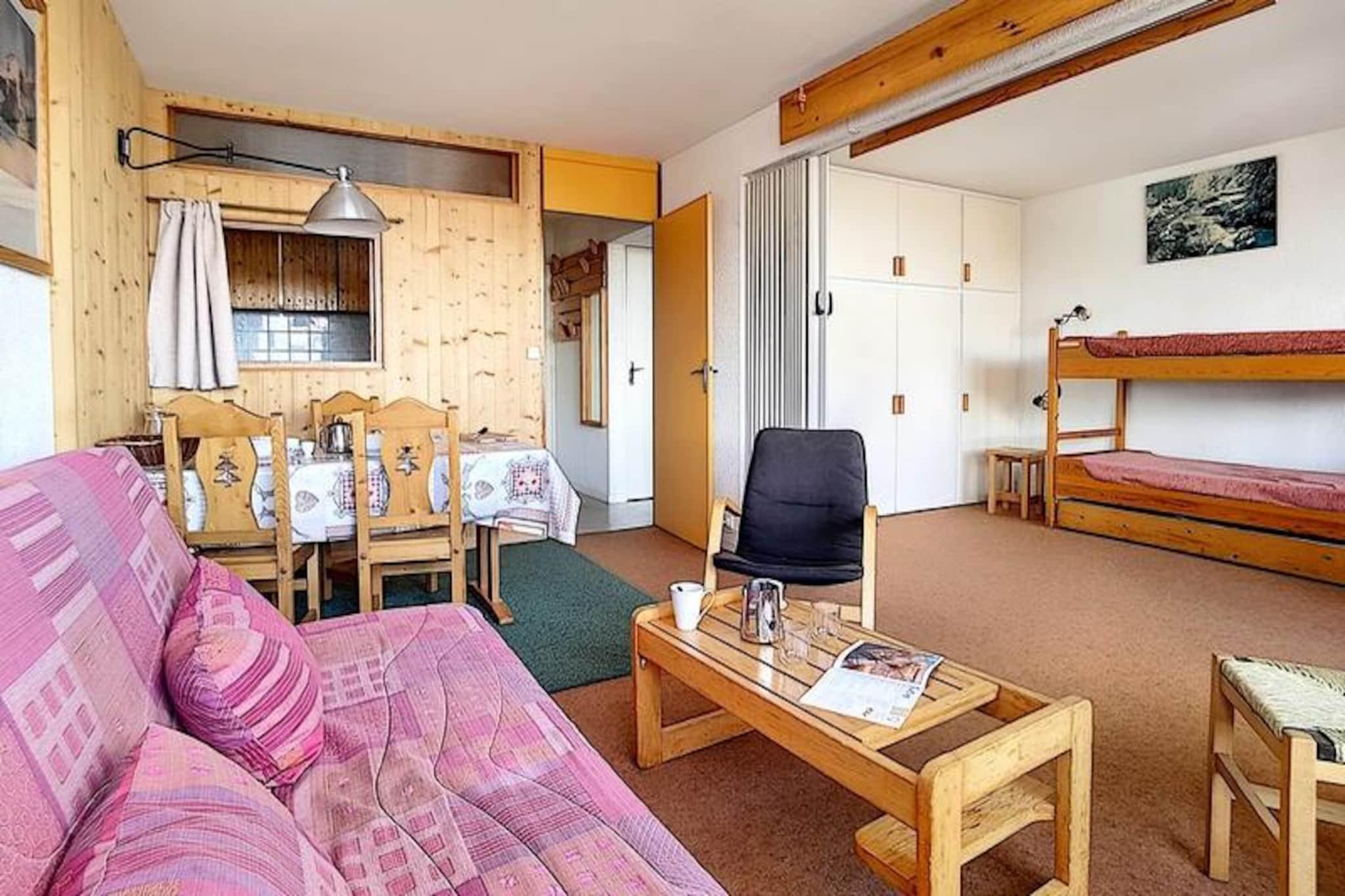 High above the bustling streets of La Croisette, this charming two-room apartment offers an inviting retreat in the heart of the resort. With its south-facing balcony on the 7th floor, guests can soak in the alpine sun and enjoy panoramic views of the surrounding peaks. Perfect for families or small groups, this cozy space combines comfort with convenience, making it an ideal base for exploring the snowy slopes just 100 meters away or the vibrant shopping arcade only steps from the building. Whether you're here to ski, relax, or simply immerse yourself in the mountain atmosphere, this apartment provides the perfect setting for your holiday. \n\nInside, the apartment is thoughtfully designed to accommodate up to five guests. The living room features a comfortable double sofa bed and a flat-screen TV, creating a warm and inviting space to unwind after a day of adventure. The bedroom, separated by a folding partition, offers flexible sleeping arrangements with two single bunk beds and a pull-out bed. A well-equipped kitchen includes everything you need to prepare meals, from a cooktop and refrigerator to a microwave, mini-oven, and coffee maker. The bathroom features a bathtub for relaxing soaks, while a separate toilet adds extra convenience. \n\nThe Alpages building itself is a hub of convenience, with ski lockers in the basement, electric heating, and elevator access. Families will appreciate the daycare and snow garden located right at the foot of the building, while the nearby bus stop ensures easy access to the bus station just two minutes away. Pets are welcome for an additional fee, and paid Wi-Fi is available, subject to coverage. \n\nWhether you're drawn to the slopes, the lively shopping arcade, or the serene mountain views, this apartment offers a welcoming home base for your alpine escape. Let the charm of the French Alps and the convenience of this central location create unforgettable memories for your next holiday.