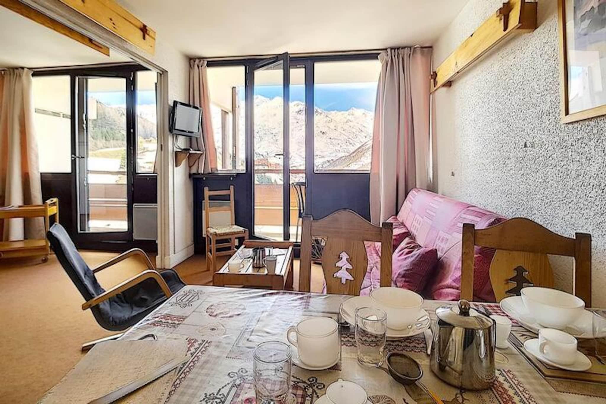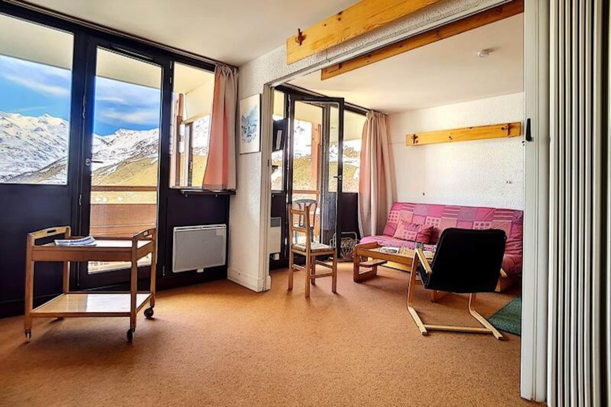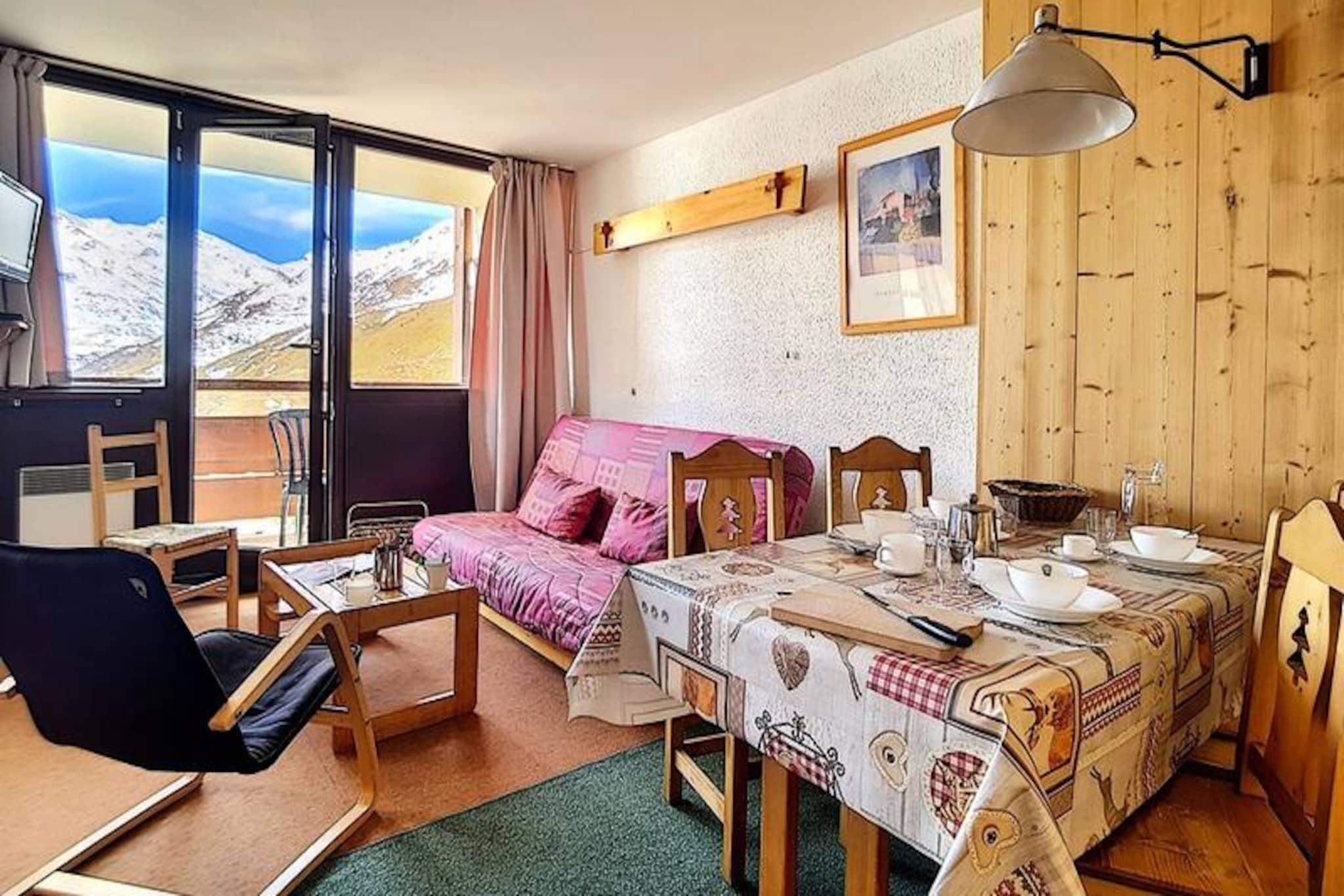 High above the bustling streets of La Croisette, this charming two-room apartment offers an inviting retreat in the heart of the resort. With its south-facing balcony on the 7th floor, guests can soak in the alpine sun and enjoy panoramic views of the surrounding peaks. Perfect for families or small groups, this cozy space combines comfort with convenience, making it an ideal base for exploring the snowy slopes just 100 meters away or the vibrant shopping arcade only steps from the building. Whether you're here to ski, relax, or simply immerse yourself in the mountain atmosphere, this apartment provides the perfect setting for your holiday. \n\nInside, the apartment is thoughtfully designed to accommodate up to five guests. The living room features a comfortable double sofa bed and a flat-screen TV, creating a warm and inviting space to unwind after a day of adventure. The bedroom, separated by a folding partition, offers flexible sleeping arrangements with two single bunk beds and a pull-out bed. A well-equipped kitchen includes everything you need to prepare meals, from a cooktop and refrigerator to a microwave, mini-oven, and coffee maker. The bathroom features a bathtub for relaxing soaks, while a separate toilet adds extra convenience. \n\nThe Alpages building itself is a hub of convenience, with ski lockers in the basement, electric heating, and elevator access. Families will appreciate the daycare and snow garden located right at the foot of the building, while the nearby bus stop ensures easy access to the bus station just two minutes away. Pets are welcome for an additional fee, and paid Wi-Fi is available, subject to coverage. \n\nWhether you're drawn to the slopes, the lively shopping arcade, or the serene mountain views, this apartment offers a welcoming home base for your alpine escape. Let the charm of the French Alps and the convenience of this central location create unforgettable memories for your next holiday.