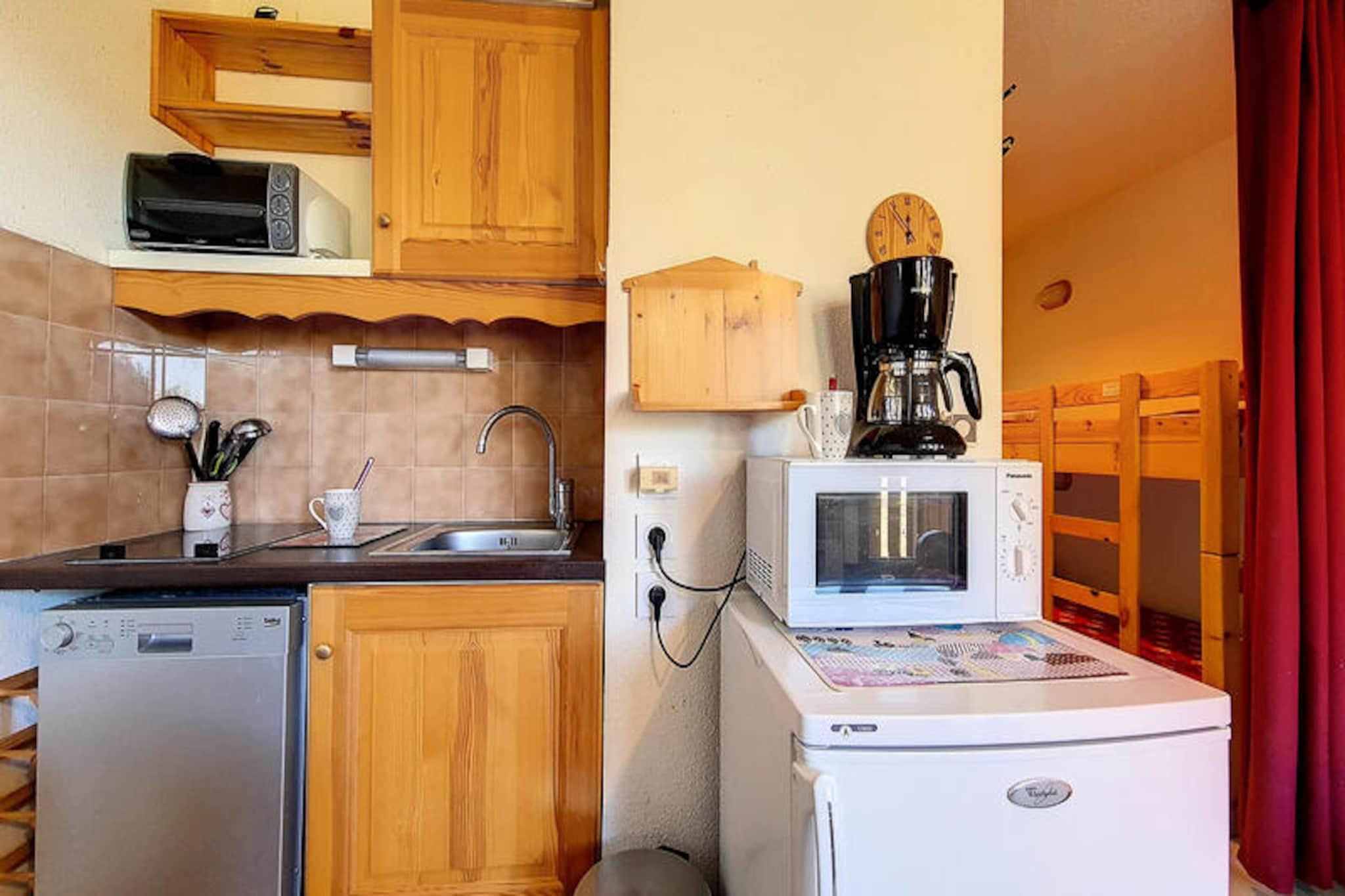 High in the heart of the French Alps, where snow-dusted peaks meet the charm of alpine villages, this cozy studio apartment in the Ski Soleil residence offers an inviting retreat for your mountain adventures. Located in the Bruyères district, the residence places you at the foot of the slopes, ensuring effortless access to winter sports and summer hikes alike. Imagine mornings spent sipping coffee on your north-facing balcony, watching the serene alpine landscape unfold before you. Whether you’re here for thrilling descents or tranquil mountain escapes, this property promises a memorable stay. \n\nInside, the 23 m² studio is thoughtfully designed to accommodate up to four guests. The living room features a comfortable double sofa bed, while a sleeping alcove with two single bunk beds provides additional space. A well-equipped kitchen awaits your culinary creativity, complete with ceramic hob, mini-oven, microwave, dishwasher, and more. The bathroom includes a relaxing bathtub, and a separate WC adds convenience. With laminate flooring throughout, a television, DVD player, and paid Wi-Fi access, every detail has been considered to ensure comfort and practicality. Please note that pets are not allowed, and the bunk beds are unsuitable for children under six years old. \n\nStep outside and discover the vibrant Bruyères district, brimming with amenities to enhance your stay. From restaurants and shops to a cinema and wellness center, everything you need is just moments away. Families will appreciate the ski school, toboggan run, and children’s playground, while adventurers can explore the slopes and trails right from the doorstep. Whether you’re seeking alpine thrills or peaceful relaxation, this studio offers the perfect base for your French mountain getaway.