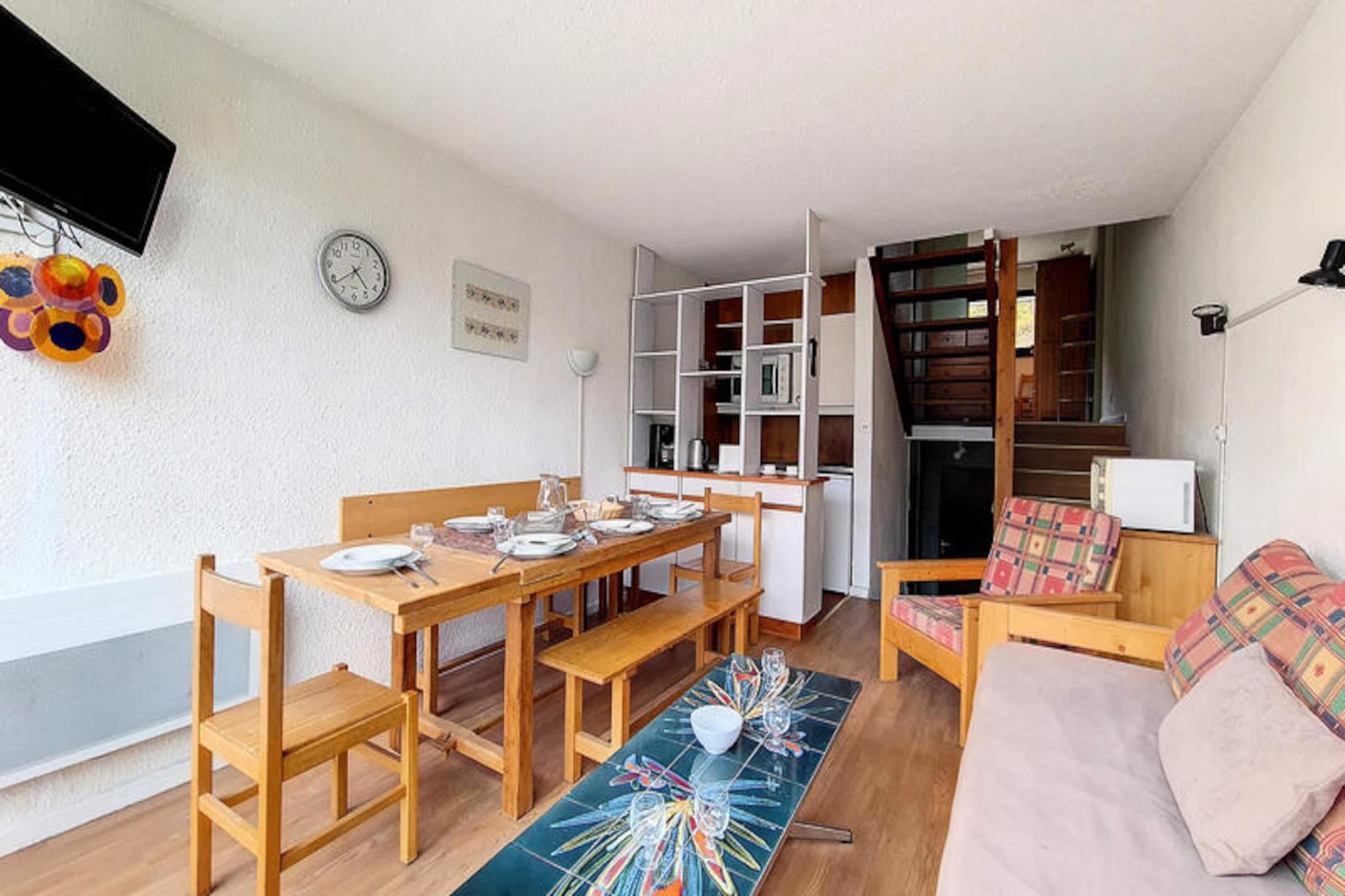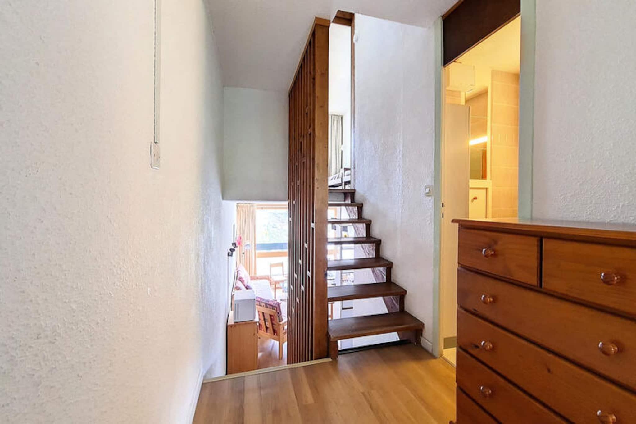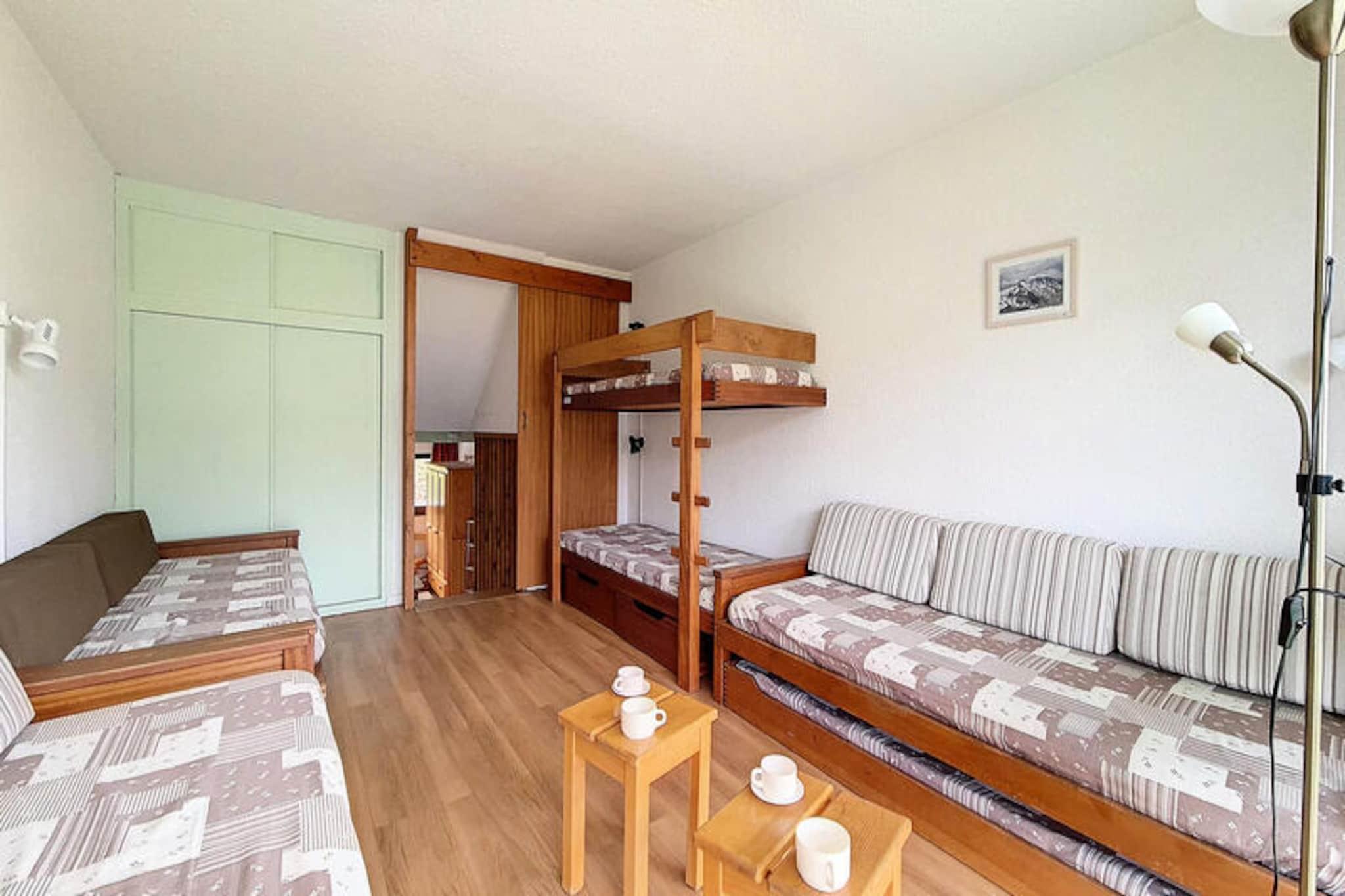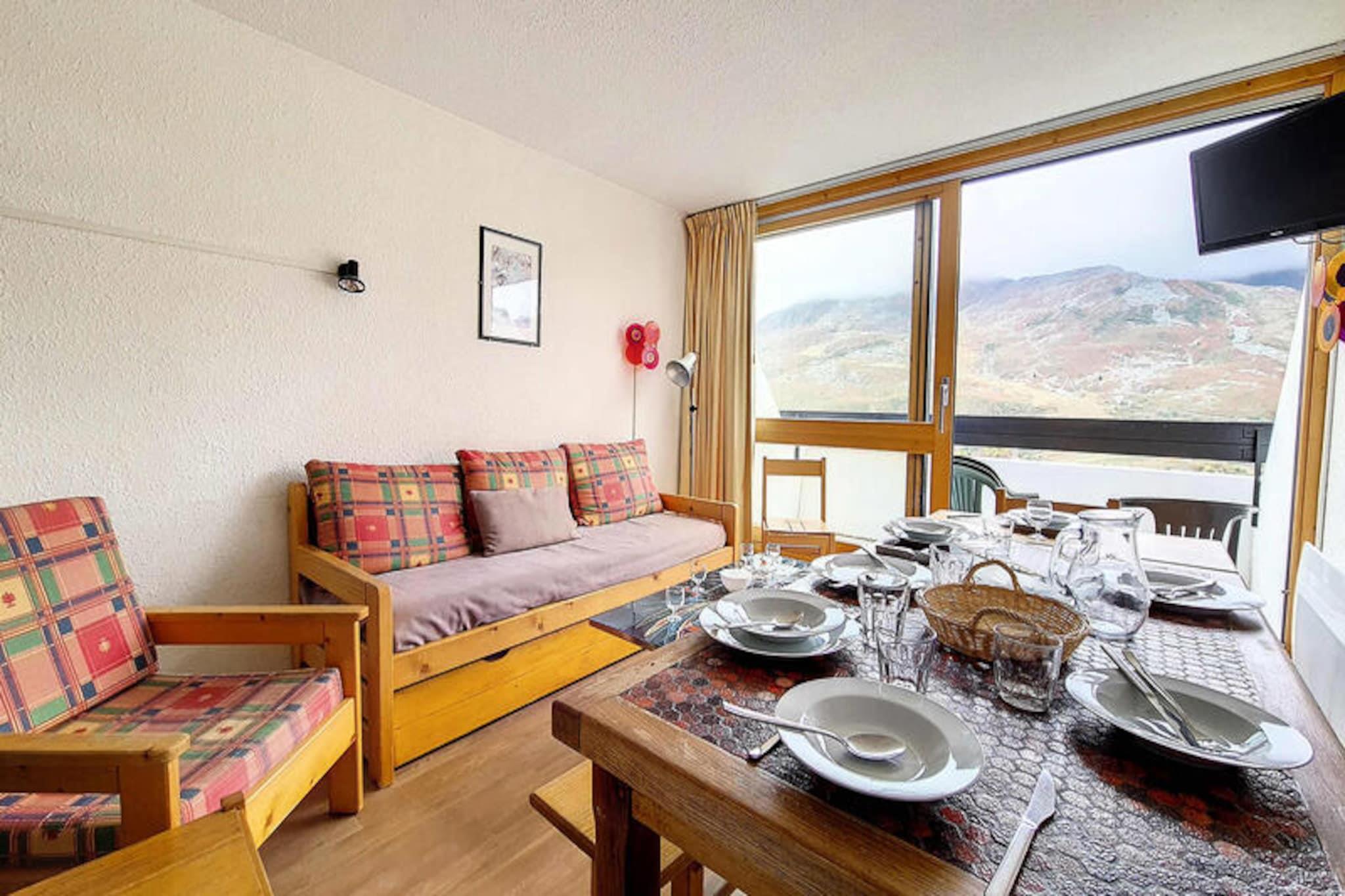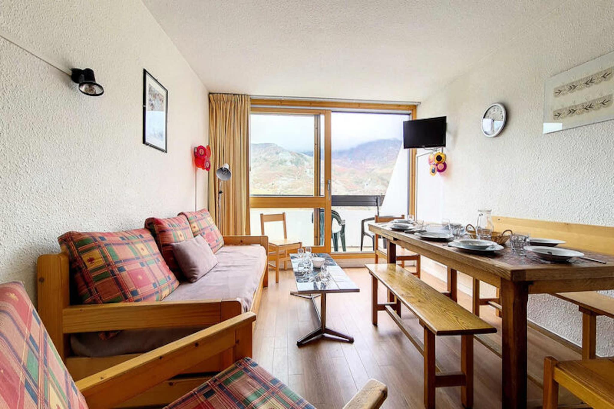 High above the vibrant Les Menuires resort, the Brelin building offers a unique vantage point with panoramic views and direct access to the slopes. Imagine waking up to the sunlit peaks of the French Alps from your southwest-facing balcony, where the crisp mountain air sets the tone for a day of adventure. Conveniently located above the La Croisette district, the property is connected by 24/7 public elevators, ensuring easy access to the heart of the resort at any time. Whether you're here for skiing or simply to soak in the alpine charm, this triplex apartment is a cozy retreat for families and groups alike. \n\nSpanning 55 m², the apartment comfortably accommodates up to eight guests across three thoughtfully designed rooms. The living room, with its warm carpeted flooring, features a single sofa bed and a pull-out bed, perfect for relaxing evenings with a movie on the TV or a DVD. The two bedrooms offer flexible sleeping arrangements, including a double bed in one and a mix of single and bunk beds in the other, ideal for children and adults alike. The fully equipped kitchen invites you to prepare hearty meals with modern appliances like a dishwasher, oven, microwave, and more. A separate bathroom with a bathtub and a separate toilet add to the convenience, while duvets are provided for a snug night's sleep. \n\nThe Brelin building itself boasts excellent amenities, including ski lockers at the ski-in/ski-out level and a shopping arcade with ticket offices for the ski lifts. Free parking at the Nant Benoit lift ensures hassle-free arrivals, while paid Wi-Fi access keeps you connected during your stay. The location is perfect for exploring the slopes or enjoying the lively atmosphere of Les Menuires, with shops, restaurants, and après-ski options just moments away. \n\nWhether you're seeking thrilling winter sports or serene summer hikes, this apartment offers a welcoming base to create unforgettable alpine memories. With its exceptional views, convenient facilities, and cozy ambiance, it’s the ideal choice for your next mountain getaway.