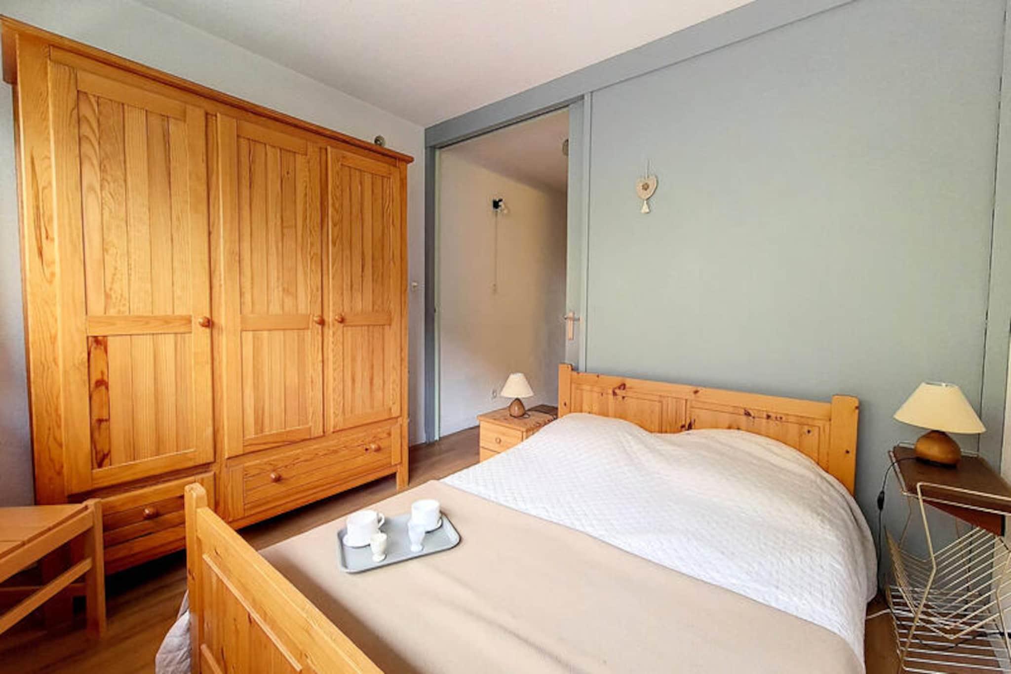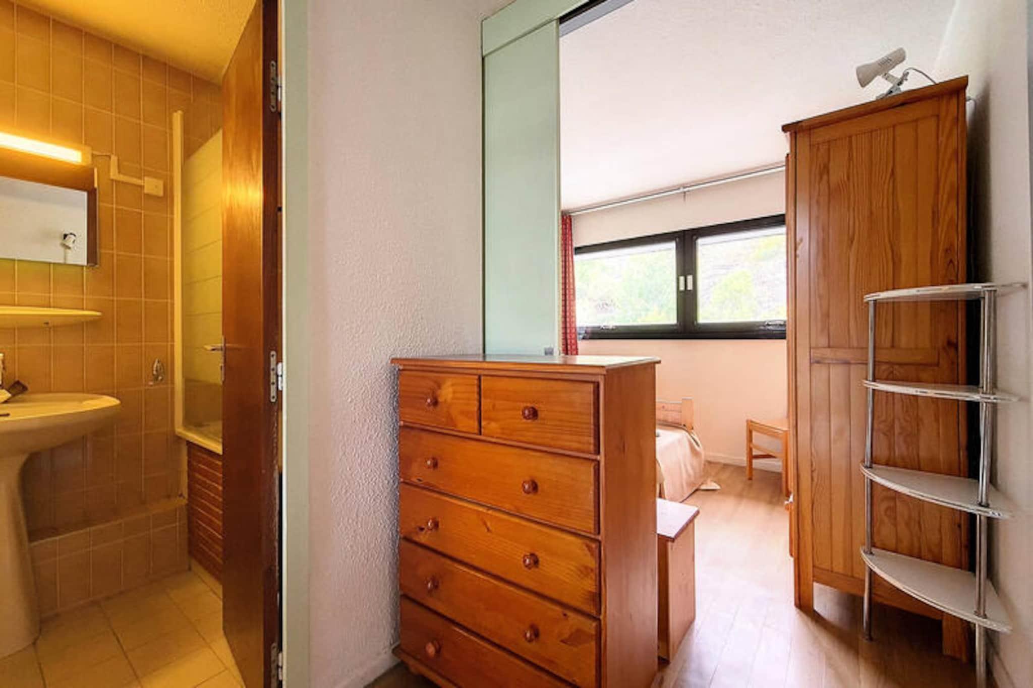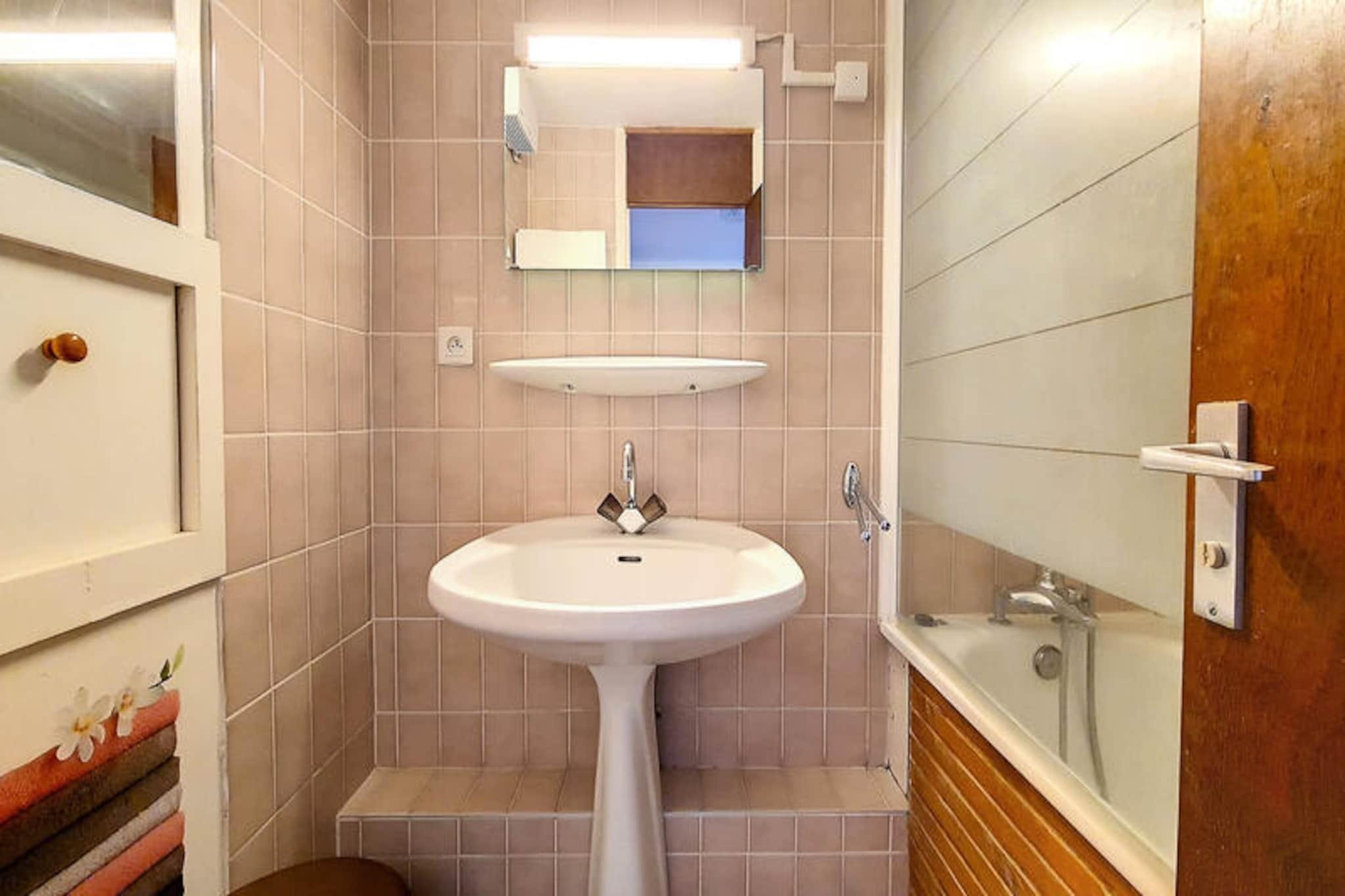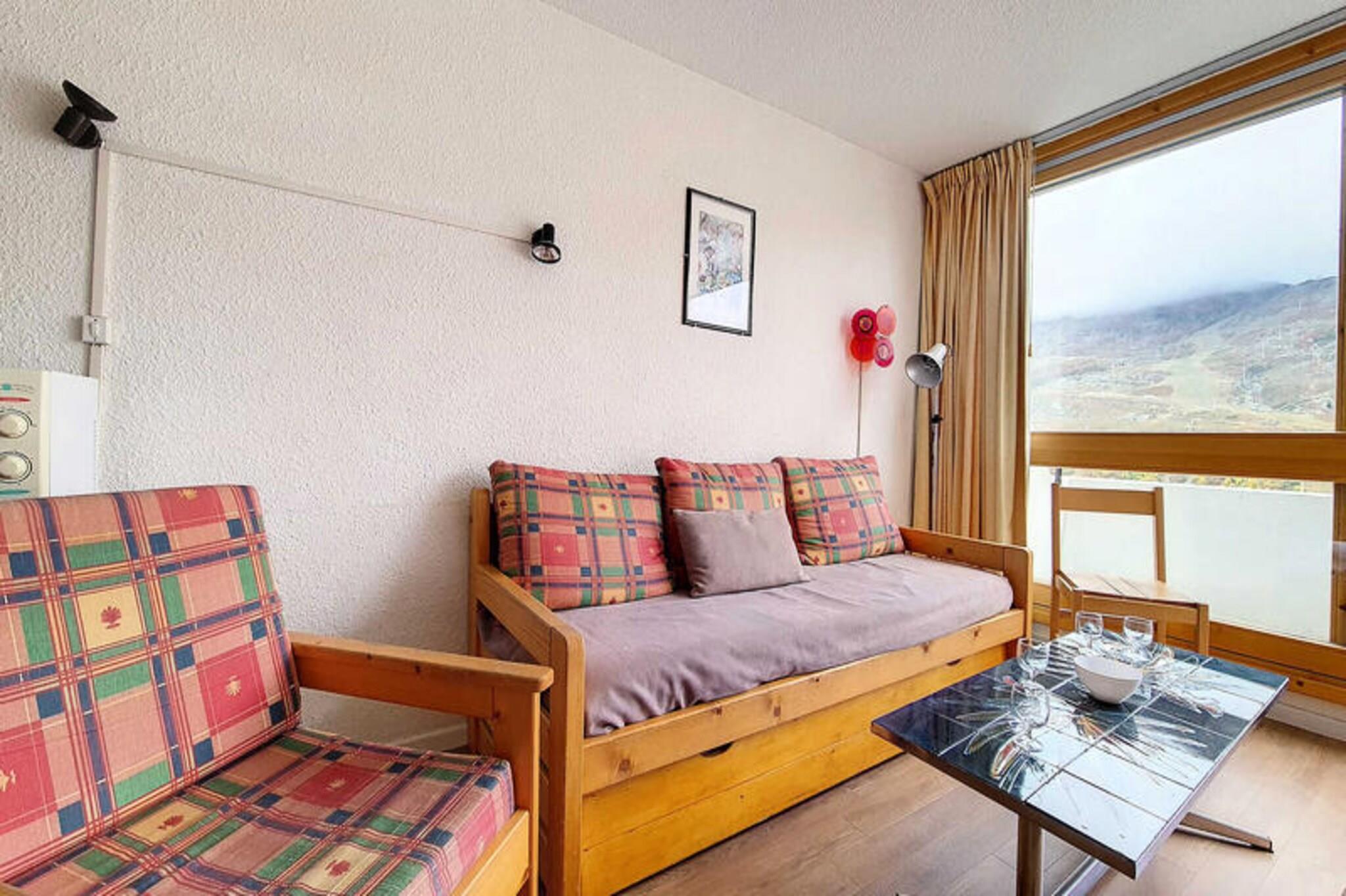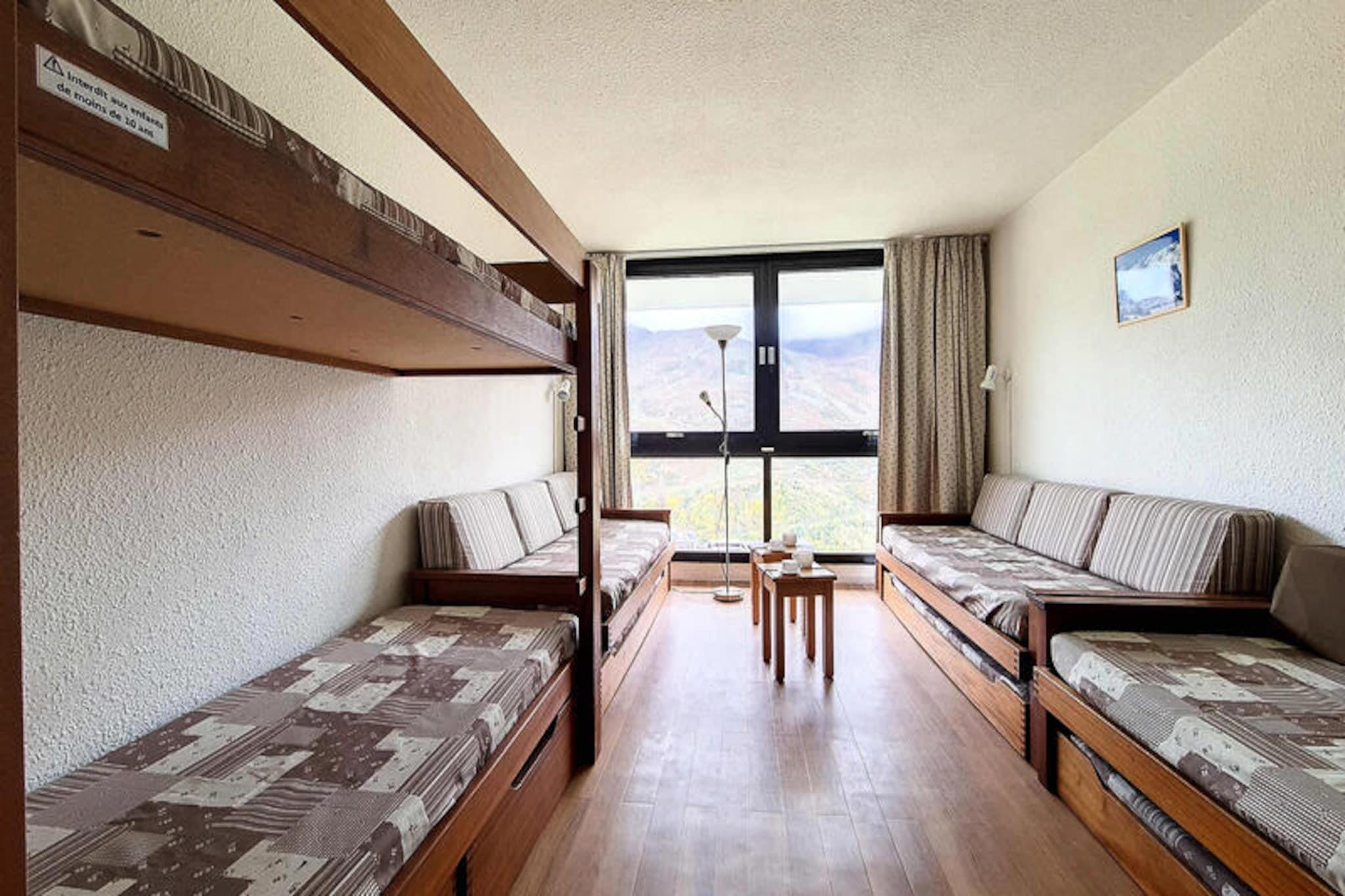 High above the vibrant Les Menuires resort, the Brelin building offers a unique vantage point with panoramic views and direct access to the slopes. Imagine waking up to the sunlit peaks of the French Alps from your southwest-facing balcony, where the crisp mountain air sets the tone for a day of adventure. Conveniently located above the La Croisette district, the property is connected by 24/7 public elevators, ensuring easy access to the heart of the resort at any time. Whether you're here for skiing or simply to soak in the alpine charm, this triplex apartment is a cozy retreat for families and groups alike. \n\nSpanning 55 m², the apartment comfortably accommodates up to eight guests across three thoughtfully designed rooms. The living room, with its warm carpeted flooring, features a single sofa bed and a pull-out bed, perfect for relaxing evenings with a movie on the TV or a DVD. The two bedrooms offer flexible sleeping arrangements, including a double bed in one and a mix of single and bunk beds in the other, ideal for children and adults alike. The fully equipped kitchen invites you to prepare hearty meals with modern appliances like a dishwasher, oven, microwave, and more. A separate bathroom with a bathtub and a separate toilet add to the convenience, while duvets are provided for a snug night's sleep. \n\nThe Brelin building itself boasts excellent amenities, including ski lockers at the ski-in/ski-out level and a shopping arcade with ticket offices for the ski lifts. Free parking at the Nant Benoit lift ensures hassle-free arrivals, while paid Wi-Fi access keeps you connected during your stay. The location is perfect for exploring the slopes or enjoying the lively atmosphere of Les Menuires, with shops, restaurants, and après-ski options just moments away. \n\nWhether you're seeking thrilling winter sports or serene summer hikes, this apartment offers a welcoming base to create unforgettable alpine memories. With its exceptional views, convenient facilities, and cozy ambiance, it’s the ideal choice for your next mountain getaway.