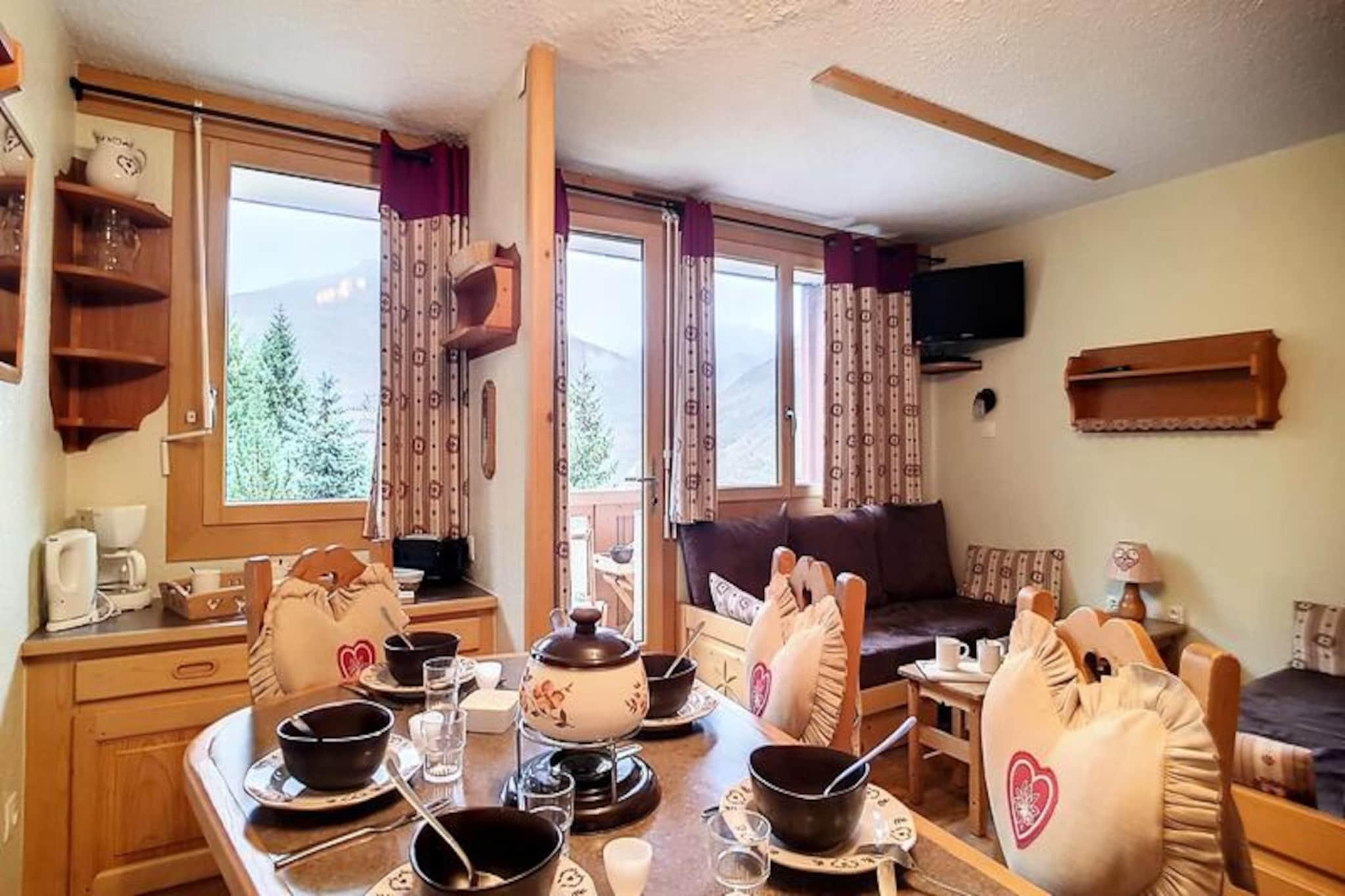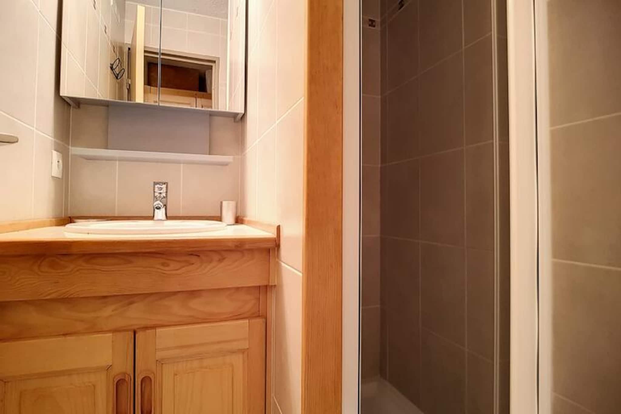 High above the charming Reberty 1850 district, this cozy alpine retreat offers an unparalleled ski-in/ski-out experience, perfect for those eager to immerse themselves in the snowy magic of Les Menuires. From your south-facing balcony on the 4th floor, soak in the crisp mountain air and breathtaking views while planning your next adventure on the slopes. Here, every moment feels like a postcard come to life. \n\nThe apartment, thoughtfully designed for up to five guests, combines comfort and functionality in its 30 m² layout. The living room features two inviting single sofa beds and a television, creating a perfect space to unwind after a day of skiing. A sliding door separates the cabin bedroom with a cozy double bed, while a sleeping alcove with bunk beds adds a touch of alpine charm. The fully equipped kitchen, complete with ceramic hobs, a mini-oven, microwave, refrigerator, and more, ensures you have everything needed to prepare hearty meals. Modern conveniences like a dishwasher and coffee maker make your stay even more enjoyable. The apartment also includes a bathroom with a shower and a separate WC for added convenience.\n\nLocated within the Boedette A residence, you'll enjoy secure access via a keycard and the convenience of an elevator. Nearby, small shops and restaurants cater to your every need, while free shuttle buses connect you to the lively Croisette center. For a leisurely stroll, the Bruyères district is just a short walk away, accessible via a pedestrian bridge and public elevator. \n\nWhether you're here to carve through pristine slopes, explore the vibrant local culture, or simply relax in the serene alpine atmosphere, this apartment is your gateway to unforgettable memories in the heart of the French Alps.