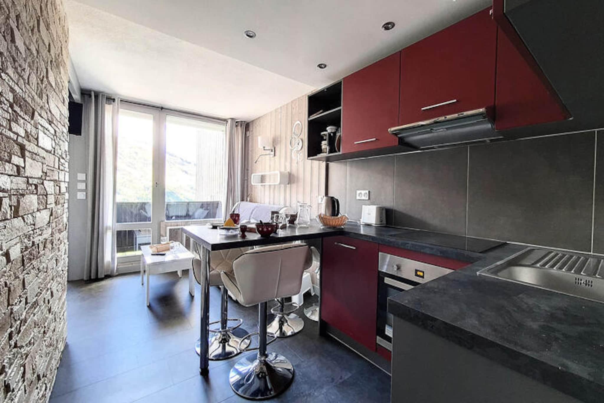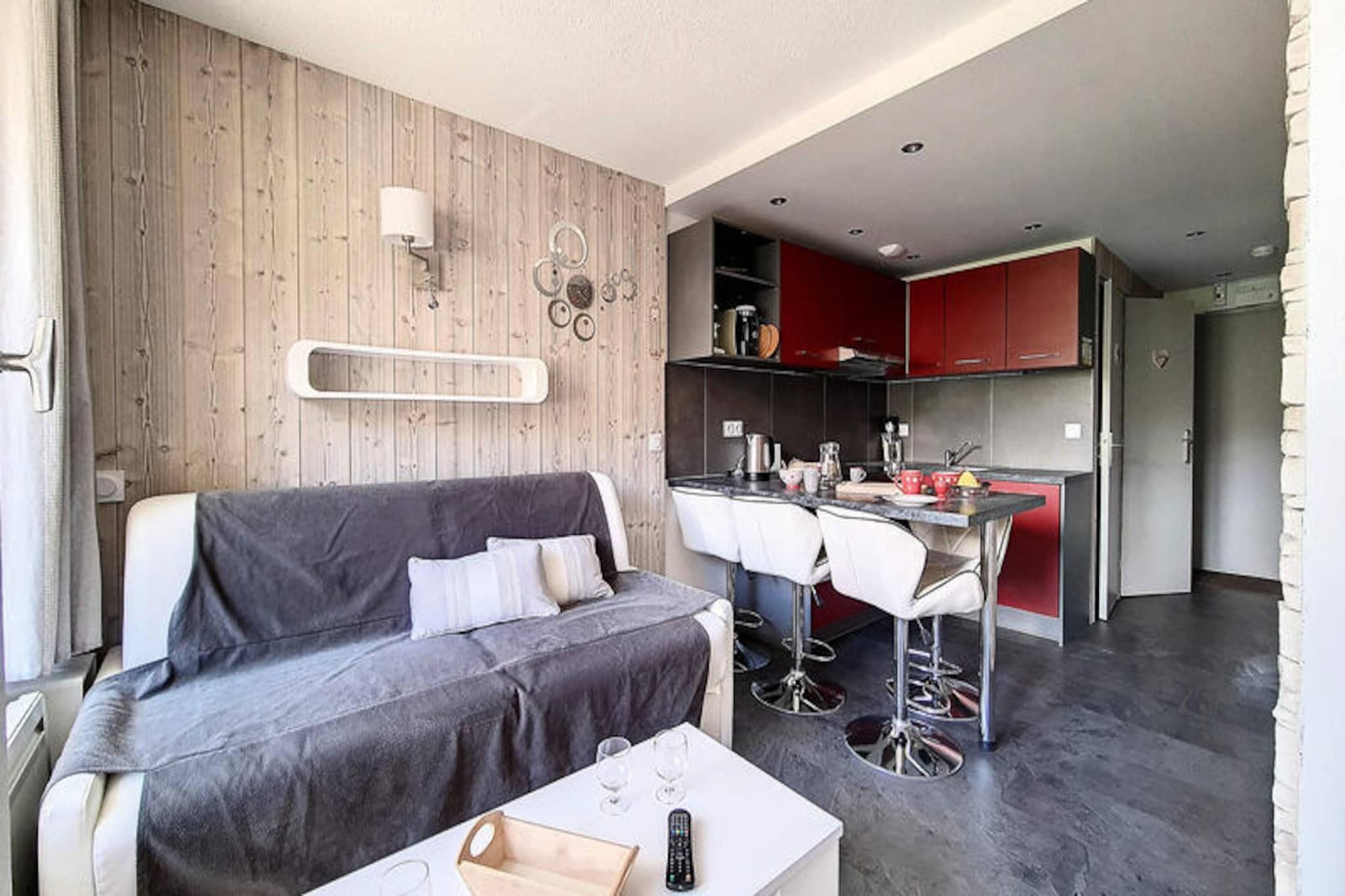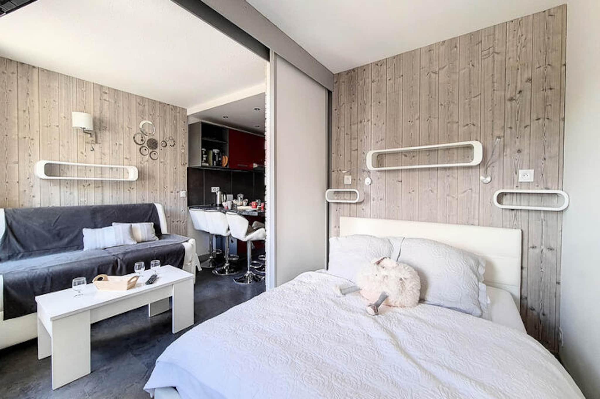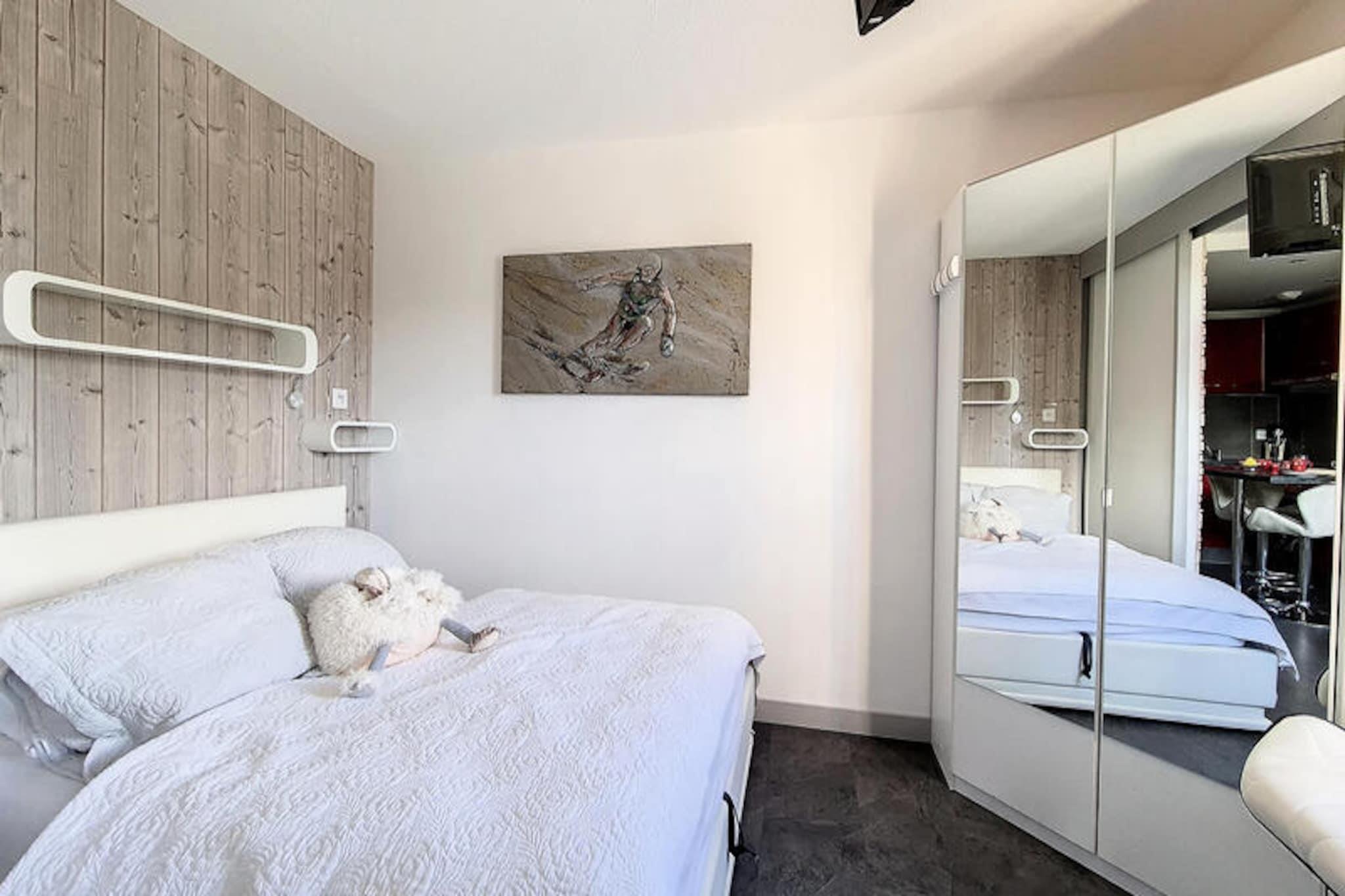 High above the charming Preyerand district, this beautifully renovated apartment invites you to experience the magic of the French Alps. With its west-facing balcony, you’ll be treated to breathtaking sunsets over the snow-capped peaks, creating the perfect backdrop for a cozy alpine escape. Whether you’re here for the thrill of skiing or the serenity of mountain vistas, this property offers an ideal retreat for couples or small families. The 27 m² apartment has been thoughtfully designed to maximize comfort and functionality. The living room features a sofa bed for two, while the separate sleeping area, closed off by a sliding door, offers a double bed with natural light streaming through the window. A cozy cabin space with bunk beds is perfect for children or additional guests. The fully equipped kitchen includes modern appliances such as a dishwasher, microwave, and coffee maker, ensuring you have everything you need for home-cooked meals. The bathroom boasts a sleek shower, and the separate toilet adds convenience. Situated on the 5th floor of the Villaret residence, the apartment provides direct access to the central La Croisette area via the free TéléPreyerand cable car, operating daily from 8:00 AM to 11:00 PM. Ski lift ticket offices, shops, and restaurants are just a short walk away, making it easy to enjoy the vibrant atmosphere of the resort. Whether you’re savoring a quiet evening on the balcony or exploring the nearby slopes, this apartment offers a blend of modern comfort and alpine charm. It’s the perfect base for creating unforgettable memories in the heart of the French Alps.