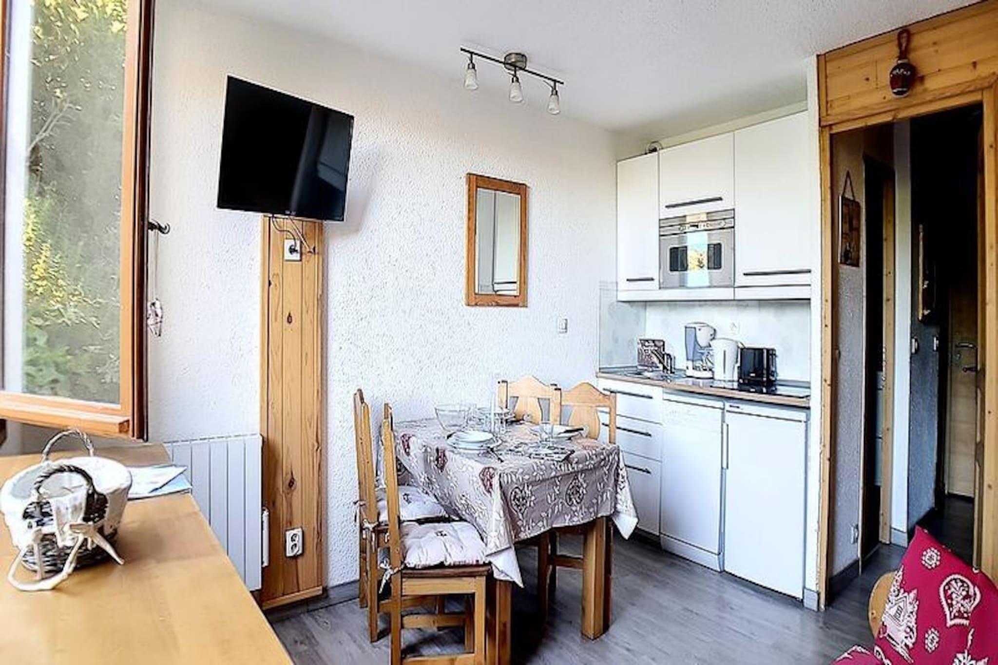 High above the charming slopes of Les Menuires, this cozy studio apartment in the Boedette A residence offers a serene mountain escape with unbeatable ski-in/ski-out access. Located in the Reberty 1850 district, this property is perfect for those seeking the thrill of the Three Valleys ski area combined with the convenience of nearby amenities and a tranquil alpine setting. From the moment you arrive, the crisp mountain air and snow-dusted peaks set the tone for an unforgettable stay. This thoughtfully designed 21 m² studio comfortably accommodates up to four guests, making it ideal for small families or close-knit friends. The living room features a double sofa bed and a flat-screen television, while a separate sleeping alcove offers two single bunk beds for added privacy. The compact yet fully equipped kitchen includes a ceramic hob, microwave, refrigerator, dishwasher, and all the essentials for preparing hearty meals after a day on the slopes. A modern bathroom with a shower and a separate WC ensure convenience, while laminate flooring adds a touch of warmth to the space. Please note that this is a non-smoking, pet-free apartment, and the upper bunk is not suitable for children under six years old. The residence itself boasts secure access via a keycard and an elevator for easy navigation. Small shops and restaurants are just steps away, while free shuttle buses connect you to the bustling Croisette center. For those looking to explore further, the lively Bruyères district is within walking distance, accessible via a public elevator and pedestrian bridge. Whether you're here for the world-class skiing, scenic mountain trails, or simply to unwind in the heart of the Alps, this studio offers a welcoming retreat for your alpine adventure.