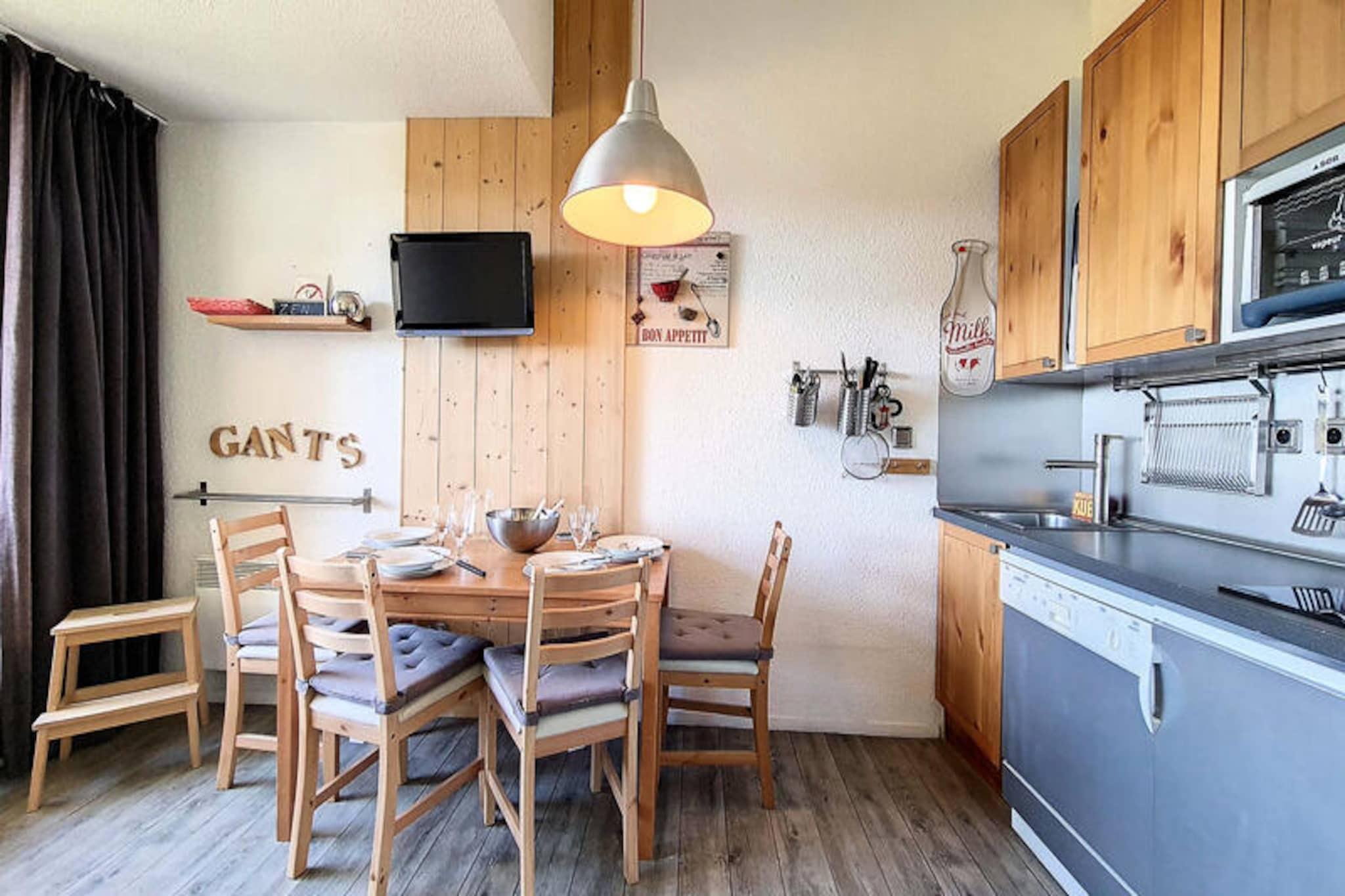 High above the bustling slopes of Reberty 1850, this cozy studio apartment offers a serene alpine retreat with direct ski-in/ski-out access to the pristine pistes of Les Menuires. Imagine waking up to the crisp mountain air, stepping onto your north-facing balcony, and gazing out over the snow-dusted peaks that surround the valley. With its charming ambiance and practical layout, this property is perfect for couples or small families seeking a peaceful yet convenient base for their winter adventures. \n\nThe 21 m² studio is thoughtfully designed to maximize comfort and functionality. The living room features a convertible corner sofa and a television, creating a welcoming space to unwind after a day on the slopes. A separate sleeping alcove, accessible through its own door, houses two single bunk beds, making it ideal for families with children. The kitchen is fully equipped with modern amenities, including electric hobs, a mini-oven, refrigerator, dishwasher, and essential appliances like a coffee maker and toaster. The bathroom boasts a walk-in shower, and there is a separate WC for added convenience. Laminate flooring and cozy duvets enhance the warm, homely feel of the apartment. \n\nSituated in the Boedette A residence, guests benefit from secure elevator access via keycard. Small shops and restaurants are just steps away, while the Croisette center and Bruyères district are easily accessible via free shuttle buses or a pedestrian bridge. Whether you’re skiing down world-class slopes or exploring the charming village atmosphere, everything you need is within reach. \n\nThis delightful studio combines comfort, practicality, and unbeatable access to the slopes, making it an excellent choice for your next alpine getaway. Experience the magic of Les Menuires and create memories that will last a lifetime.