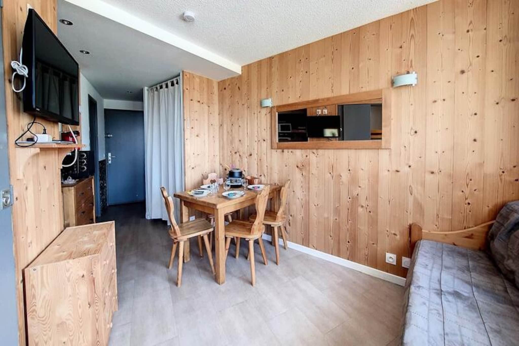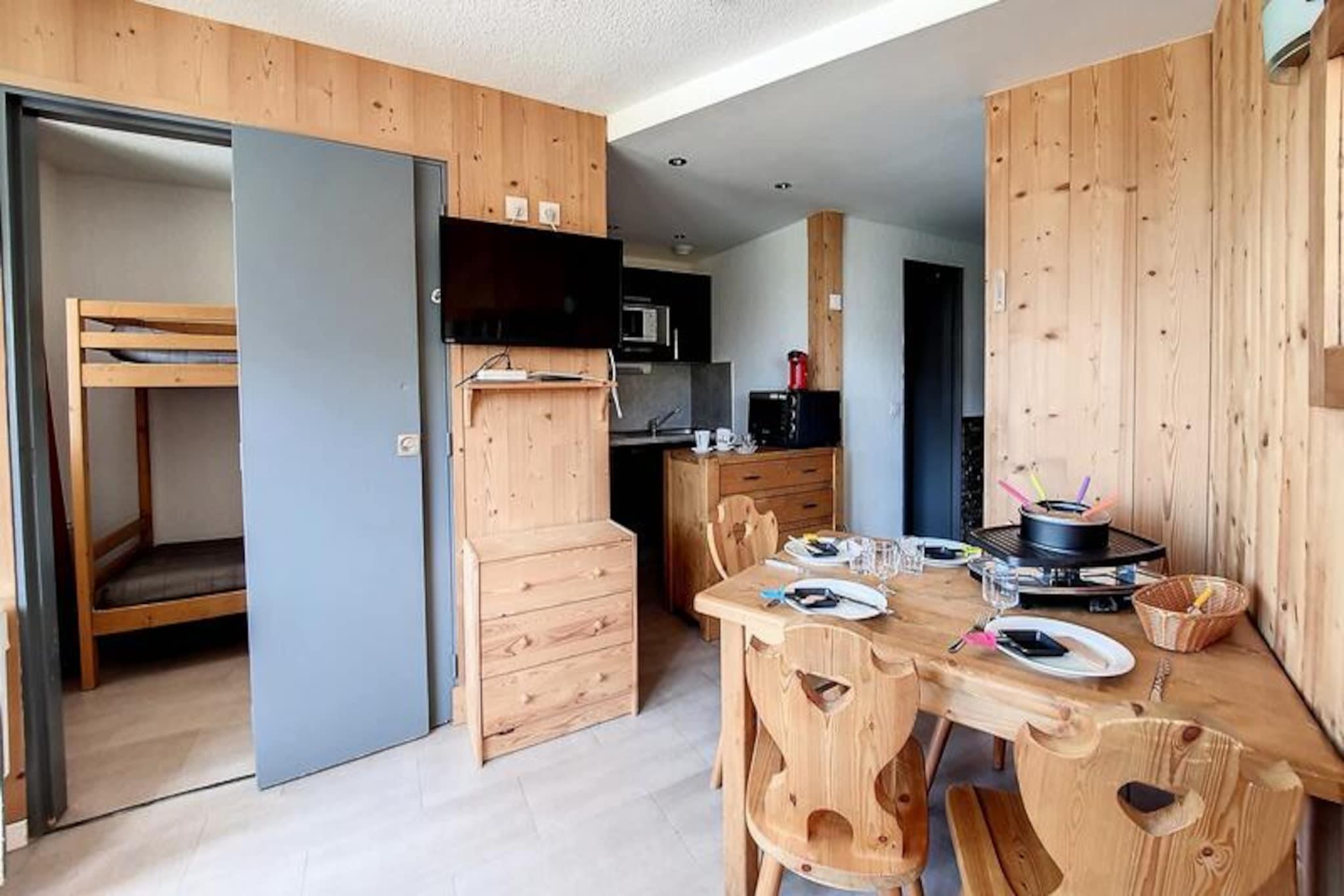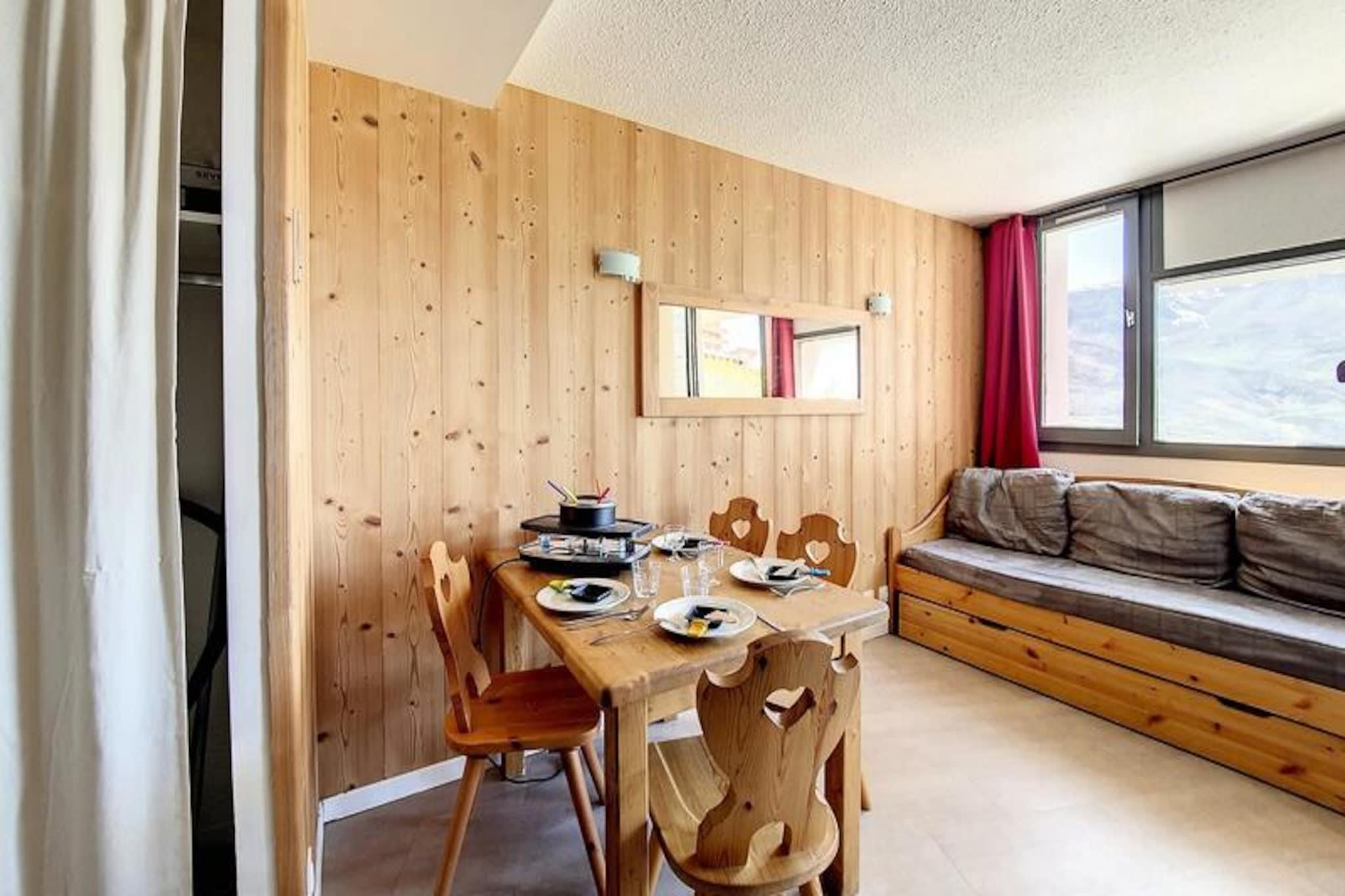 In the charming Reberty 1850 district, this cozy apartment offers a delightful alpine escape for those seeking comfort and convenience. With free parking right at the foot of the building and the slopes just 250 meters away, you’ll find yourself perfectly positioned to enjoy the best of Les Menuires. Imagine waking up to the crisp mountain air and stepping onto your east-facing balcony to soak in the morning light before heading out for a day of skiing or exploring the scenic surroundings. The Médian residence is ideal for couples or small families looking for a peaceful retreat amidst the beauty of the French Alps. \n\nThis thoughtfully renovated 24 m² apartment, located on the second floor with elevator access, comfortably accommodates up to four guests. The living room features a single sofa bed and a pull-out bed, while the bedroom is equipped with two single bunk beds. The laminate flooring adds a modern touch, and the fully equipped kitchen includes everything you need to prepare hearty meals, from a 2-burner cooktop to a raclette and fondue set for authentic alpine dining experiences. The bathroom with a bathtub and toilet ensures a relaxing end to your day, and the apartment is pet-friendly, making it a welcoming space for all. \n\nNearby, you’ll find shops and a ski school, making it easy to gear up for your adventures or enroll in lessons to refine your skills. Whether you’re here for winter sports or summer hikes, the location offers seamless access to the slopes and trails. Paid Wi-Fi is available for those who wish to stay connected, and the residence’s tranquil atmosphere is perfect for unwinding after a day of activity. \n\nWith its blend of modern amenities and alpine charm, this apartment invites you to create unforgettable memories in the heart of Les Menuires. Whether you’re savoring a warm raclette dinner or gazing at the snowy peaks, every moment here is a celebration of mountain living.