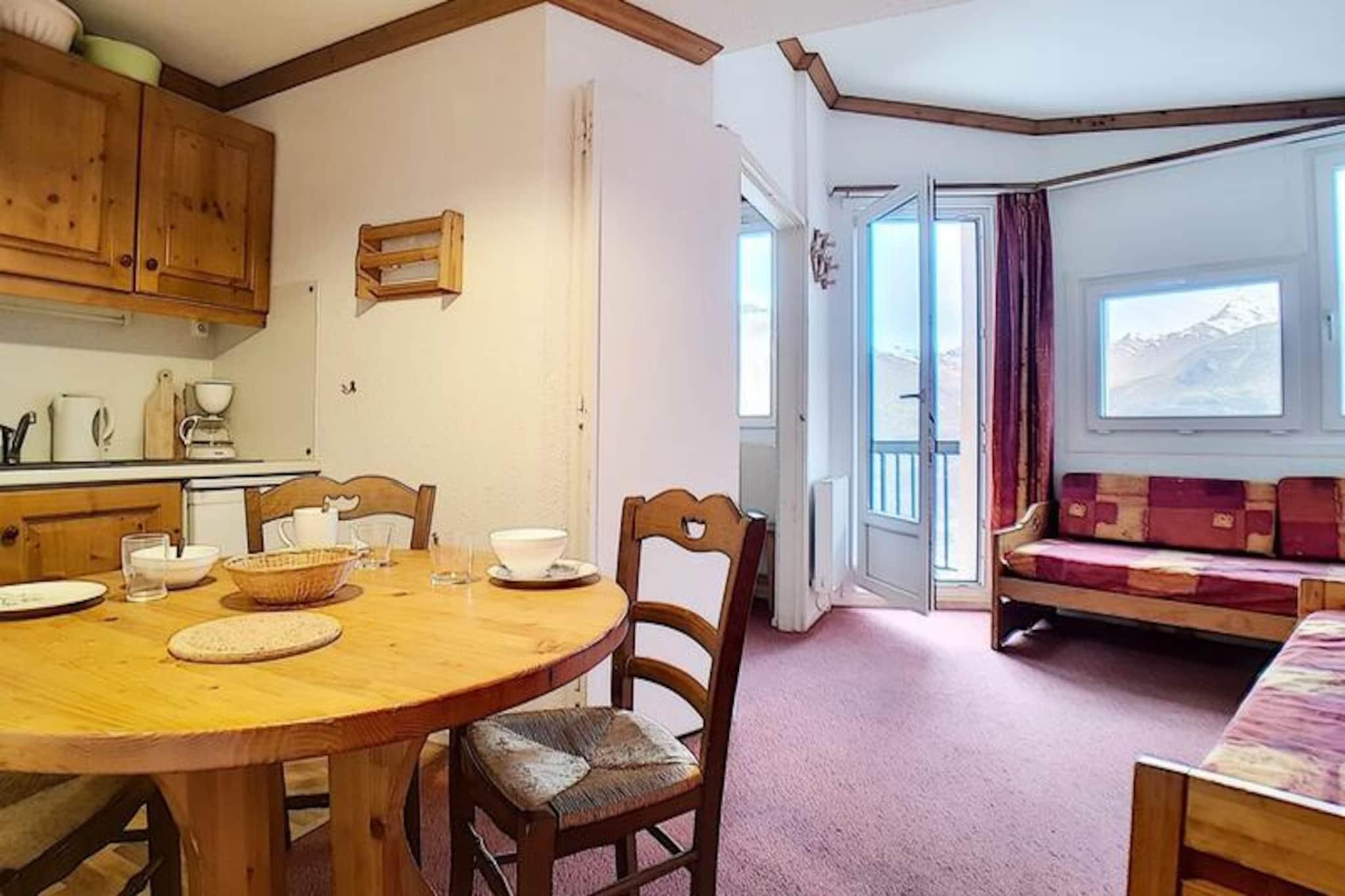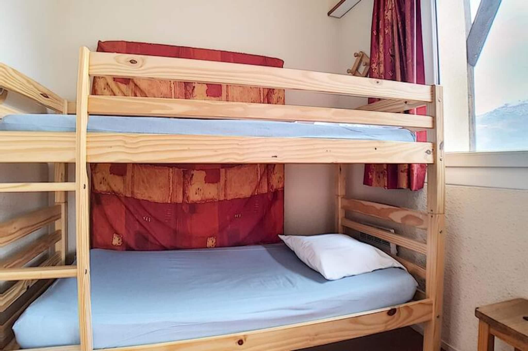 High above the bustling Reberty 1850 district, this charming two-room apartment offers a cozy retreat with breathtaking views of the surrounding mountain range. Imagine sipping your morning coffee on the southwest-facing balcony as the sun illuminates the peaks, setting the perfect tone for a day of alpine adventures. Whether you're here for skiing or simply to unwind, this residence provides a welcoming base for your holiday in the French Alps. Designed to accommodate up to four guests, the apartment features a clever layout with a movable partition for added flexibility. The living room is equipped with two single pull-out beds and a flat-screen TV, while the bedroom offers bunk beds, making it ideal for families or small groups. The fully fitted kitchen includes modern appliances such as a microwave, refrigerator, dishwasher, and coffee maker, ensuring you have everything needed to prepare hearty meals after a day on the slopes. Warm carpeting in the living and sleeping areas adds a touch of comfort, complemented by linoleum flooring in the kitchen and bathroom for practicality. Just 250 meters from the slopes, the Médian residence is perfectly positioned for ski enthusiasts. Free parking at the foot of the building and nearby shops and a ski school make your stay convenient and stress-free. In the evenings, explore the local dining scene or simply relax in the apartment, enjoying the serene mountain atmosphere. With its combination of comfort, location, and stunning views, this apartment invites you to experience the magic of the French Alps. Whether you're seeking adventure or tranquility, your alpine escape begins here.