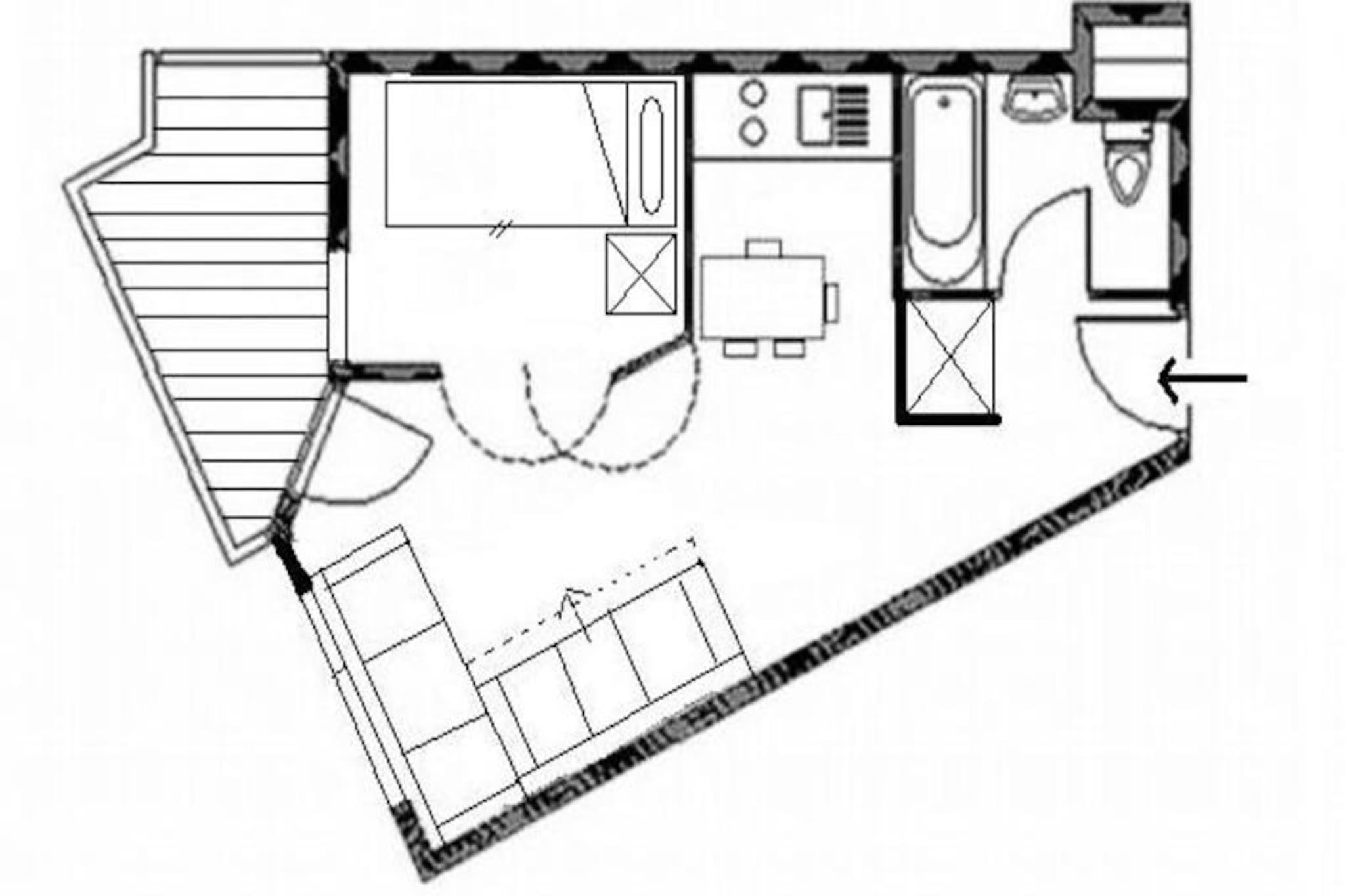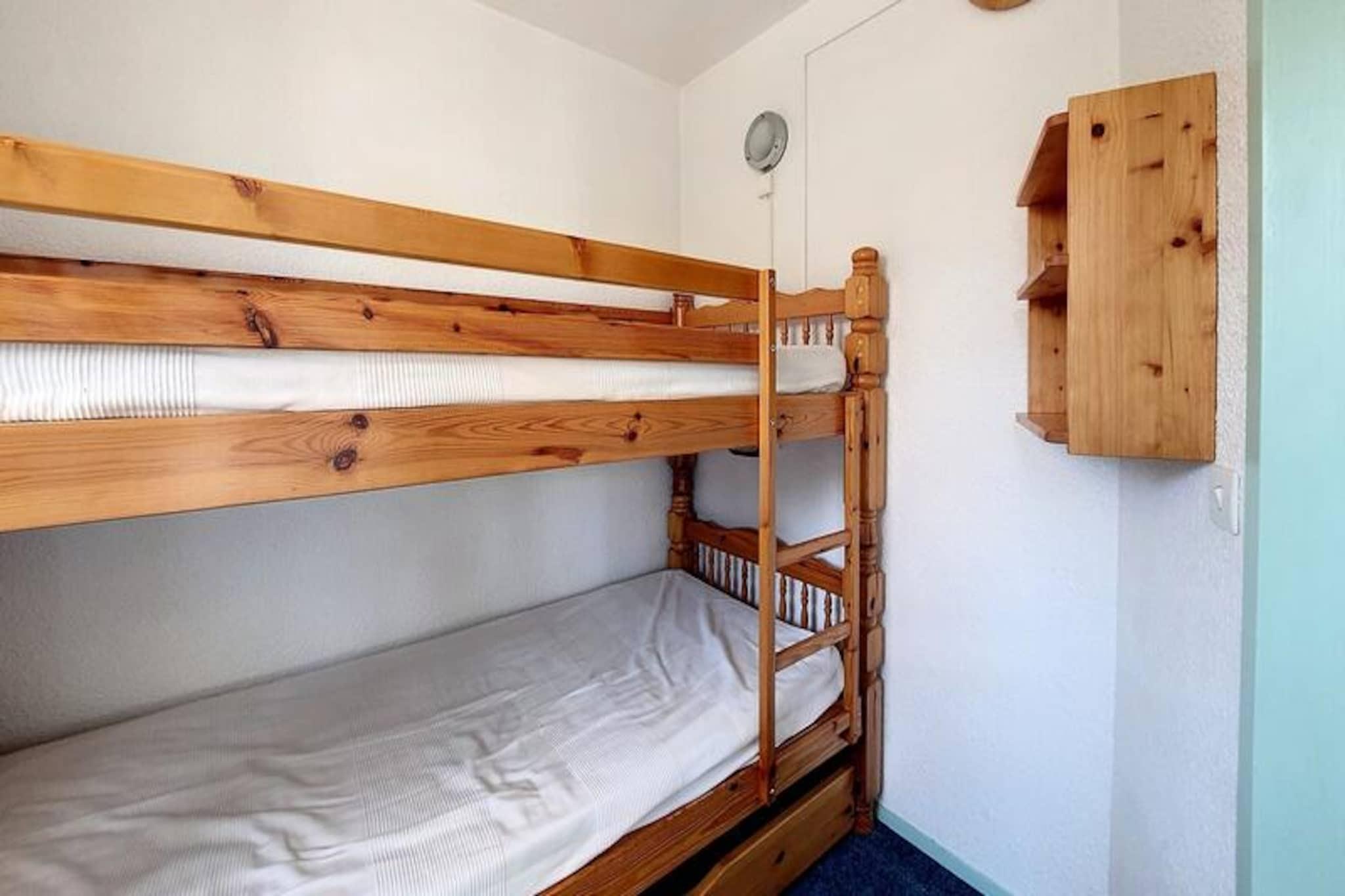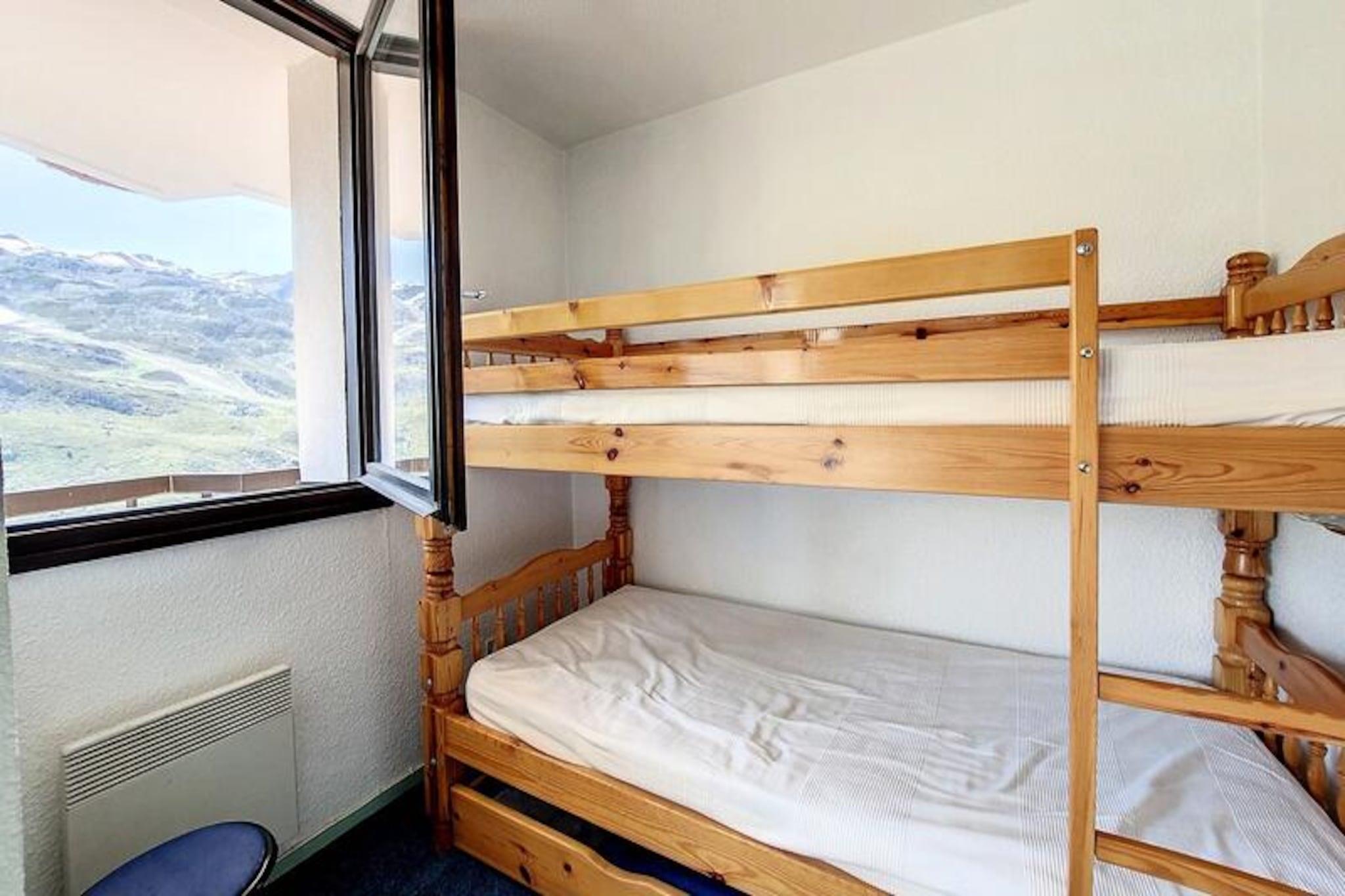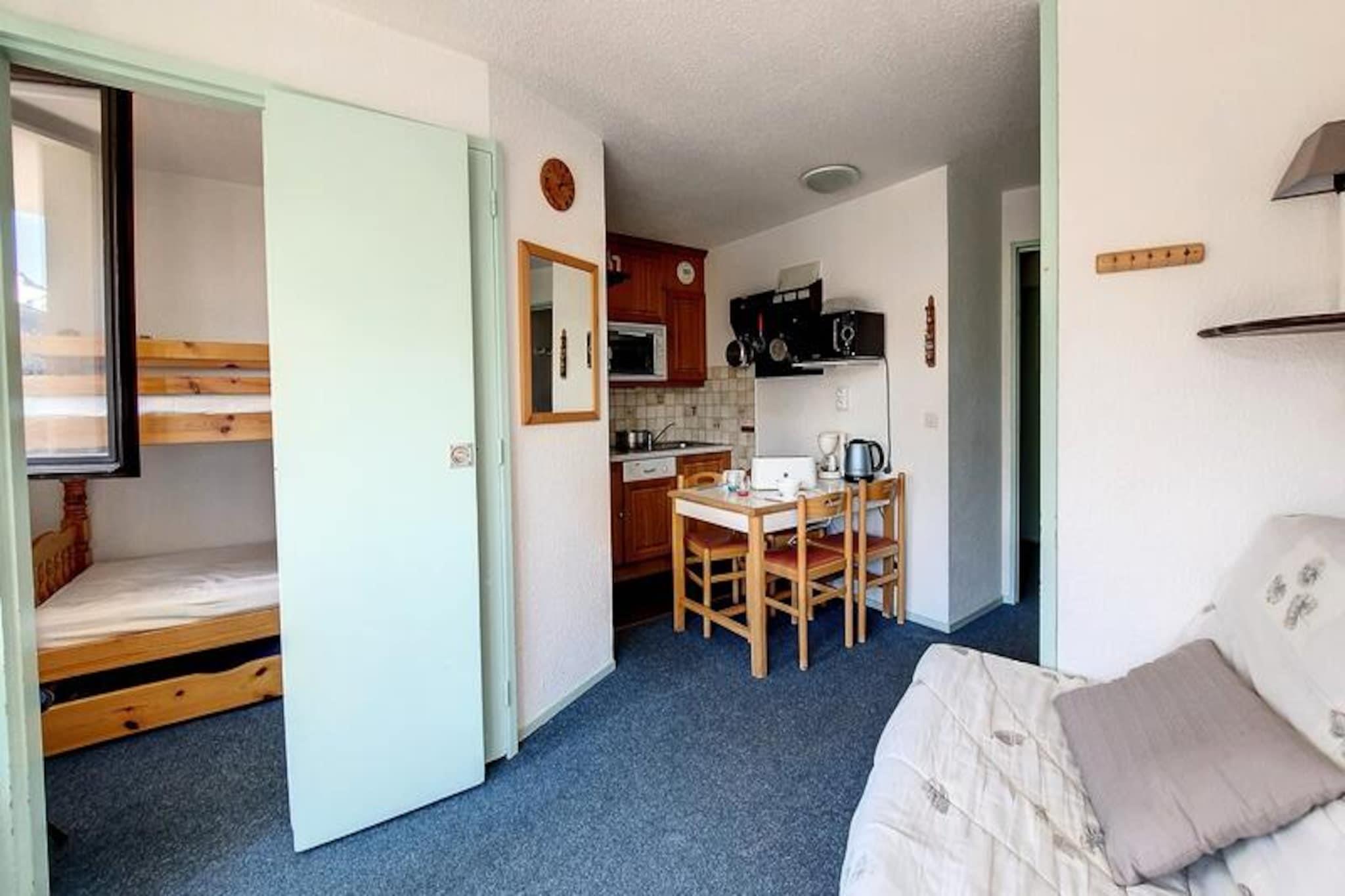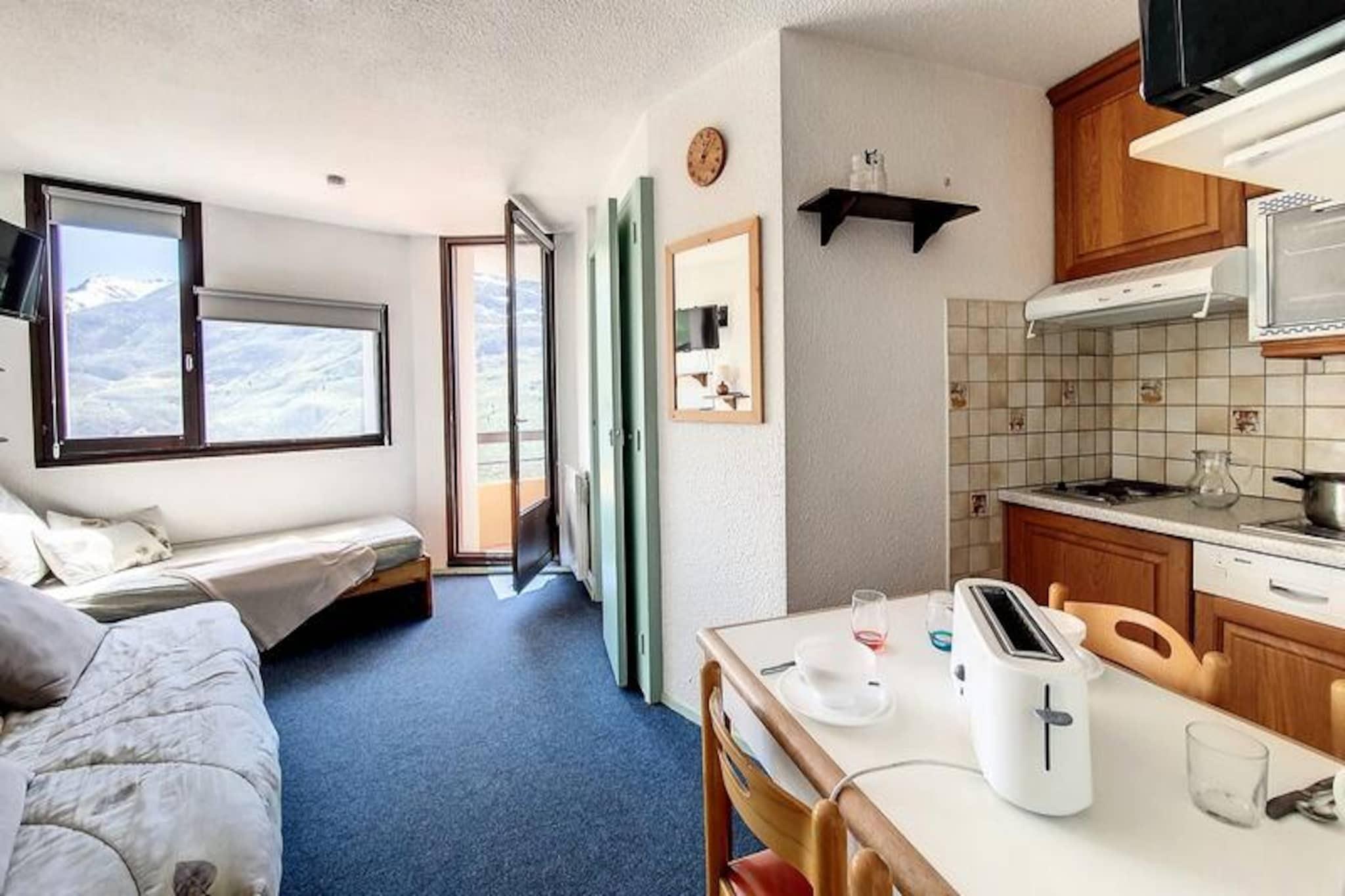 In the charming Reberty 1850 district, this cozy apartment offers a delightful alpine retreat for those seeking both comfort and convenience. Imagine stepping onto your southwest-facing balcony on the second floor, soaking in the crisp mountain air and the serene views that surround you. Whether you're planning a winter ski adventure or a summer escape, this residence provides the perfect base for your holiday in the French Alps. \n\nInside, the apartment is thoughtfully designed to accommodate up to four guests across its 26 square meters. The living room features a comfortable double sofa bed and a television, creating a welcoming space to relax after a day of exploration. The separate bedroom includes two single bunk beds, ideal for families or small groups. The kitchen has been recently renovated and is fully equipped with modern appliances, including a cooktop, microwave, oven, refrigerator, dishwasher, toaster, kettle, and coffee maker—everything you need to prepare hearty meals during your stay. The bathroom is fitted with a bathtub and toilet, ensuring convenience and privacy. \n\nLocated just 250 meters from the slopes, the apartment is perfectly positioned for ski enthusiasts. Free parking is available at the foot of the building, and nearby you'll find shops and a ski school, making it easy to access everything you need for a seamless holiday experience. \n\nWhether you're drawn to the thrill of skiing, the tranquility of alpine landscapes, or the charm of the Reberty 1850 district, this apartment invites you to create lasting memories in one of France's most picturesque mountain settings.