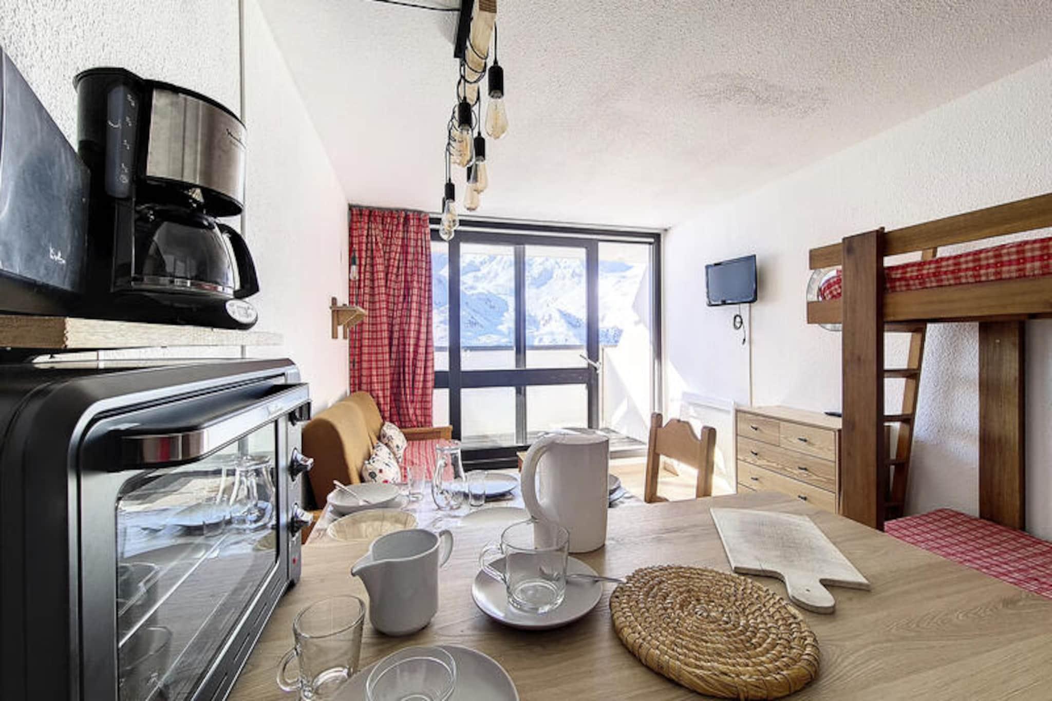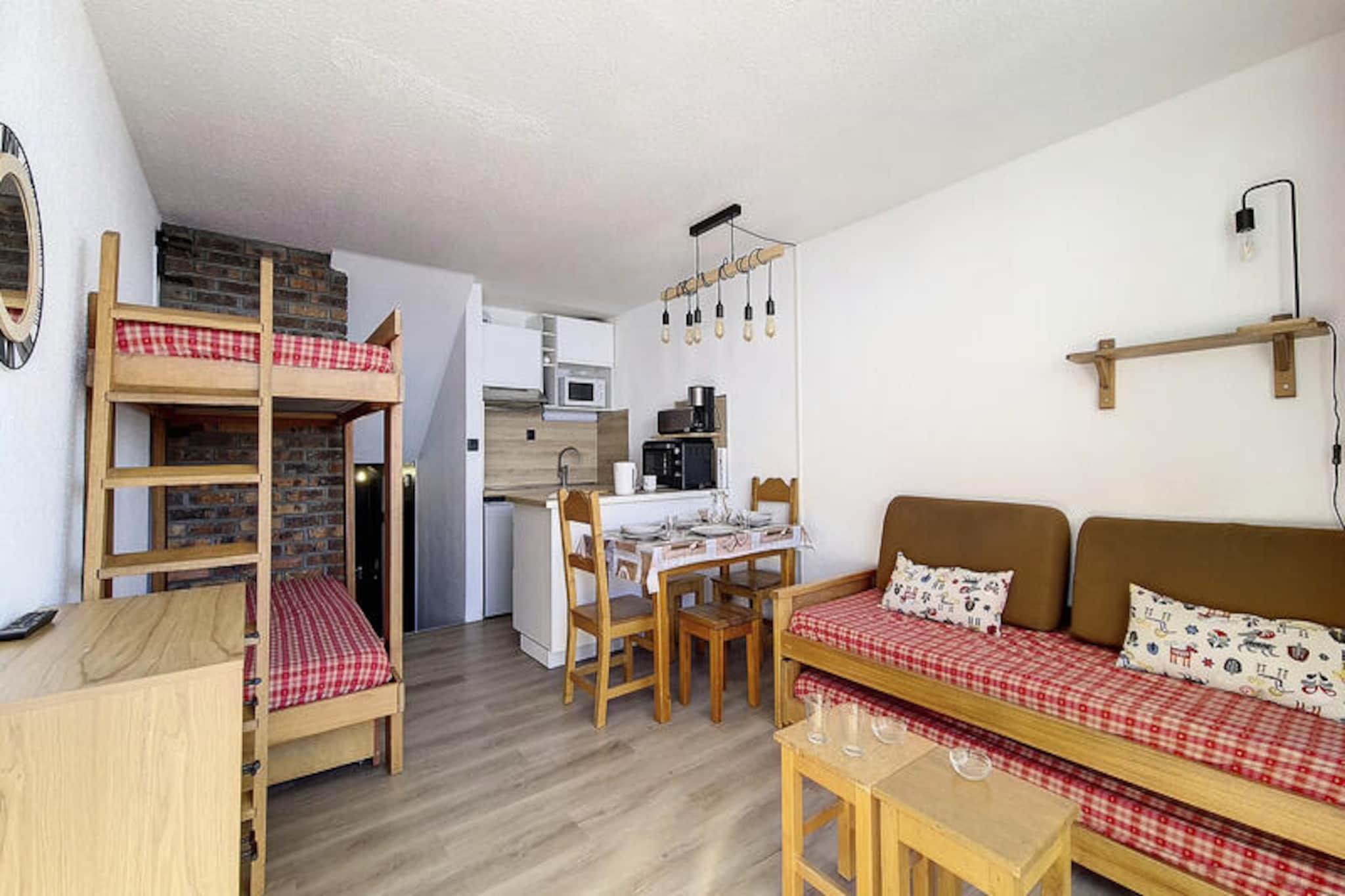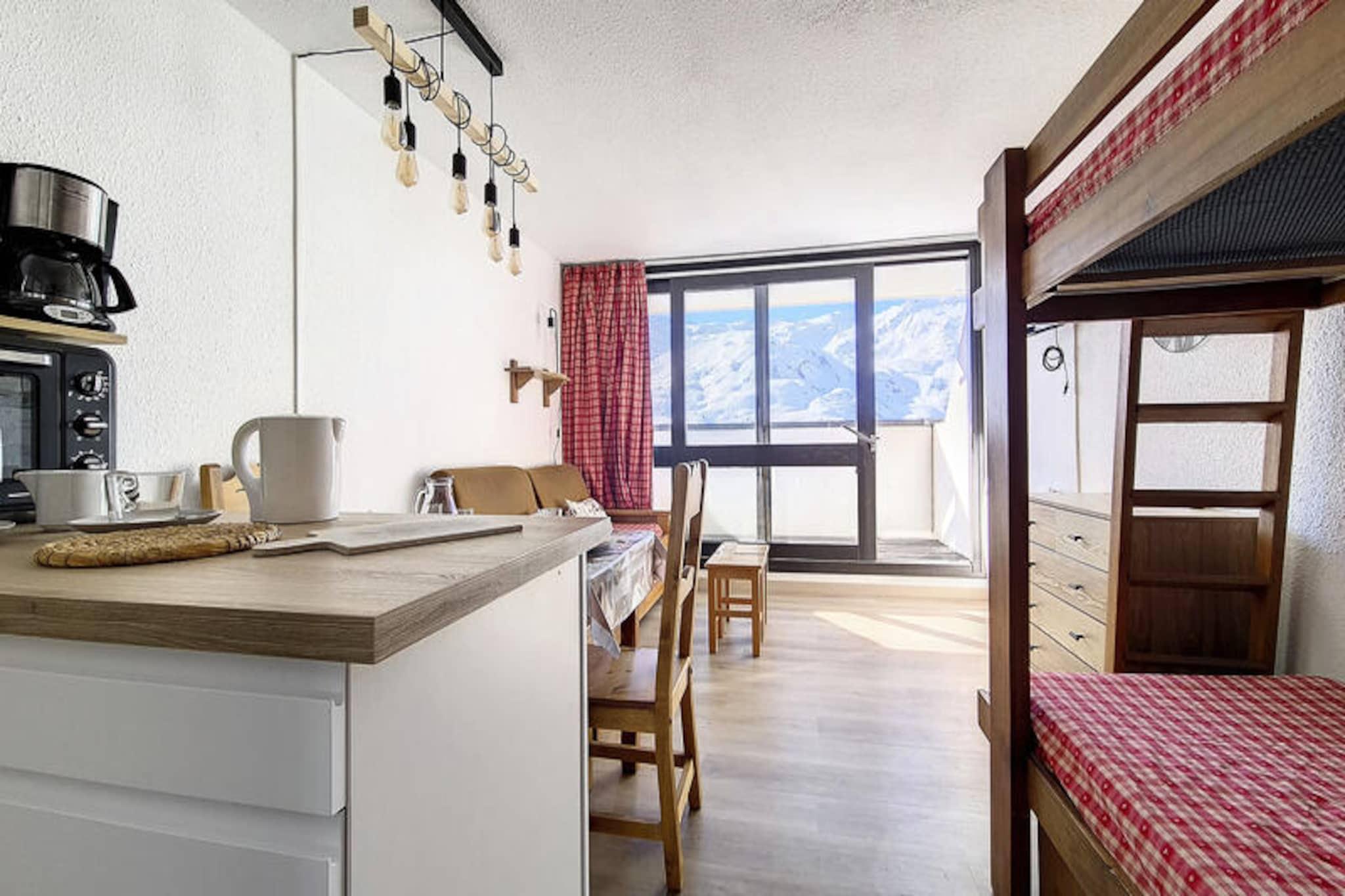 High above the bustling Les Menuires resort, the Brelin building offers a unique vantage point and direct access to the slopes. Perched above the La Croisette district, this convenient location is connected by public elevators operating 24/7, ensuring easy movement between the heart of the resort and your peaceful retreat. From the southwest-facing balcony of this cozy studio apartment, soak in the alpine charm and enjoy uninterrupted views of the surrounding peaks bathed in sunlight throughout the day. Whether you're here for winter sports or summer hikes, this is the perfect base for your mountain adventures. \n\nDesigned for up to four guests, the 24m² studio is thoughtfully arranged to maximize comfort and functionality. The living room features two single bunk beds, a single sofa bed, and a pull-out single bed, making it ideal for families or small groups. The compact kitchen is equipped with all essentials, including electric hobs, a refrigerator, mini-oven, microwave, dishwasher, and small appliances like a coffee maker, toaster, and kettle. After a day on the slopes, unwind with a hot shower in the bathroom, which includes a raised edge, and enjoy the warmth of the cozy living space equipped with a television. \n\nThe Brelin building itself houses shops, ski lift ticket offices, and ski lockers for added convenience. Free parking is available at the Côte Brune lift, located at the foot of the building, making your arrival and departure stress-free. With paid Wi-Fi access and blankets provided, you'll have everything you need for a comfortable stay. \n\nWhether you're drawn to the thrill of skiing, the tranquility of alpine landscapes, or the vibrant atmosphere of Les Menuires, this studio apartment combines practicality and charm for an unforgettable mountain getaway.