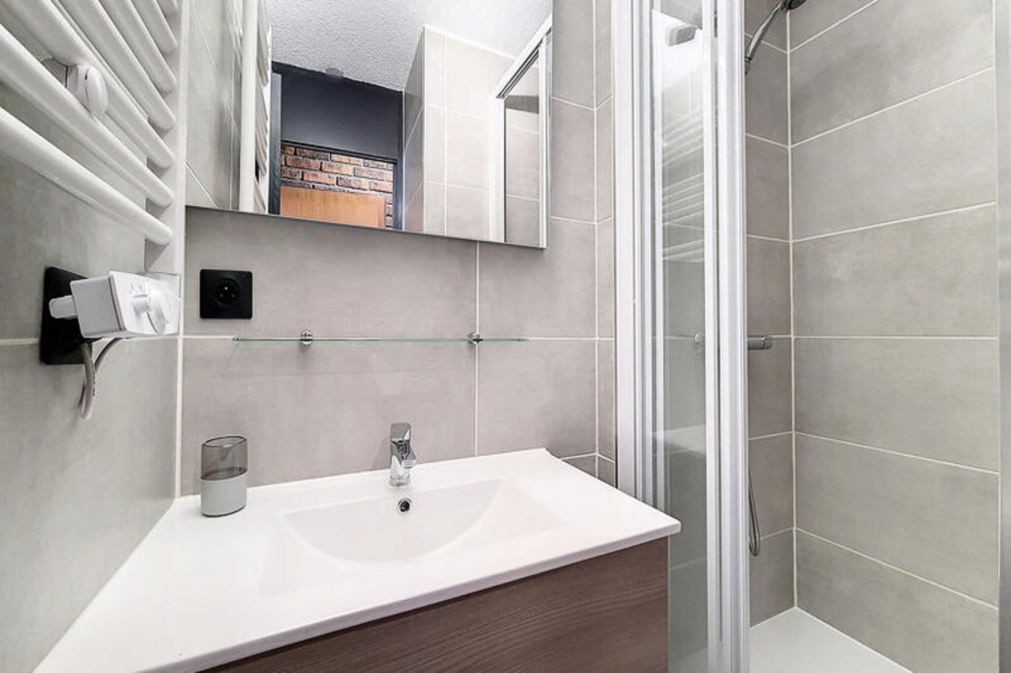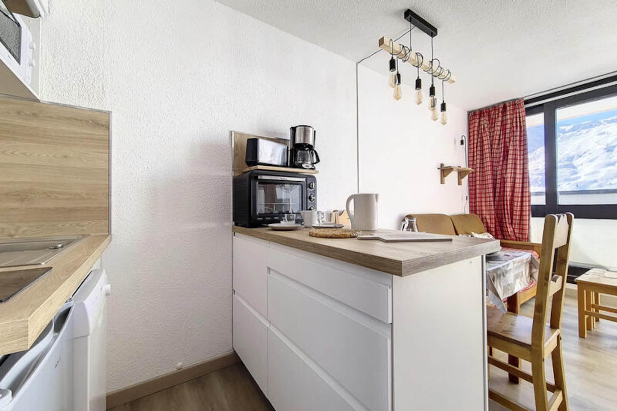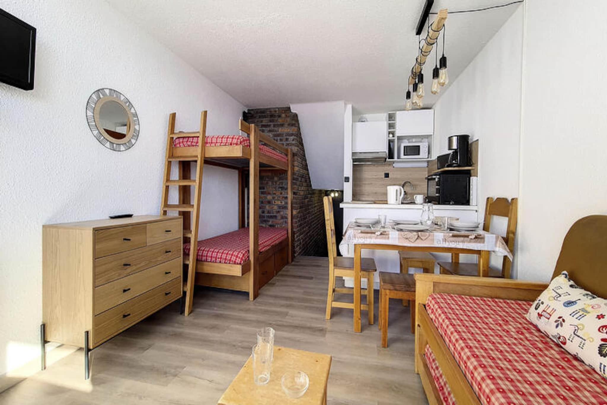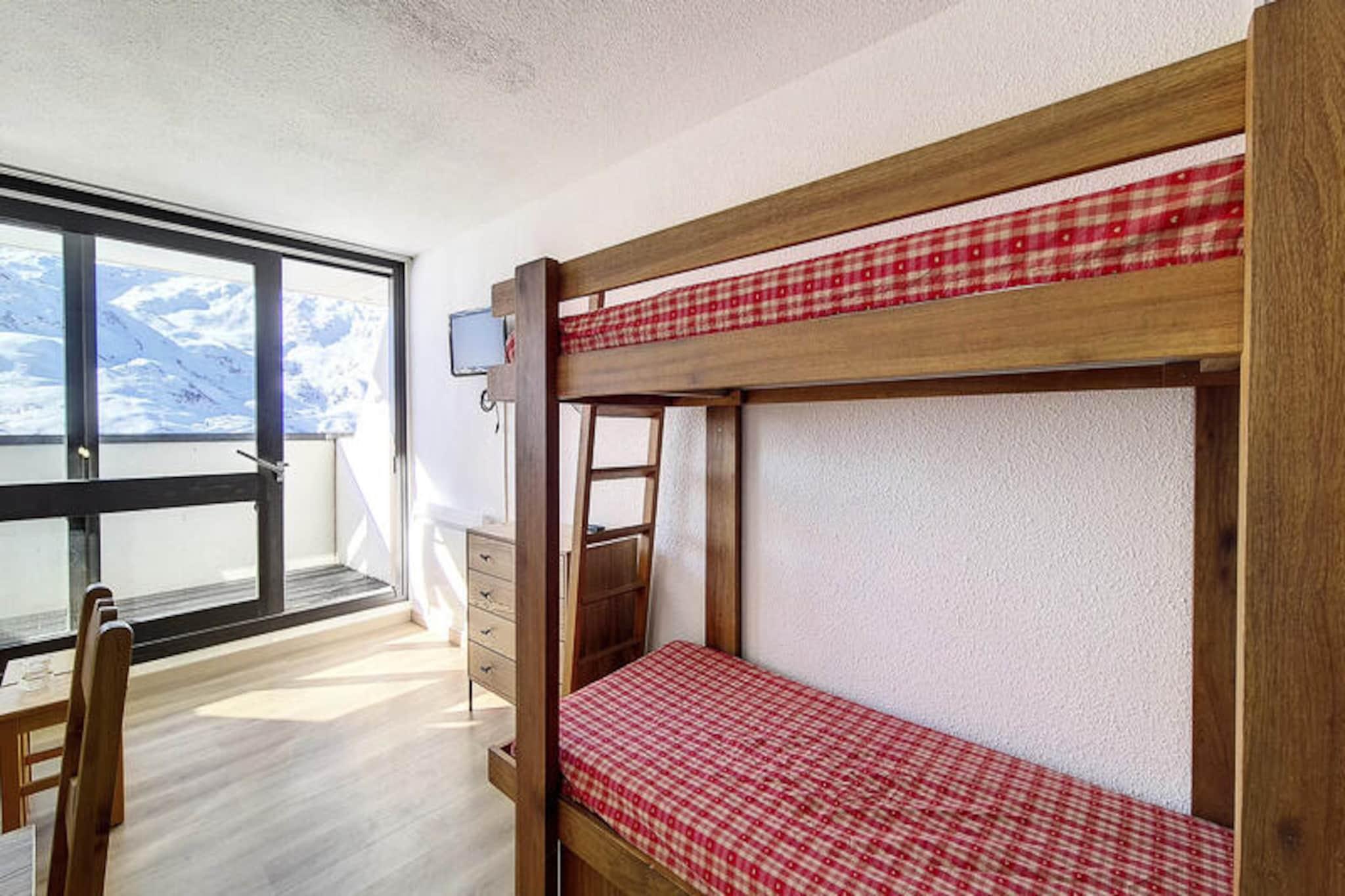 High above the bustling Les Menuires resort, the Brelin building offers a unique vantage point and direct access to the slopes. Perched above the La Croisette district, this convenient location is connected by public elevators operating 24/7, ensuring easy movement between the heart of the resort and your peaceful retreat. From the southwest-facing balcony of this cozy studio apartment, soak in the alpine charm and enjoy uninterrupted views of the surrounding peaks bathed in sunlight throughout the day. Whether you're here for winter sports or summer hikes, this is the perfect base for your mountain adventures. \n\nDesigned for up to four guests, the 24m² studio is thoughtfully arranged to maximize comfort and functionality. The living room features two single bunk beds, a single sofa bed, and a pull-out single bed, making it ideal for families or small groups. The compact kitchen is equipped with all essentials, including electric hobs, a refrigerator, mini-oven, microwave, dishwasher, and small appliances like a coffee maker, toaster, and kettle. After a day on the slopes, unwind with a hot shower in the bathroom, which includes a raised edge, and enjoy the warmth of the cozy living space equipped with a television. \n\nThe Brelin building itself houses shops, ski lift ticket offices, and ski lockers for added convenience. Free parking is available at the Côte Brune lift, located at the foot of the building, making your arrival and departure stress-free. With paid Wi-Fi access and blankets provided, you'll have everything you need for a comfortable stay. \n\nWhether you're drawn to the thrill of skiing, the tranquility of alpine landscapes, or the vibrant atmosphere of Les Menuires, this studio apartment combines practicality and charm for an unforgettable mountain getaway.