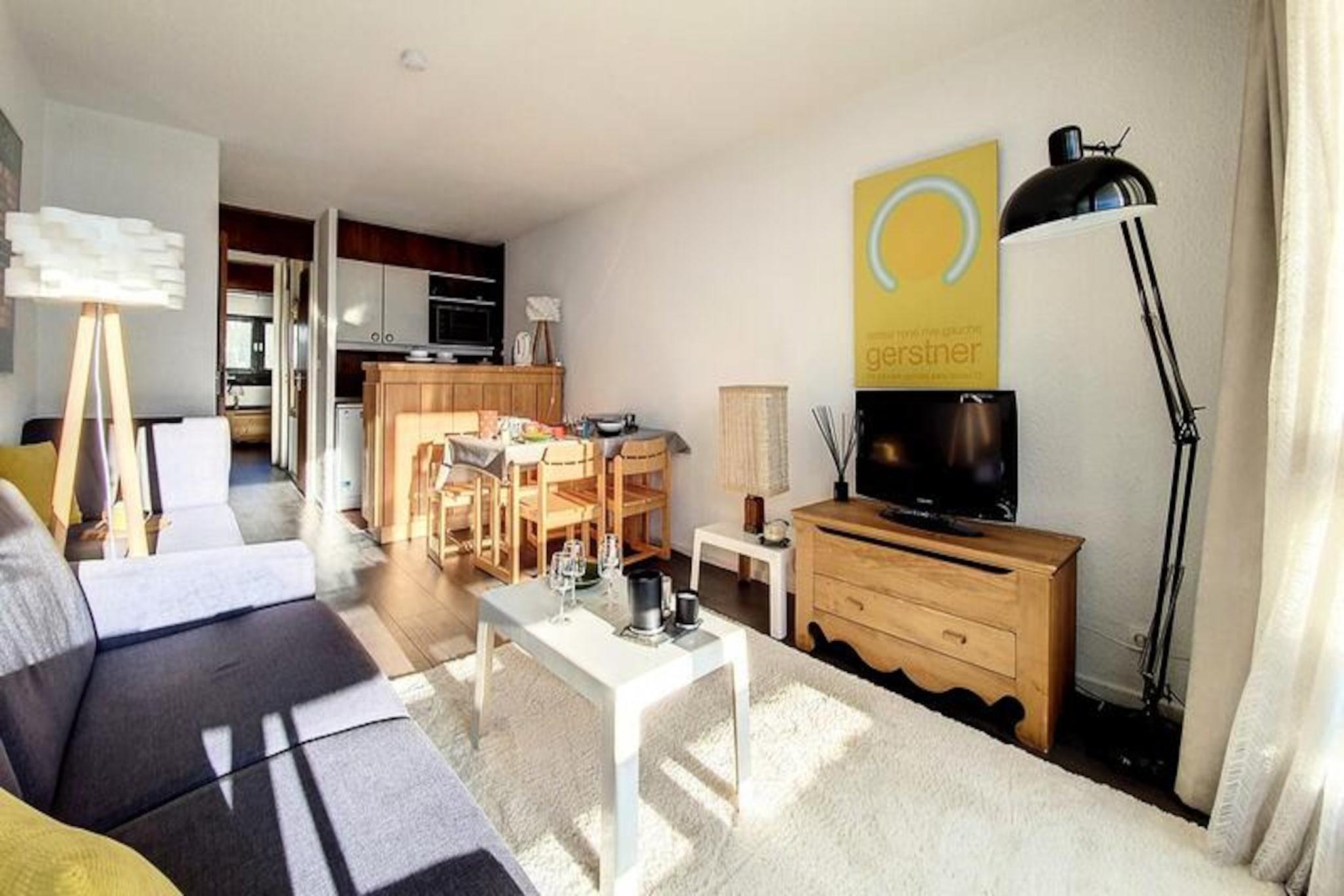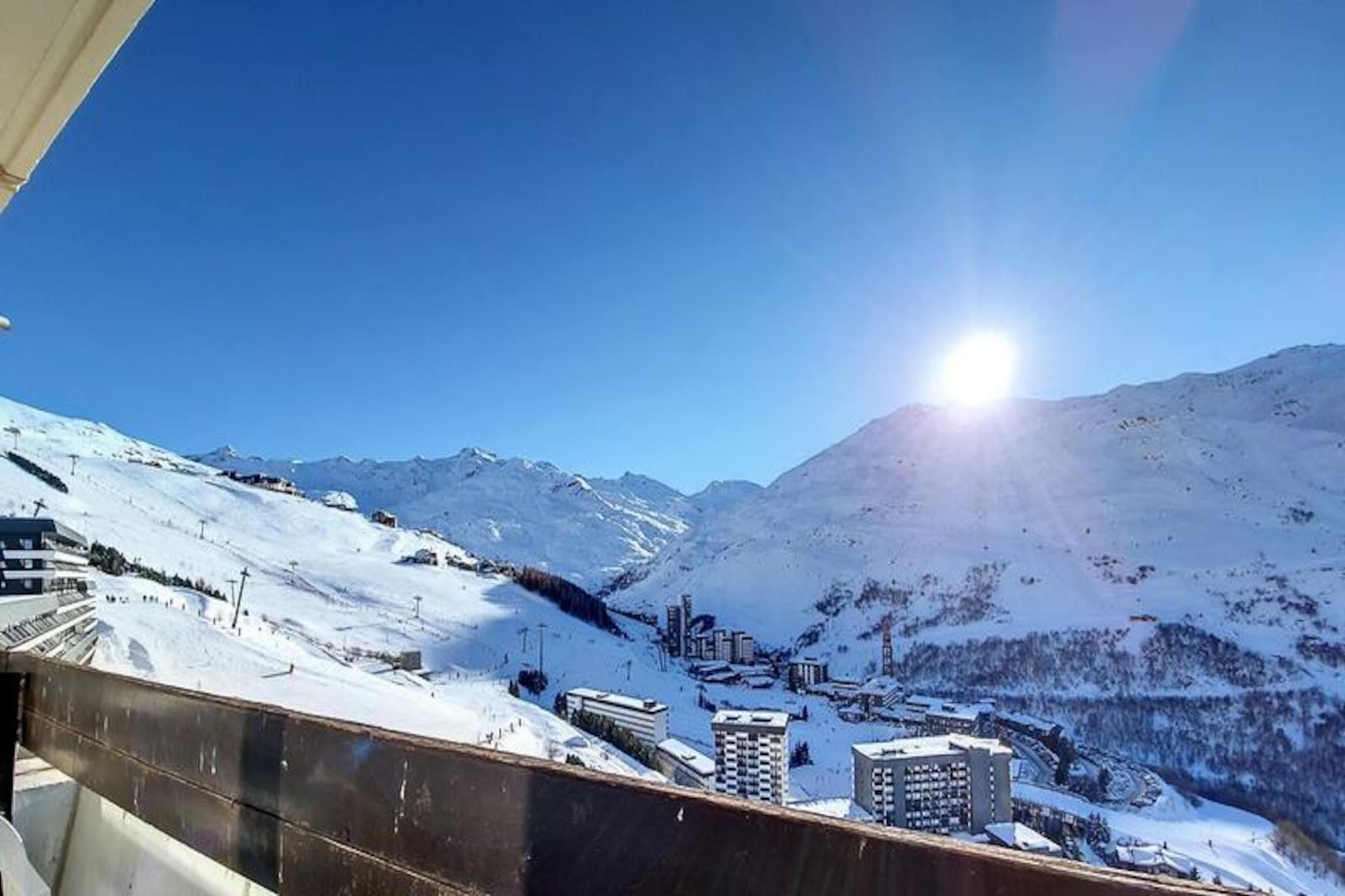 High above the vibrant Les Menuires resort, the Brelin building offers a unique alpine experience with breathtaking views of the Masse mountain range and the iconic Cime Caron peak. From its 14th-floor vantage point, this cozy two-room apartment invites you to immerse yourself in the beauty of the French Alps, with a south-facing balcony that bathes in sunlight throughout the day. Whether you're here for skiing or simply to relax, the panoramic scenery will leave you inspired. Conveniently connected to the La Croisette district via 24/7 public elevators, you’ll enjoy easy access to the heart of the resort. \n\nDesigned to accommodate up to six guests, the apartment features a comfortable living room with a sofa bed, a well-equipped kitchen with modern appliances, and a bedroom with two sets of bunk beds. The bathroom includes a bathtub for soothing post-ski relaxation, while the separate WC ensures added convenience. Ski lockers on the ground floor make gearing up for the slopes effortless, and the apartment comes equipped with duvets and blankets for cozy evenings. Please note, the upper bunk is not suitable for children under six years old, and pets are not allowed. Paid Wi-Fi access is available for your convenience. \n\nThe Brelin building itself houses shops and ski lift ticket offices within its arcade, and the Tougnette lift offers free parking right at the foot of the building. Whether you're a seasoned skier or a first-time visitor, the proximity to these amenities ensures a seamless holiday experience. Explore the slopes, enjoy après-ski activities, or simply soak in the alpine charm of Les Menuires. \n\nPerfect for families or small groups, this apartment combines practicality with stunning views, making it an ideal base for your mountain getaway. Let the serene beauty of the Alps and the convenience of the Brelin building create unforgettable memories during your stay.