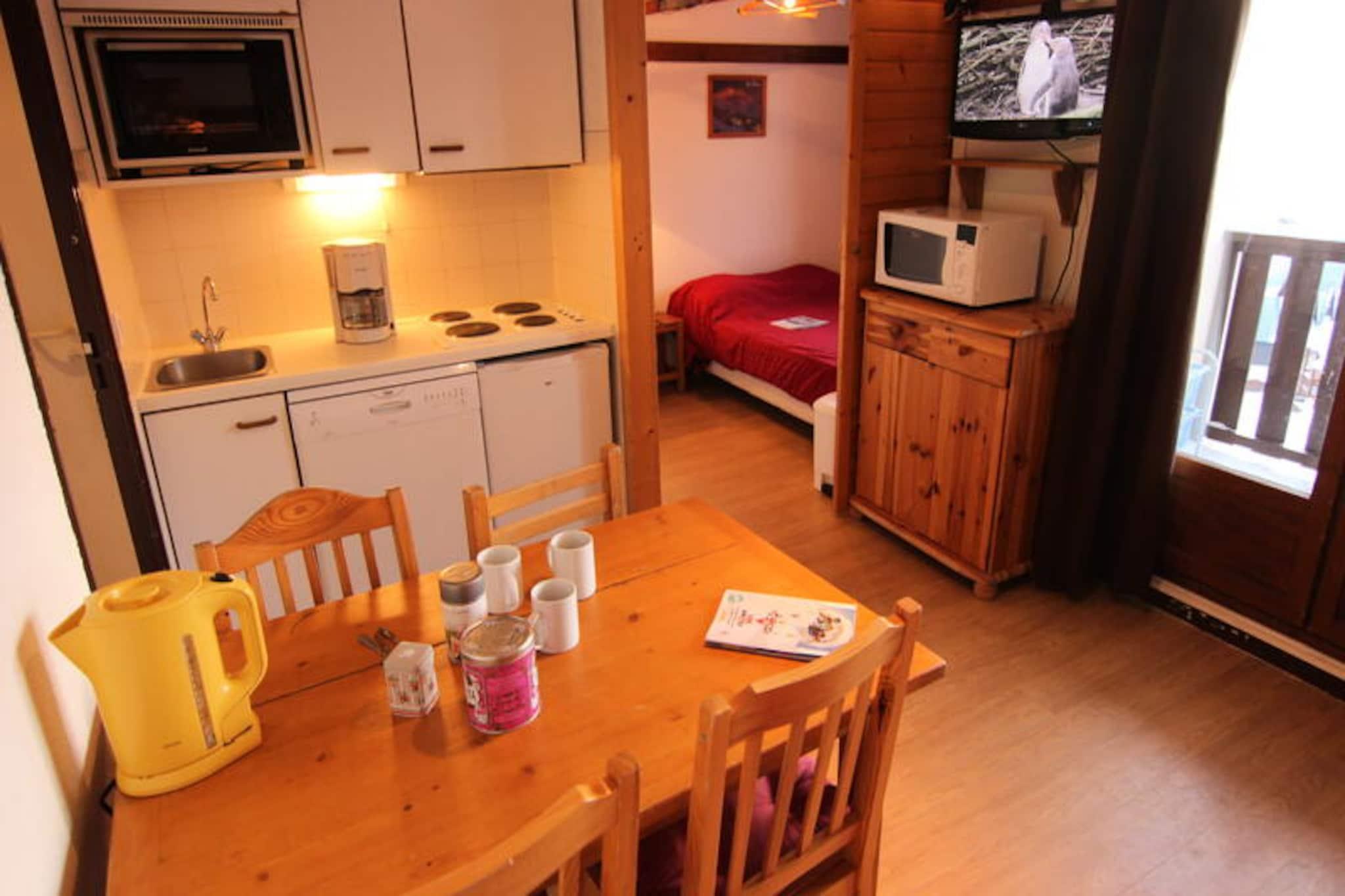 Perched at the entrance of the renowned Val Thorens resort in the tranquil Arolles district, this charming 2-room cabin apartment offers a cozy retreat for up to four guests. With its southwest-facing balcony, you’ll enjoy sunlit afternoons and breathtaking alpine views, perfect for unwinding after a day of adventure. The serene surroundings provide a peaceful escape while still being close to all the action of this world-famous ski destination. \n\nThe apartment features a thoughtfully designed layout, including a comfortable living room with a sofa and television, a fully equipped kitchenette with modern appliances such as an oven, microwave, stovetop, refrigerator, dishwasher, and extractor hood. The bedroom boasts a cozy double bed, while the cabin area offers snug bunk beds, making it ideal for families or small groups. A bathroom with a bathtub and sink, along with a separate toilet, ensures convenience and privacy during your stay. \n\nJust 200 meters away, you’ll find the Caron shopping center, offering a variety of local shops and the Val Thorens sports center, complete with a swimming pool and wellness area. For ski enthusiasts, the SKISET/GOITSCHEL SPORT GS4 rental shop is also within a short walk, and the residence provides direct access to the slopes, ensuring you can hit the pistes with ease. \n\nWhether you’re here to carve through the pristine snow, relax in the wellness center, or simply soak in the stunning mountain scenery, this apartment is your gateway to an unforgettable alpine getaway. Experience the perfect balance of comfort, convenience, and adventure in the heart of the French Alps.