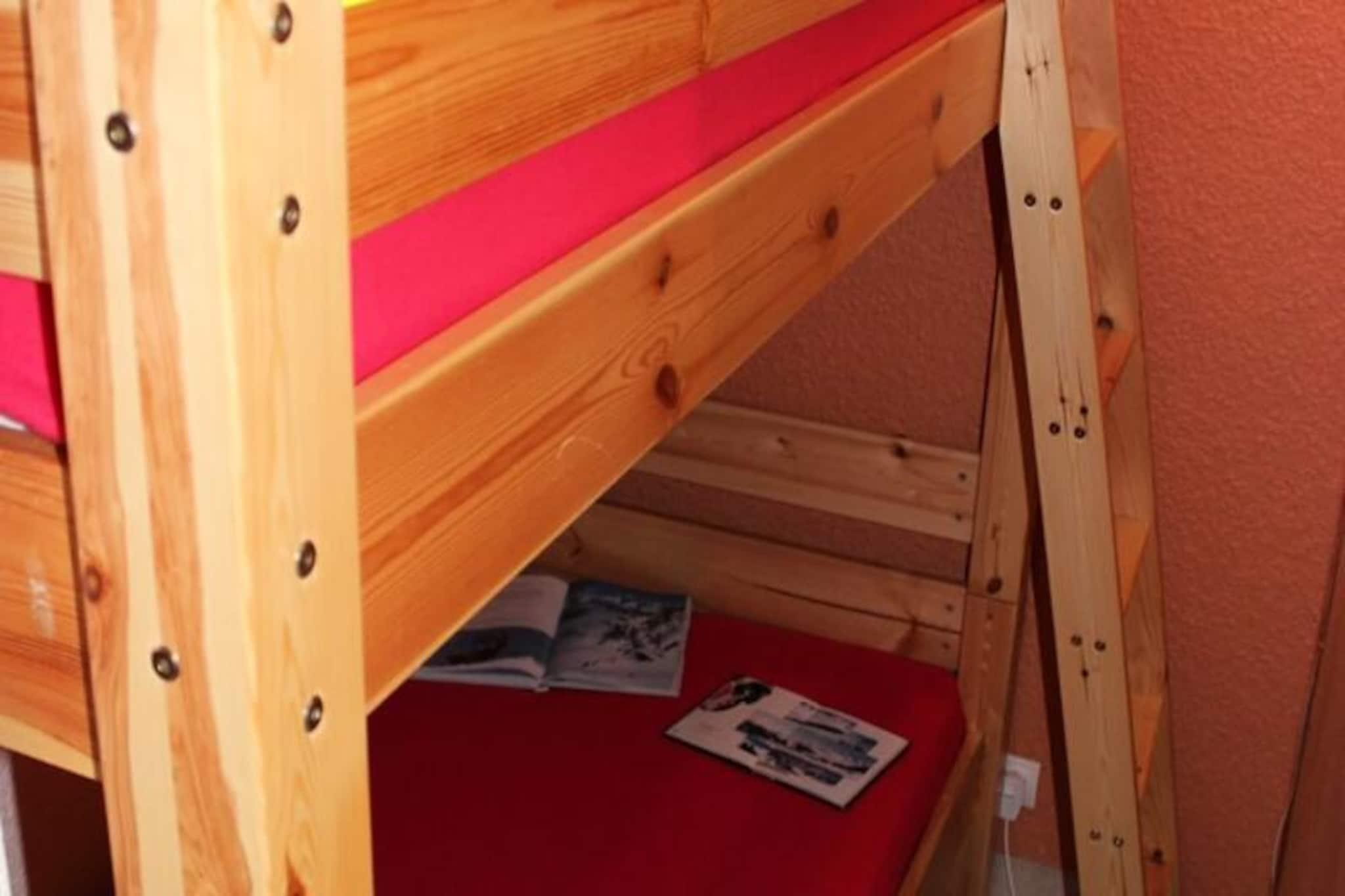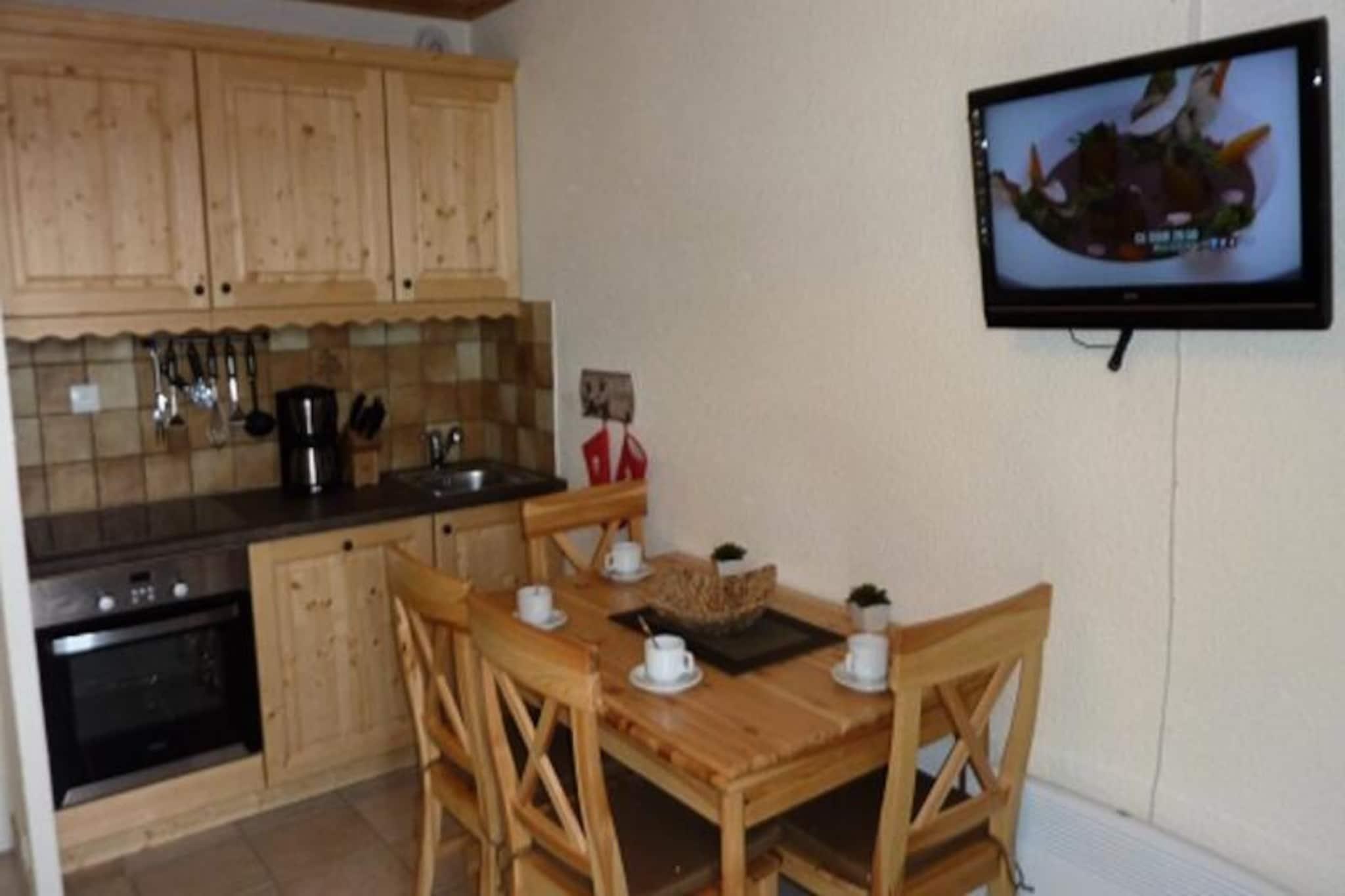 In the vibrant Caron district, this charming studio cabin offers a cozy alpine retreat just steps away from the slopes. Perfectly situated in the heart of the resort, you'll find yourself surrounded by the lively atmosphere of shops, restaurants, and essential services such as the tourist office, ski school, and even a dedicated children's toboggan area. Whether you're here for the thrill of skiing or the charm of mountain living, this location ensures convenience and excitement at every turn. \n\nThe 27m² studio is thoughtfully designed to accommodate up to four guests, making it ideal for couples or small families. The living area features a comfortable sofa bed that easily converts into a double bed, while the cabin offers bunk beds for additional sleeping arrangements. A well-equipped kitchenette includes a conventional oven, microwave, refrigerator, ceramic hob, and dishwasher, allowing you to prepare hearty meals after a day on the slopes. Relax in the cozy living room with a television and built-in DVD player, or step out onto the southwest-facing balcony to soak in the mountain views and crisp alpine air. The bathroom includes a bathtub and sink, with a separate toilet for added convenience. \n\nLocated just 100 meters from the Skiset rental store, gearing up for your ski adventures couldn't be easier. The slopes are directly across from the residence, offering unparalleled access to the pristine runs of the region. After an exhilarating day, explore the resort's vibrant nightlife or unwind with a warm drink at a nearby café. With its prime location and comfortable amenities, this studio cabin promises an unforgettable alpine getaway for all seasons.