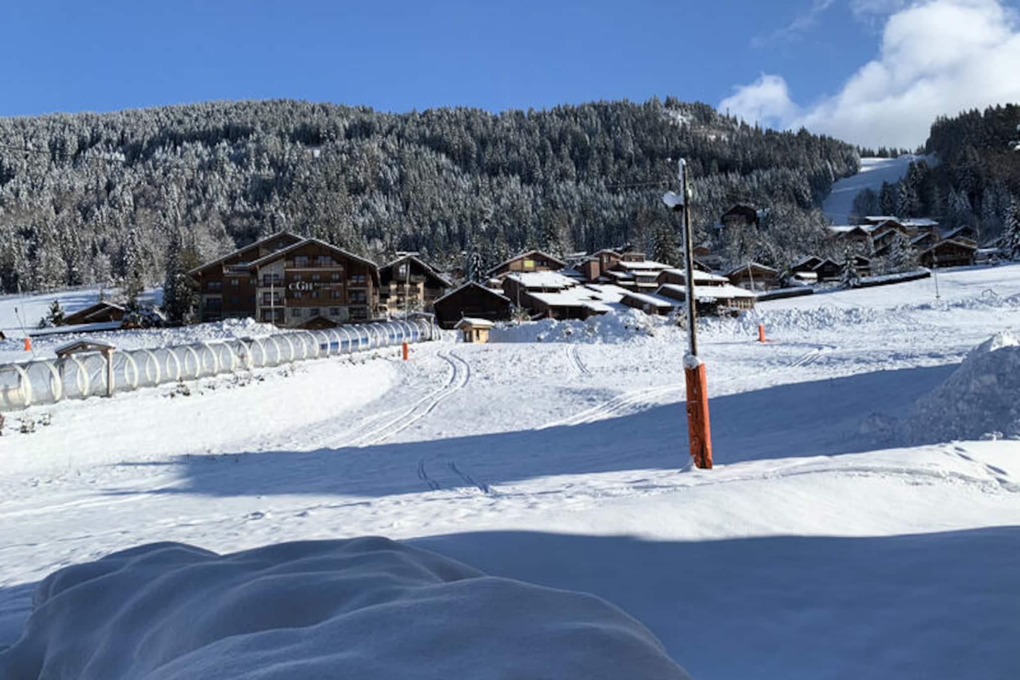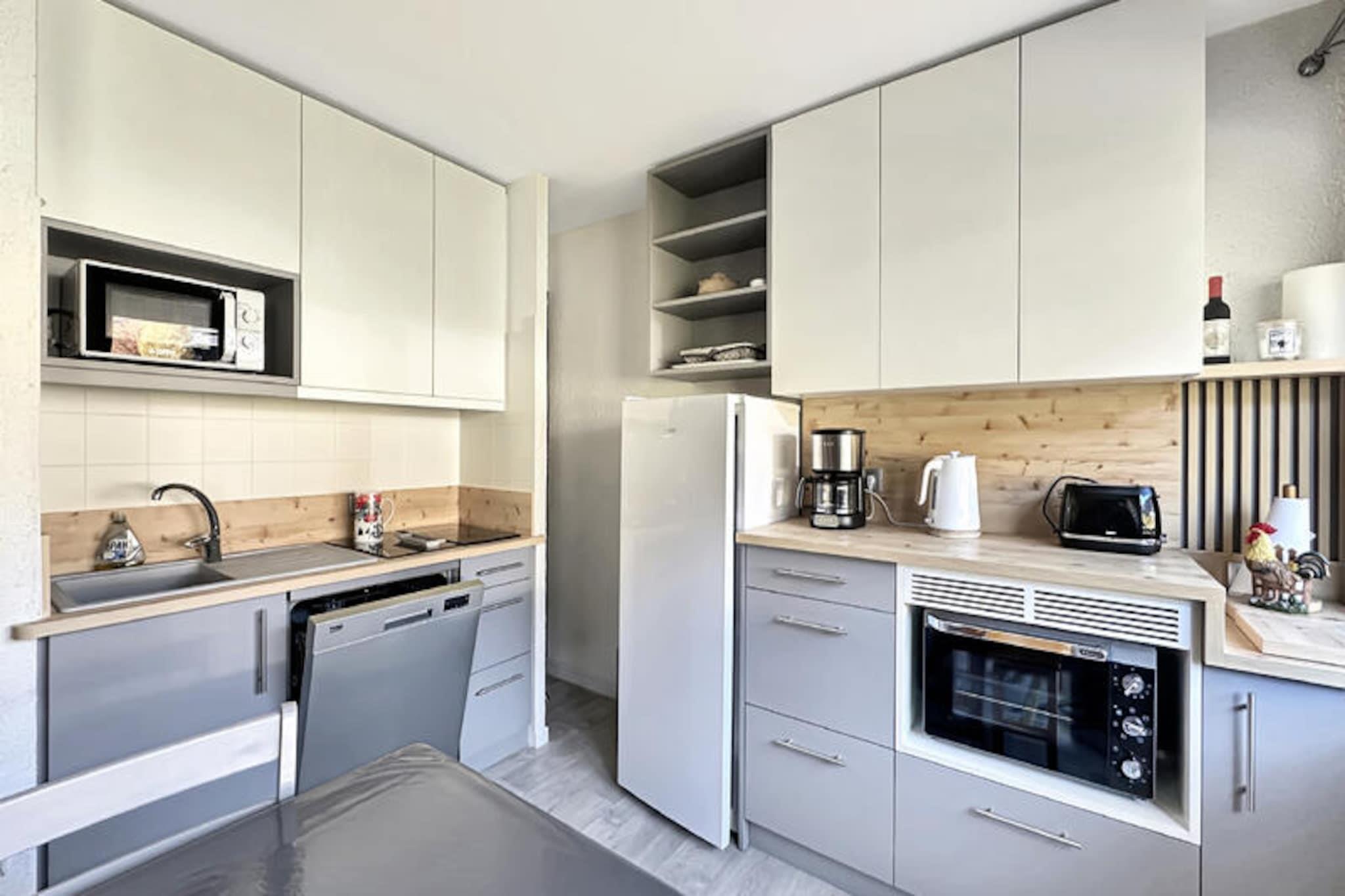 Spacious studio apartment with a sleeping alcove and a completely renovated kitchen, located in the "Le Thoral" residence. At the foot of the beginner slopes and 350 meters from the village center. On the first floor of the residence, with 34 m² of living space, it features two sleeping areas separated by a sliding door to accommodate 4/5 people: a sleeping alcove (2 bunk beds + 1 pull-out bed) and a living area (1 sofa bed), a fully equipped and newly renovated kitchen, a bathroom, and a separate toilet. Its east-facing balcony offers a beautiful view of the slopes. Ideally located next to the beginner slope, which doubles as a toboggan run in the evening. Sleeps: 4/5 people Alcove: 2 bunk beds + 1 pull-out bed Living room (TV): 1 sofa bed (140 cm) Kitchen: dishwasher, mini-oven, 2-burner ceramic hob, refrigerator, freezer, microwave Bathroom, separate WC Ski locker #22 (Ground floor, door at the back on the right) Additional services payable on site: Security deposit (refundable) EURO225.00 per booking