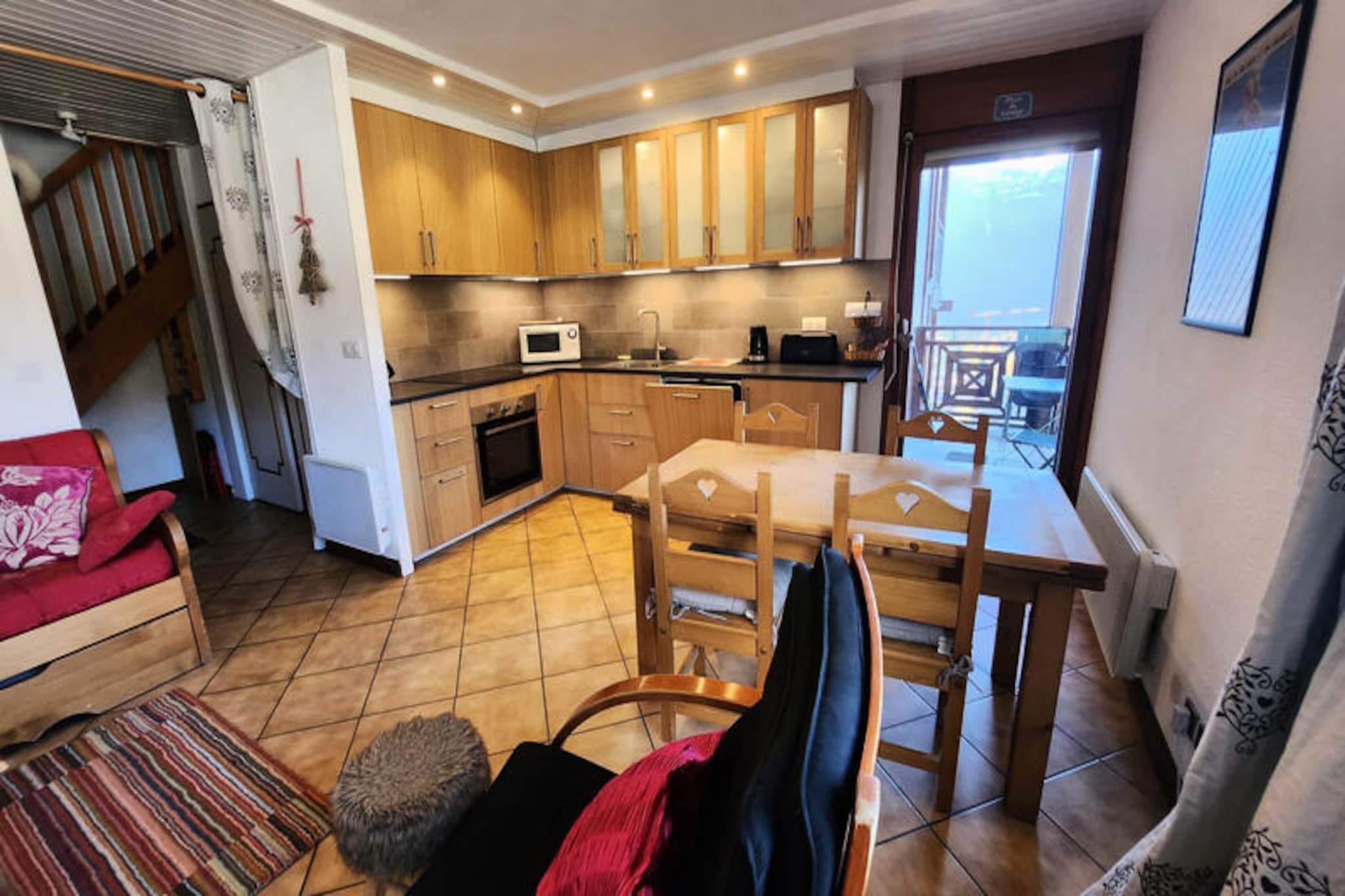 At the edge of a charming alpine village, this duplex apartment in the 'L'Escale Blanche' residence offers a cozy retreat for those seeking the perfect balance of comfort and adventure. With the Carroz gondola lift just a short stroll away, you’ll be perfectly positioned to explore the pristine slopes and trails of the region. The northwest-facing balcony invites you to unwind with views of the picturesque village below, capturing the essence of mountain living. Whether you’re planning a winter getaway or a summer escape, this property is your gateway to unforgettable alpine experiences. \n\nSpanning 53 square meters, the apartment comfortably accommodates up to eight guests across four sleeping areas. The layout includes a double bed in the first bedroom, two single beds in the second bedroom, two pull-out beds on the mezzanine, and a sofa bed in the living room. The kitchenette is fully equipped with an oven, microwave, dishwasher, electric hob, and refrigerator, making it easy to prepare meals after a day of exploration. A bathroom and separate toilet add convenience, while the outdoor parking space and ski locker ensure practicality for your stay. Wi-Fi is available throughout the apartment, keeping you connected even in this serene setting. \n\nLocated just 600 meters from the village center, you’ll find shops, restaurants, and local amenities within a five-minute walk. In winter, enjoy seamless access to the slopes, while summer brings opportunities for hiking, cycling, and discovering the natural beauty of the French Alps. The nearby Carroz gondola lift serves as your gateway to endless alpine adventures, making this residence an ideal choice for outdoor enthusiasts and families alike. \n\nWhether you’re here to carve through fresh powder or bask in the tranquility of the mountains, this apartment offers the perfect base for creating lasting memories in the heart of the Alps.