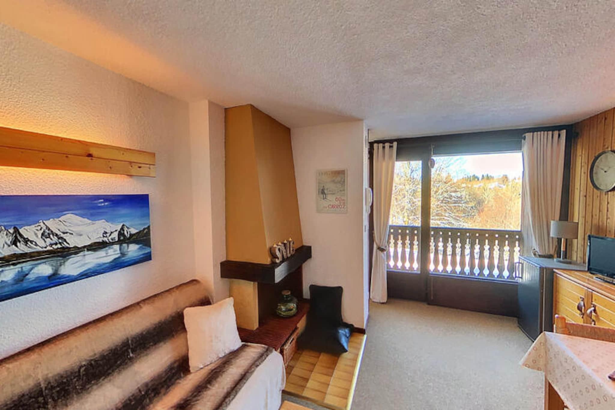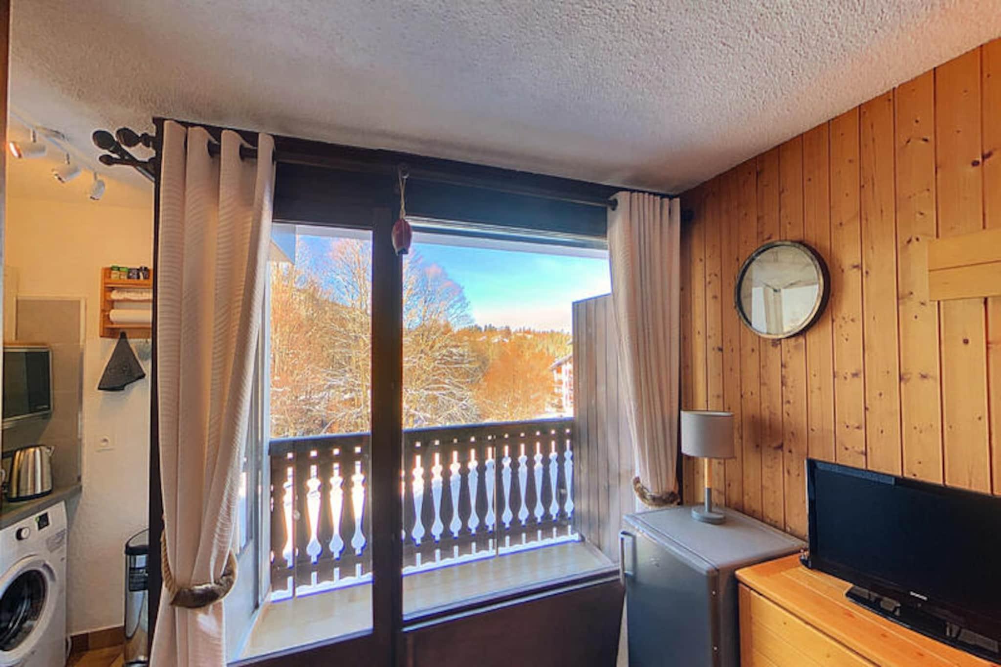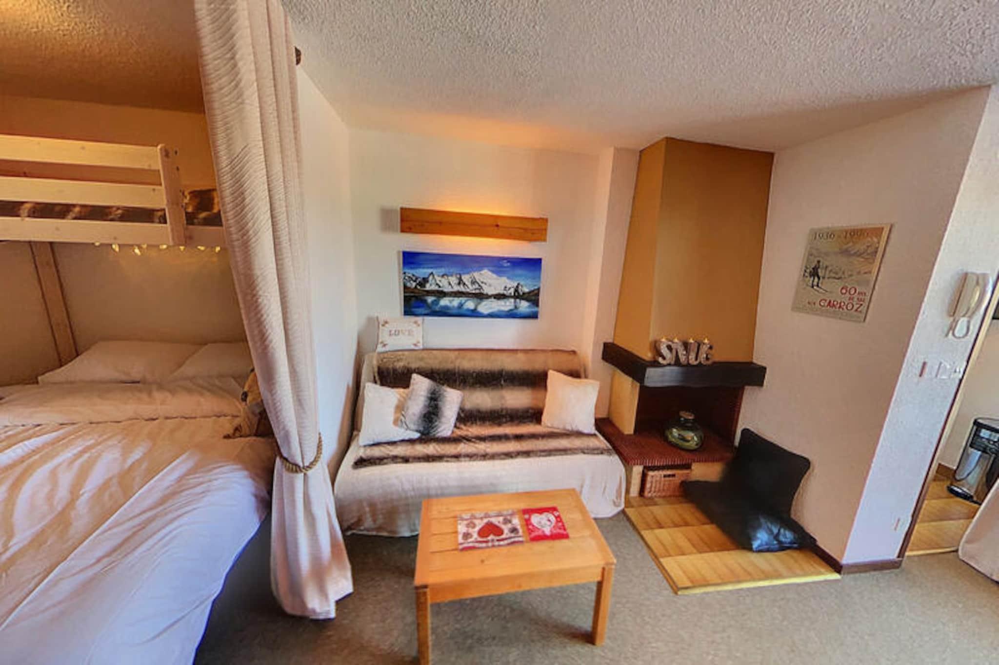 Amidst the serene charm of Les Carroz, this beautifully furnished studio apartment offers a cozy retreat just a short stroll from the village center. With its west-facing balcony, you can bask in the afternoon sun while enjoying views of the picturesque surroundings. Perfectly situated just 300 meters from the heart of the village and a mere 80 meters from the shuttle bus stop, this property ensures easy access to the slopes and local amenities, making it an ideal choice for skiers and mountain enthusiasts alike. The decorative fireplace adds a touch of alpine warmth, creating a welcoming atmosphere for your stay. \n\nDesigned to accommodate up to five guests, the studio features a smart layout with an entrance hall equipped with built-in wardrobes, a semi-enclosed sleeping alcove, and a living/dining area that seamlessly connects to the kitchenette. The alcove, separated by a curtain, provides privacy and includes a single bunk bed and two single beds side by side, while the living room offers a comfortable sofa bed. The kitchenette is fully equipped with modern appliances including an oven, refrigerator, ceramic hob, dishwasher, washing machine, and microwave, ensuring convenience for preparing meals after a day of adventure. \n\nLes Carroz is renowned for its vibrant village atmosphere and proximity to the Grand Massif ski area, offering endless opportunities for skiing, snowboarding, and hiking. The nearby shuttle bus stop makes it effortless to explore the slopes, while the village center boasts charming shops, restaurants, and après-ski options. Whether you’re visiting in winter or summer, the region’s natural beauty and outdoor activities promise unforgettable memories. \n\nChoose this delightful studio for its blend of comfort, convenience, and authentic alpine charm. It’s the perfect base for creating cherished moments in the French Alps.