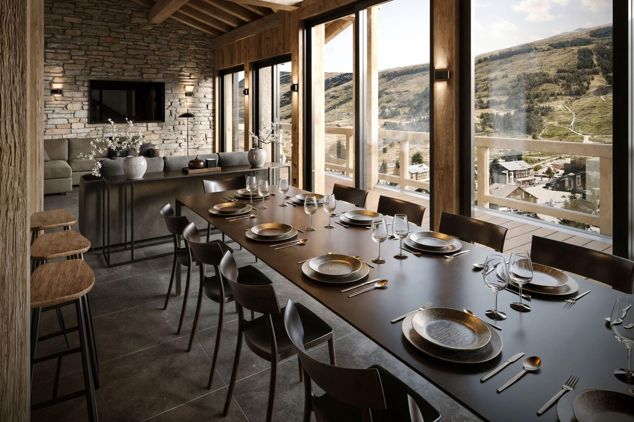 Living room(TV, dining table, fireplace, seating area), open kitchen(hob, toaster, coffee machine, oven, microwave, dishwasher, fridge-freezer), Bedroom with bathroom(double bed, TV, shower, toilet), Bedroom with bathroom(double bed, TV, shower, toilet), Bedroom with bathroom(double bed, TV, shower, toilet), Bedroom with bathroom(single bed, single bed, TV, shower, toilet), Bedroom with bathroom(bunk bed, bunk bed, bunk bed, TV, shower, toilet), ski storage(ski boot heaters), tumble dryer, hot tub, sauna, washing machine, terrace, parking
