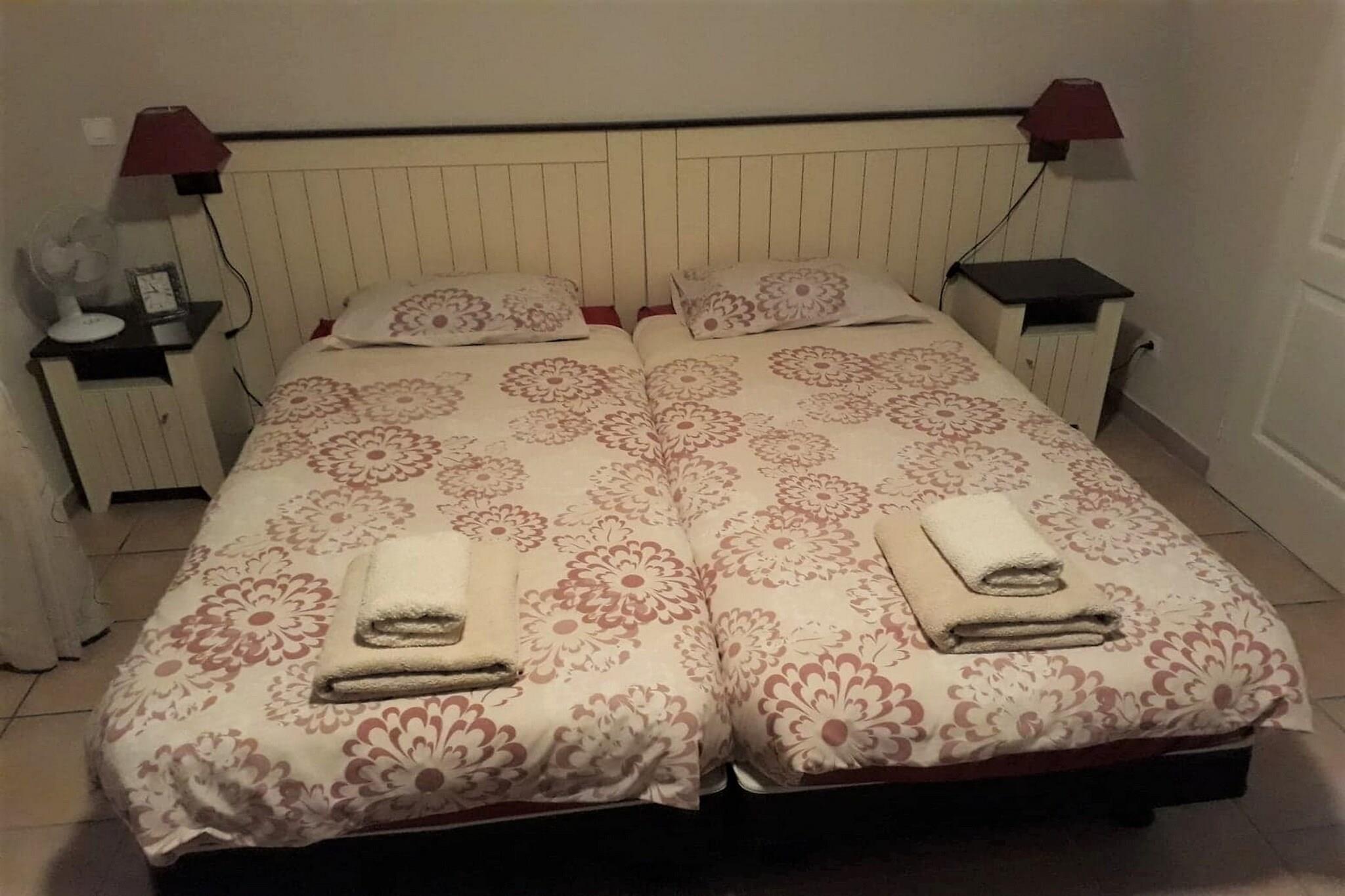 Ground floor: (Entrance, Large kitchen(hob, toaster, coffee machine, oven, combination microwave, dishwasher, fridge-freezer), Living/diningroom(TV(dutch television channels, international television channels), dining table, fireplace, seating area(6 persons), DVD player, radio), bedroom(double bed or 2 single beds(90 x 200 cm)), Bedroom with bathroom(double bed or 2 single beds(90 x 200 cm), bathtub with shower, washbasin, toilet), bathroom(shower, washbasin, toilet), washing room(washing machine)) microwave, balcony or terrace, balcony or terrace, garden(private, fenced), garden furniture(6 persons), sun loungers, BBQ, parasol, swimming pool(shared with other guests, heated, fenced, water alarm, including separate children’s swimming pool (depth 50cm), 20 x 9 m., opened from May upto and including Sep), boules court, table football, bicycles available, children's bed, ironing board