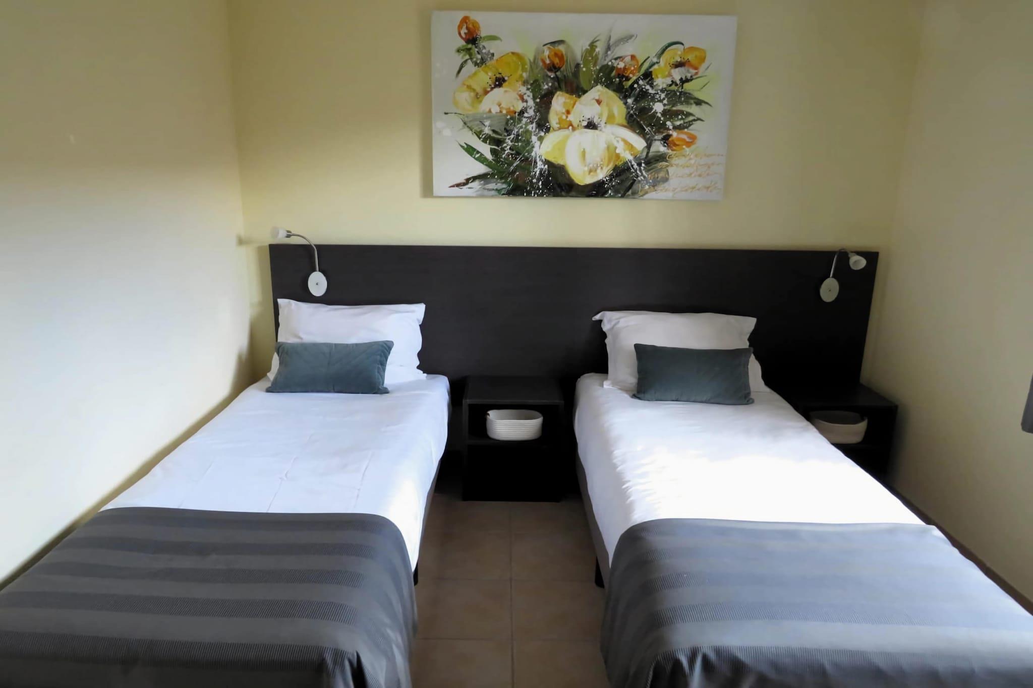 Ground floor: (open kitchen(boiling water tap, toaster, coffee machine, oven, microwave, dishwasher, fridge-freezer), pantry(washing machine), pantry, Living/diningroom(TV, dining table(6 persons), fireplace, seating area(6 persons)), bedroom(single bed(90 x 190 cm), single bed(90 x 190 cm)), bedroom(single bed(90 x 190 cm), single bed(90 x 190 cm)), bathroom(bathtub with shower, toilet), bathroom(shower), toilet(toilet)) Bubble bath(paid), infrared sauna(paid), washing machine, heating, terrace, garden, bicycle storage, garden furniture, BBQ, parking, swimming pool(shared with other guests, including separate children’s swimming pool (depth 50cm)), boules court, table tennis table, bicycles available(paid)