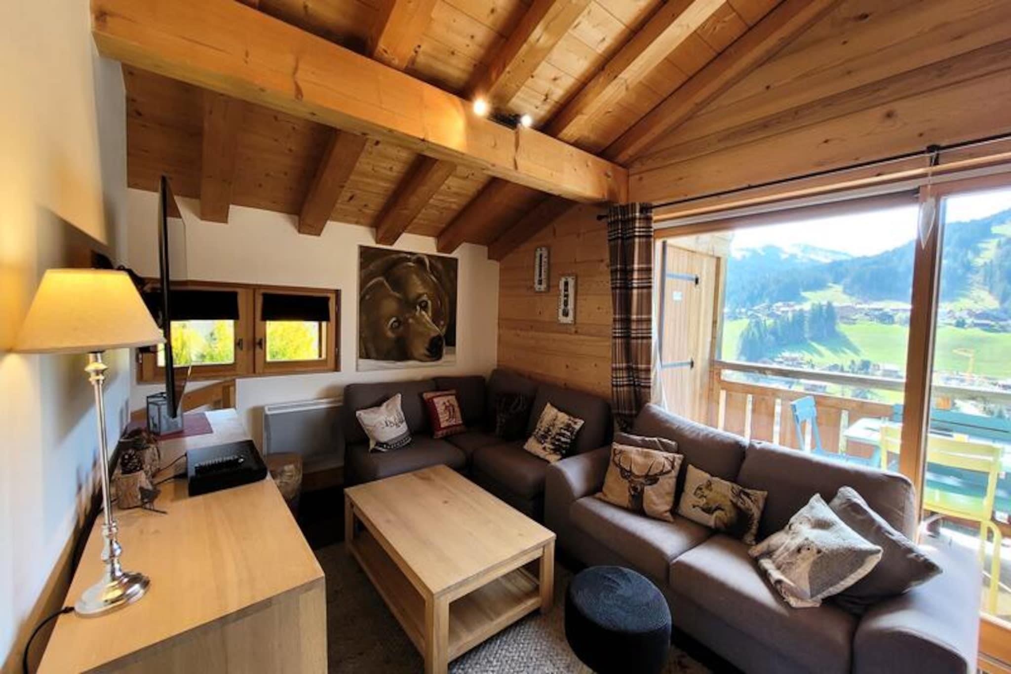 High above the charming village of Les Gets, this semi-detached chalet offers a serene mountain retreat with breathtaking panoramic views of the surrounding peaks and ski slopes. Bathed in sunlight thanks to its south-facing position, the property invites guests to immerse themselves in the beauty of the French Alps, whether blanketed in snow during winter or lush and green in summer. The quiet location ensures peace and privacy, while still being conveniently close to the village center and essential amenities. Just 100 meters from a shuttle stop, exploring the area couldn’t be easier. \n\nInside, the chalet is a harmonious blend of comfort and style. The cozy living room, complete with a crackling fireplace, sets the tone for relaxing evenings after a day of outdoor adventures. The open-plan kitchen is fully equipped, making it perfect for preparing hearty meals to share with loved ones. With four thoughtfully designed bedrooms, the chalet comfortably accommodates up to six guests, providing ample storage and balcony access for moments of quiet reflection. Modern conveniences such as Wi-Fi, a television, and a fondue set ensure a seamless stay, while heated towel rails and plush linens add a touch of luxury. \n\nLes Gets offers year-round activities for every taste. In winter, the nearby Chavannes ski area promises thrilling descents and scenic trails, while summer transforms the region into a haven for mountain biking and hiking enthusiasts. The village itself is brimming with charm, featuring local shops, restaurants, and cultural events that celebrate the alpine lifestyle. Whether you’re seeking adrenaline-filled days or tranquil evenings under the stars, this chalet is your gateway to unforgettable memories. \n\nPerfect for families or groups of friends, this property combines comfort, convenience, and natural beauty, making it an ideal choice for your next alpine escape.